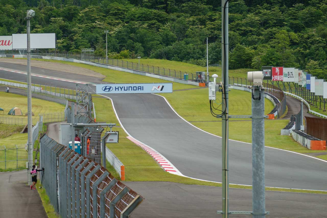 そして、ホームストレートの下をトンネルで潜ると、左側に1~2コーナーのイン側に行く道があるのですが、これまだかなりの急な上り坂。ホント、今回の参戦で改めて感じましたが、富士スピードウェイって本当に起伏が激しい。なので、体力的なことを考えると、この坂を上手く攻略して撮影ポイントを回っているというのも大事な気がします。