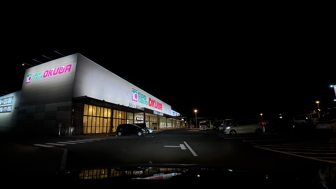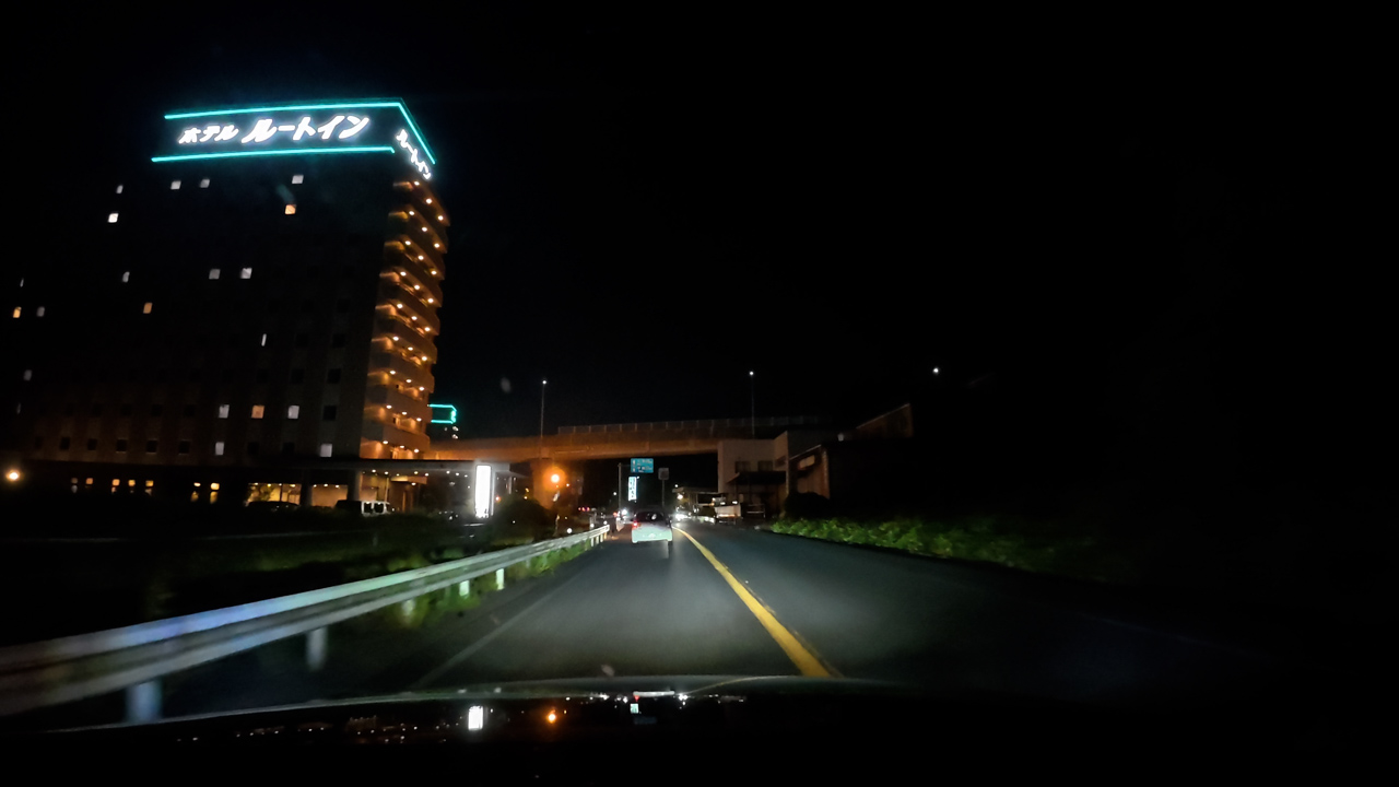 途中スーパーに寄った分、15分弱ほどロスはしましたが、それでも19:37にはルートイン亀山インターに到着。駐車場は相変わらずホテルの両サイドに駐めるのは無理だったので、前回と同じく、改装へ移転中のコンビニの前に駐めました。