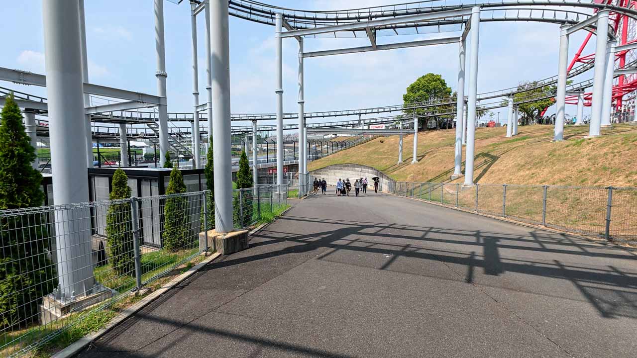 とはいえ、逆バンクトンネルの近くまでやってきてもあるはずの隊列が見えない。以前は、この逆バンクトンネルから観覧車の下を通って最終コーナー方向に伸びていたんだけどな…。