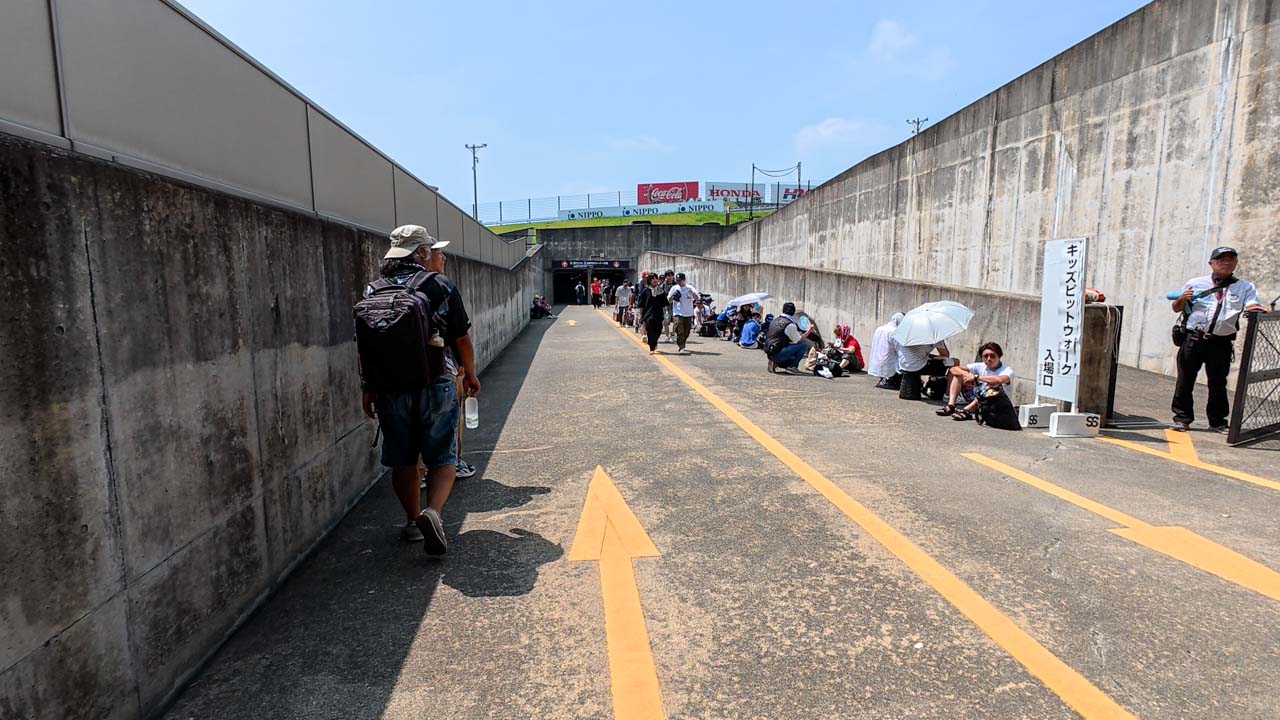 で、無事にPW隊列に並べたのが11:34。この時点でPW開始45分前ですが、むしろこれぐらいの位置で済んでいることがある意味奇跡でした。まあ、普通の人はパドックパス以上で入場していて、PWパスで入場する人の方が少ないだろうからな。そして、何よりトンネルの中で待機するというのが何ともラッキーでした。