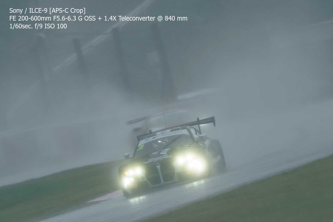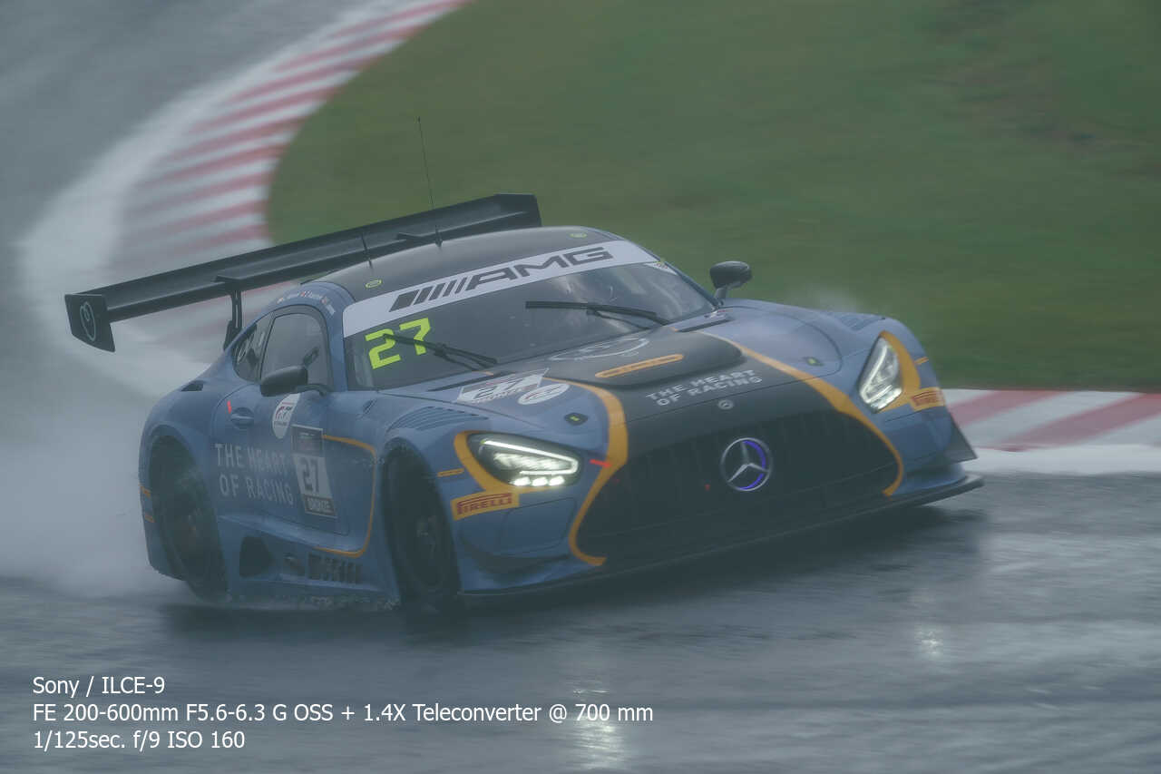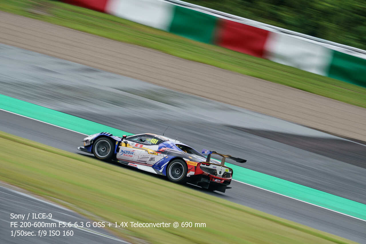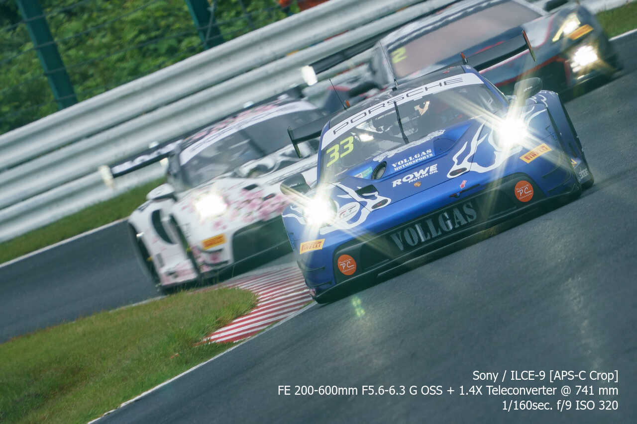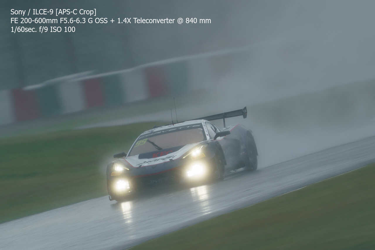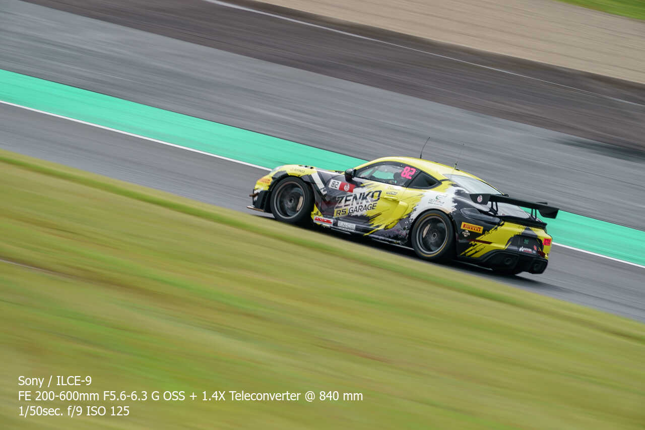 まあ、この辺りは定番のショットなので、ウェットコンディションでそこまで車速早くないし、慣れている構図なので、はじめからクロップ使ってガッツリ寄りつつ、シャッター速度も1/60sまで攻めました。それでも、GT3車両はこれぐらいで狙えるんだよな…。GT500とかになると、そもそも追いかけるのも大変になるけど。