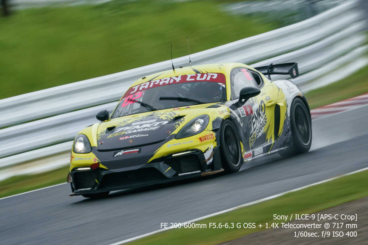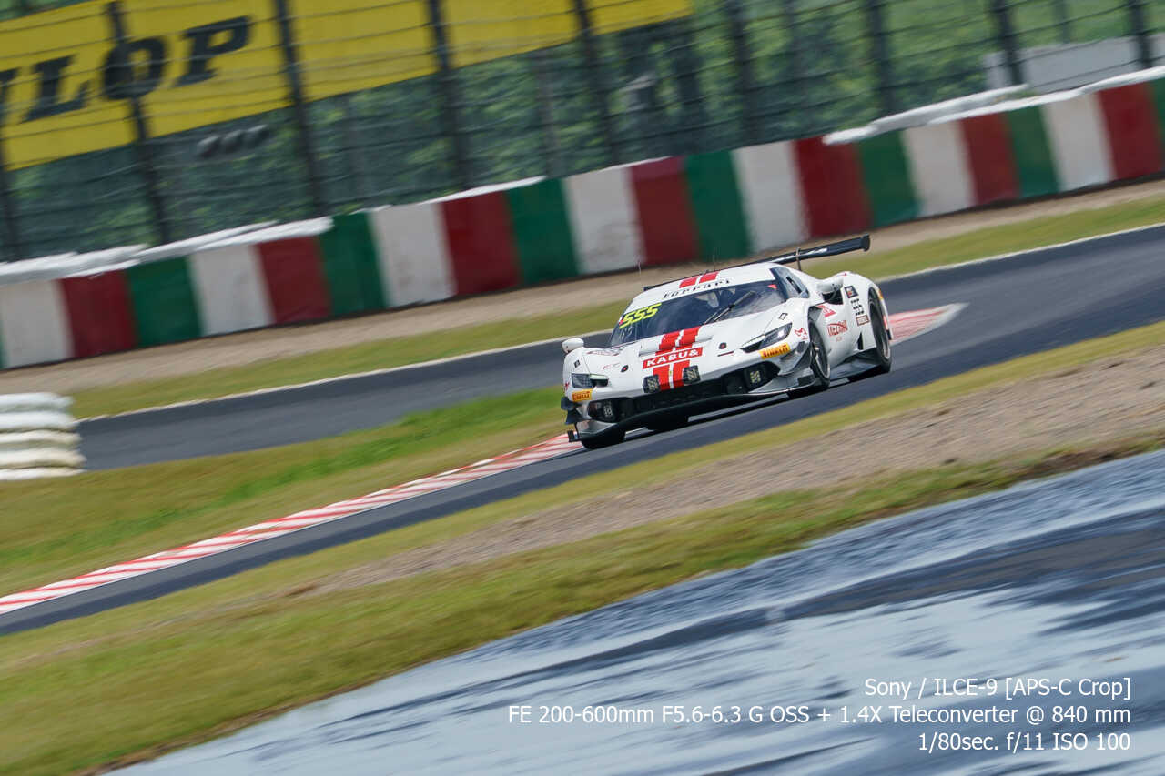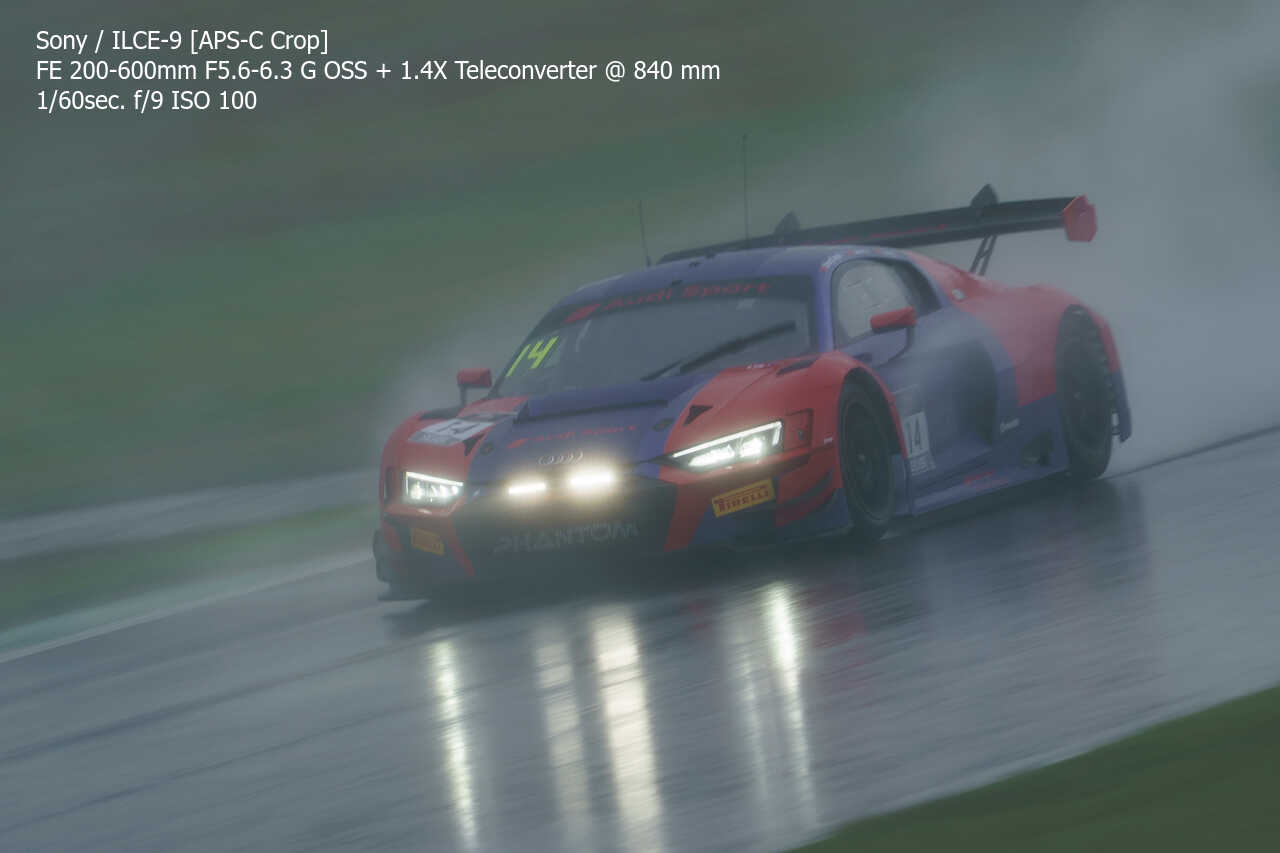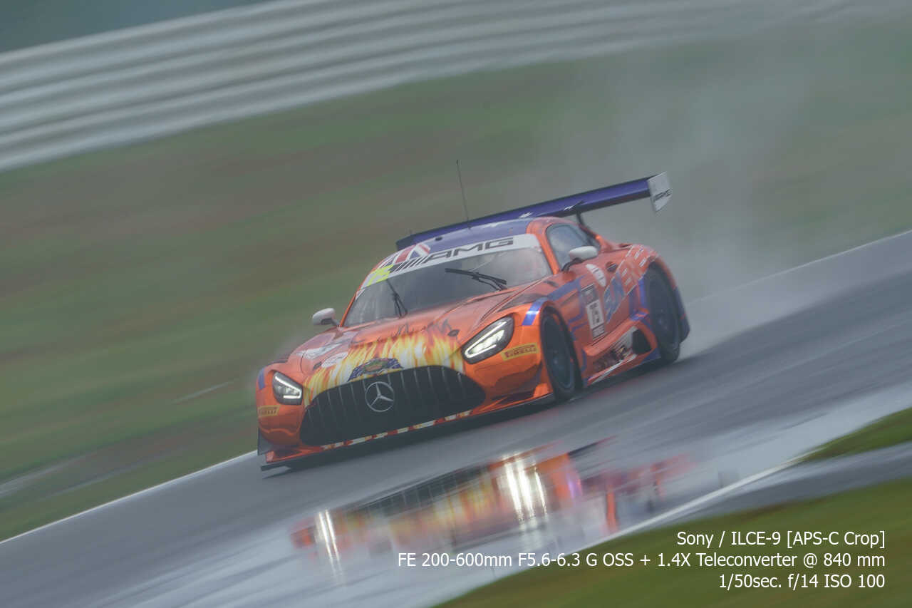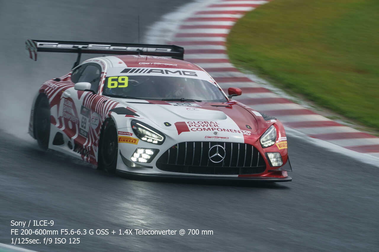まあ、この辺りは定番のショットなので、ウェットコンディションでそこまで車速早くないし、慣れている構図なので、はじめからクロップ使ってガッツリ寄りつつ、シャッター速度も1/60sまで攻めました。それでも、GT3車両はこれぐらいで狙えるんだよな…。GT500とかになると、そもそも追いかけるのも大変になるけど。