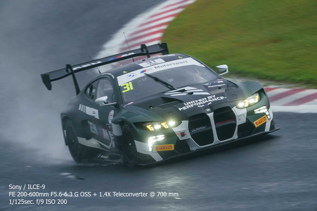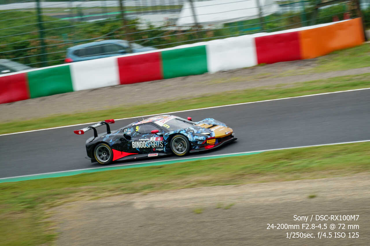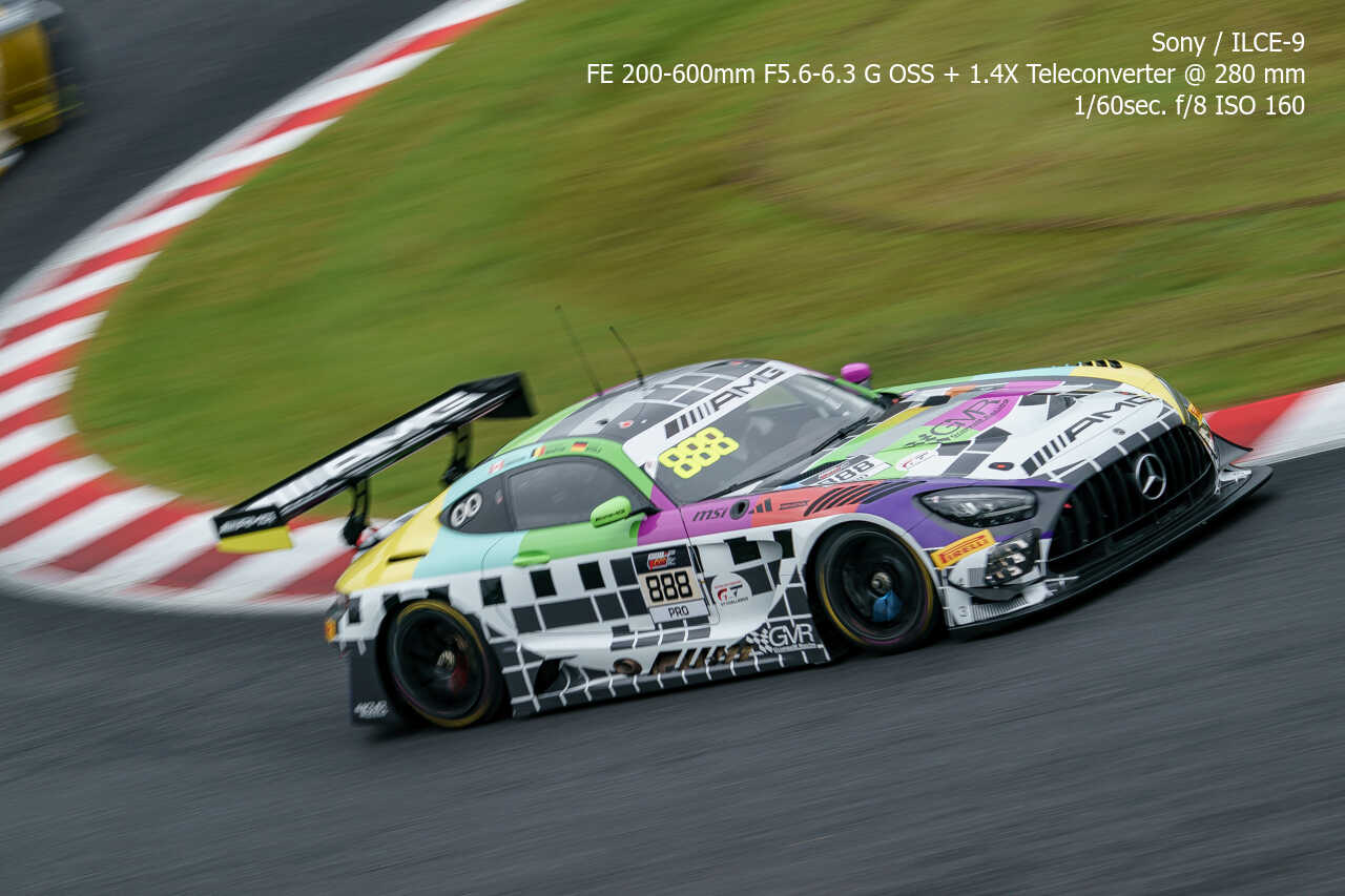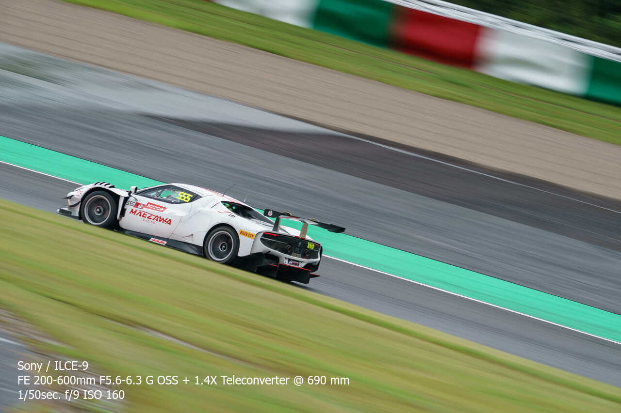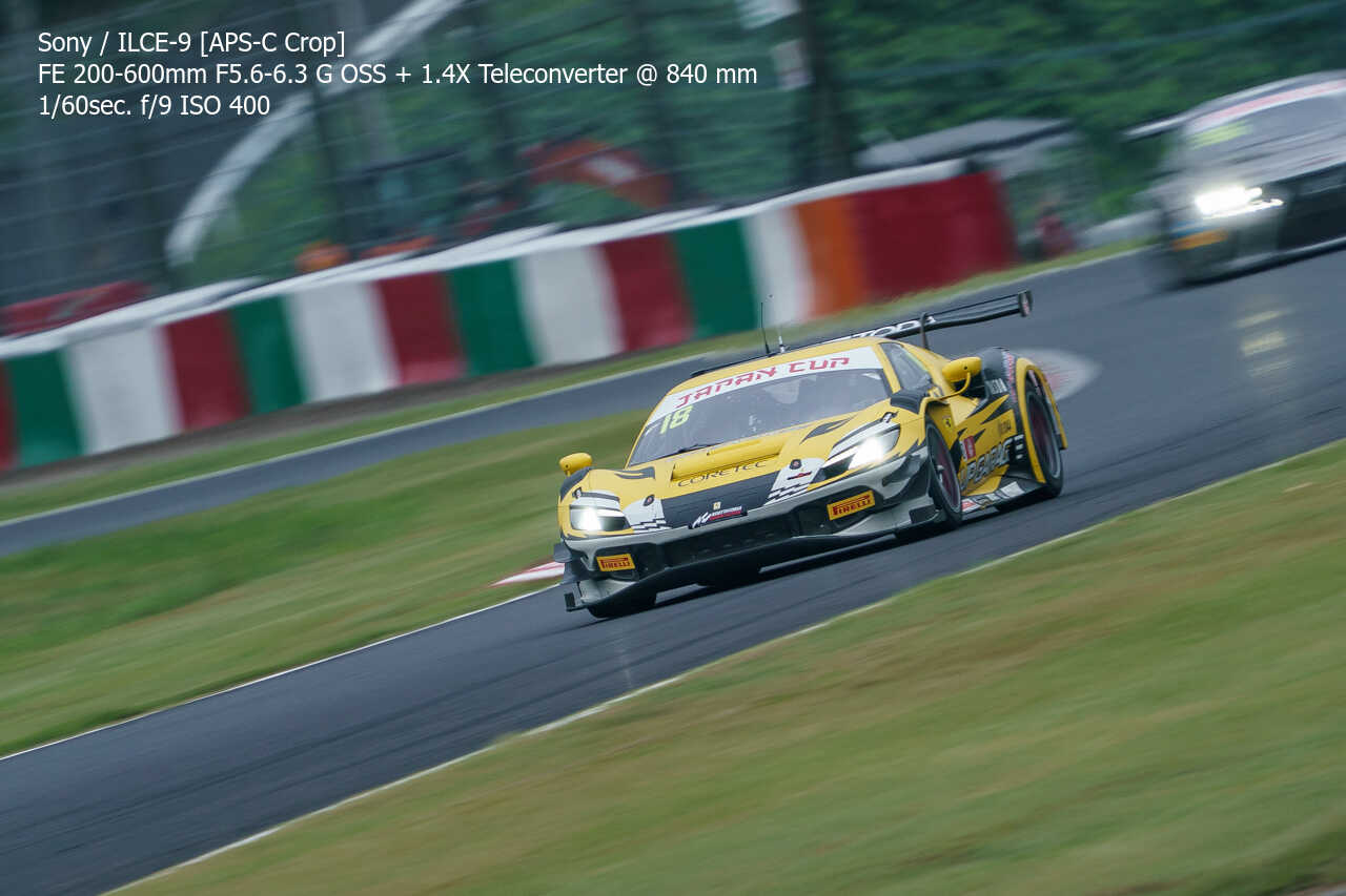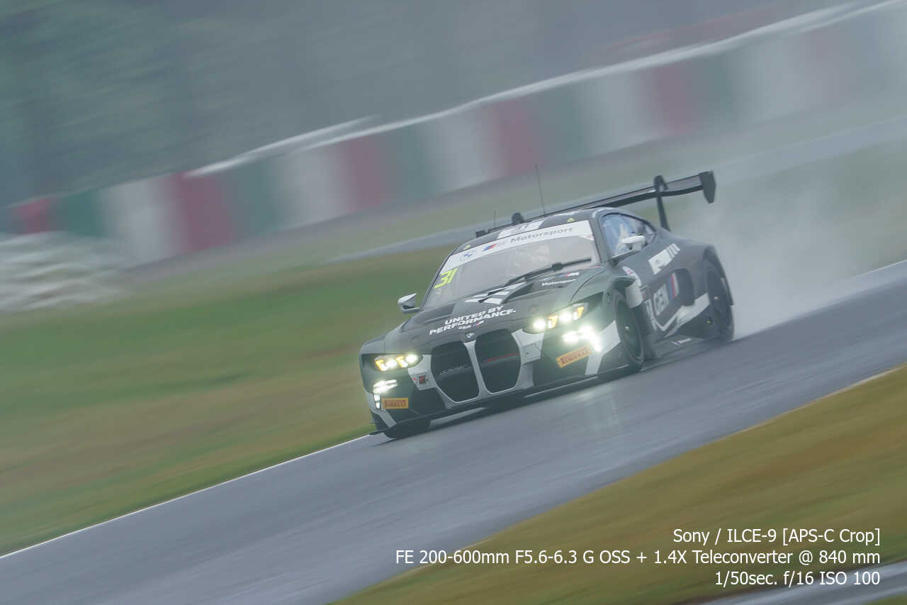 まあ、この辺りは定番のショットなので、ウェットコンディションでそこまで車速早くないし、慣れている構図なので、はじめからクロップ使ってガッツリ寄りつつ、シャッター速度も1/60sまで攻めました。それでも、GT3車両はこれぐらいで狙えるんだよな…。GT500とかになると、そもそも追いかけるのも大変になるけど。