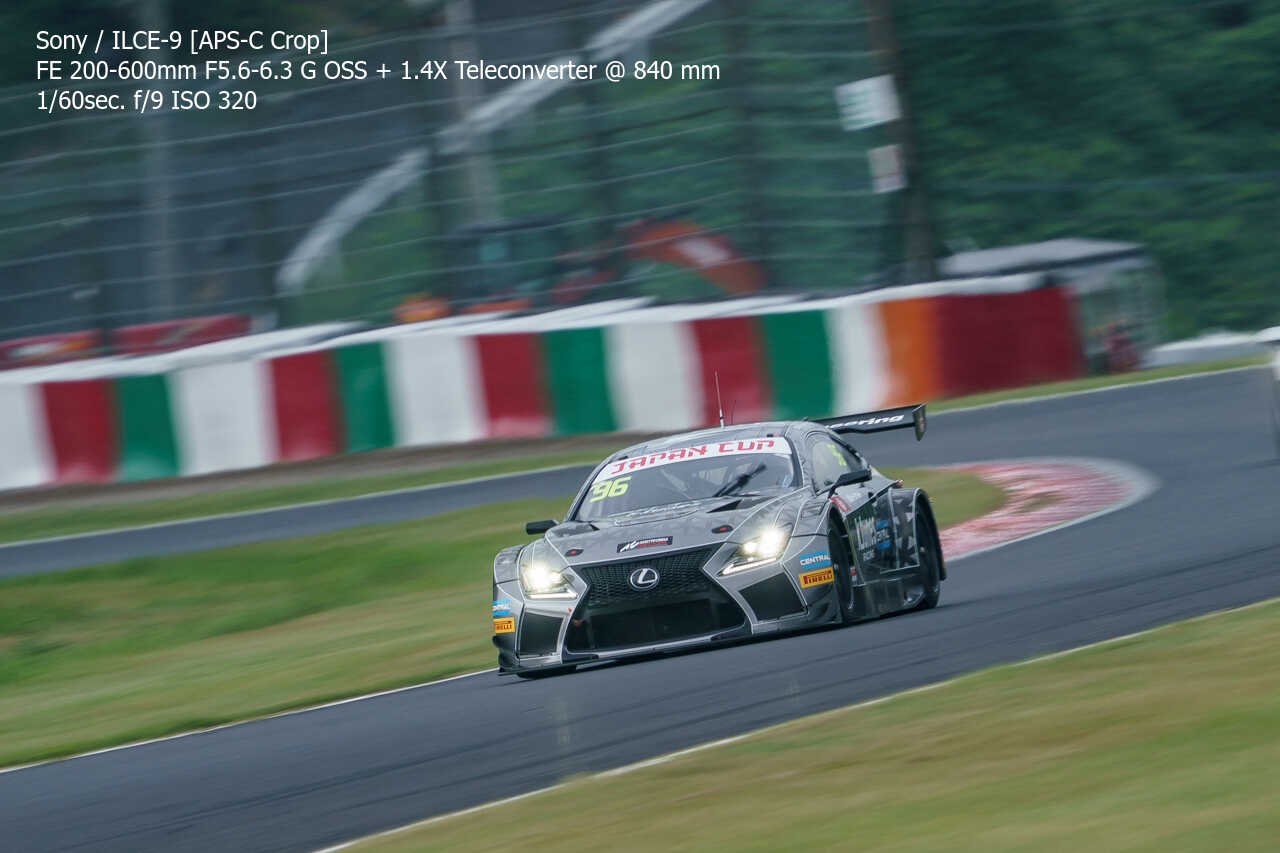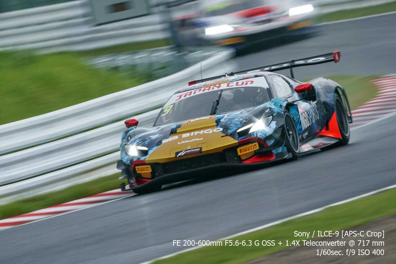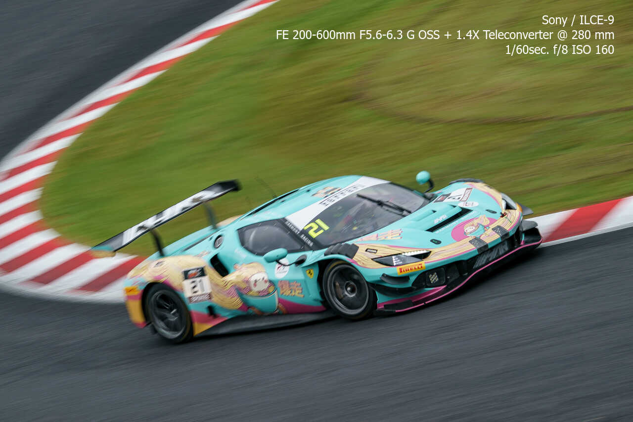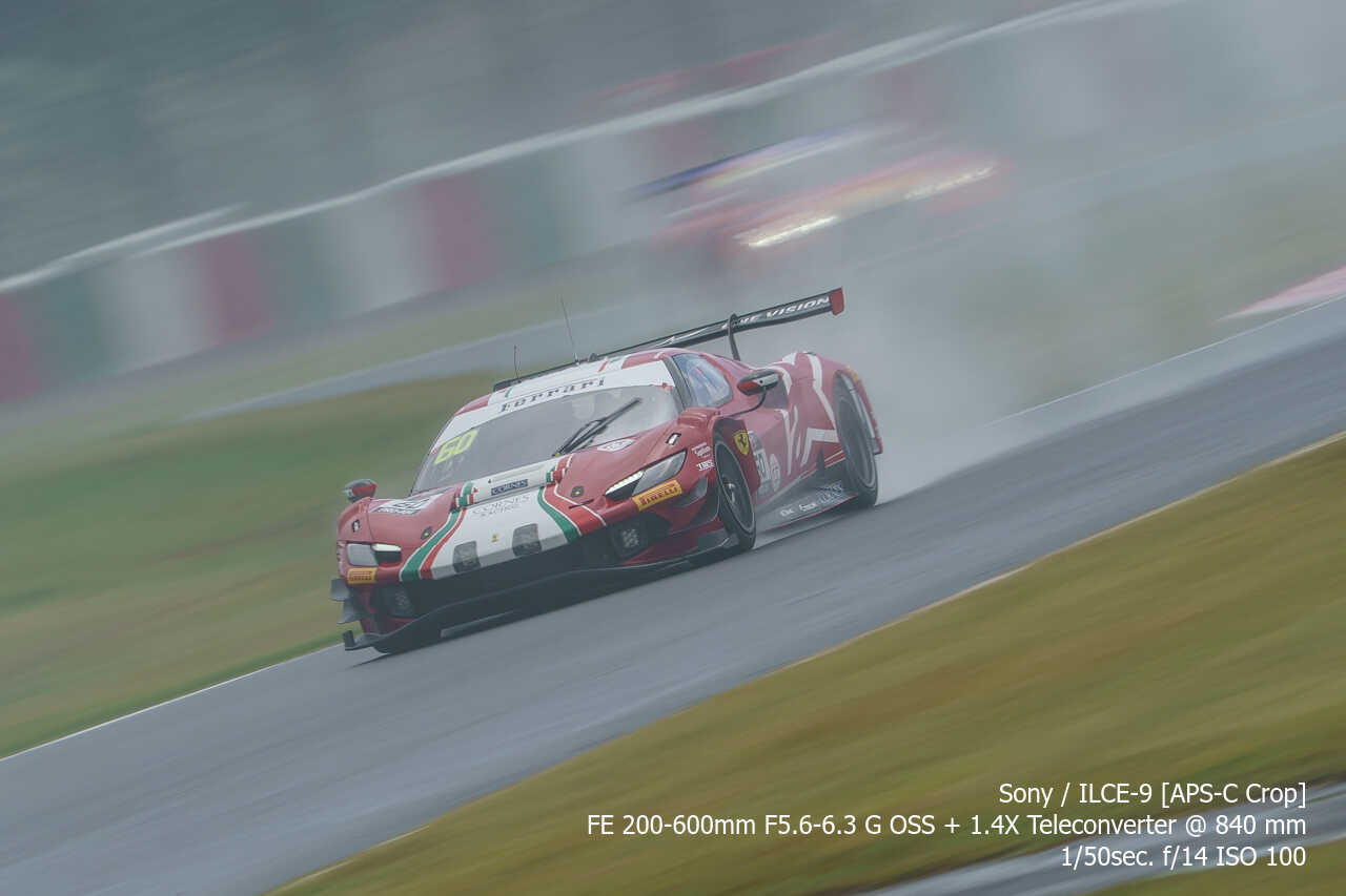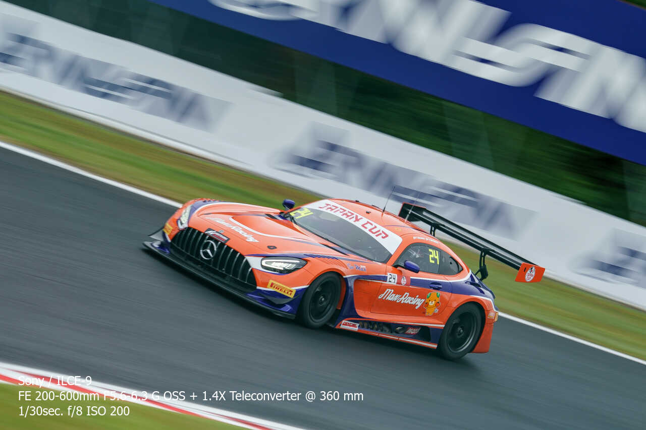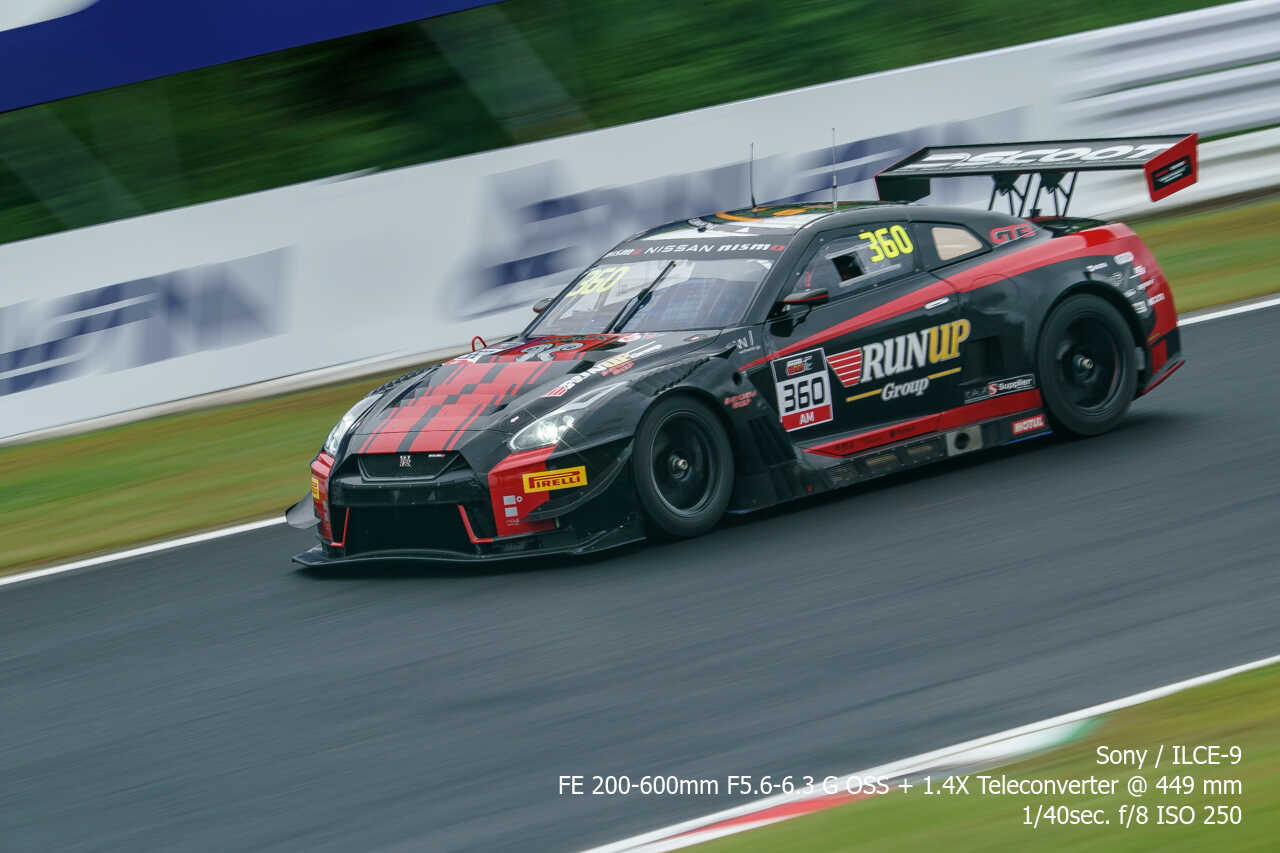 まあ、この辺りは定番のショットなので、ウェットコンディションでそこまで車速早くないし、慣れている構図なので、はじめからクロップ使ってガッツリ寄りつつ、シャッター速度も1/60sまで攻めました。それでも、GT3車両はこれぐらいで狙えるんだよな…。GT500とかになると、そもそも追いかけるのも大変になるけど。