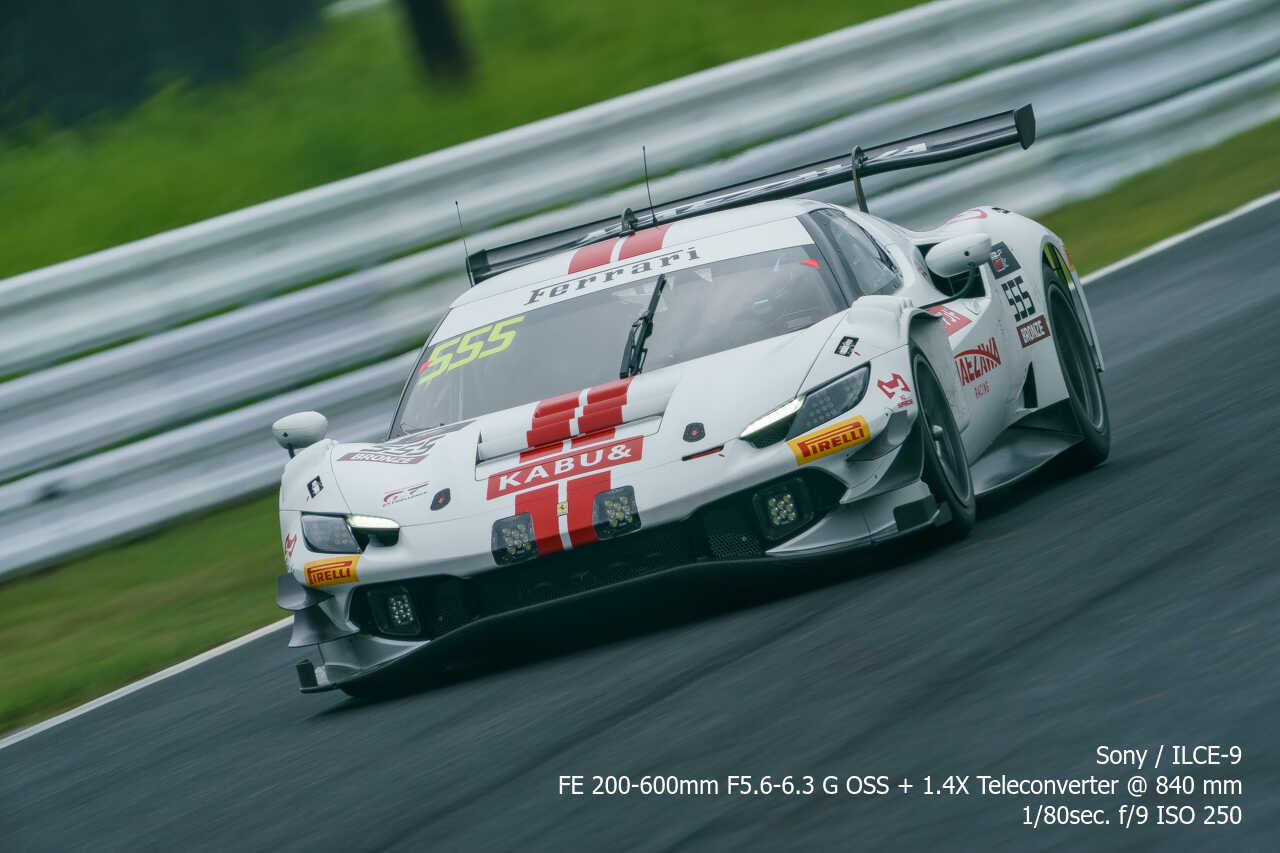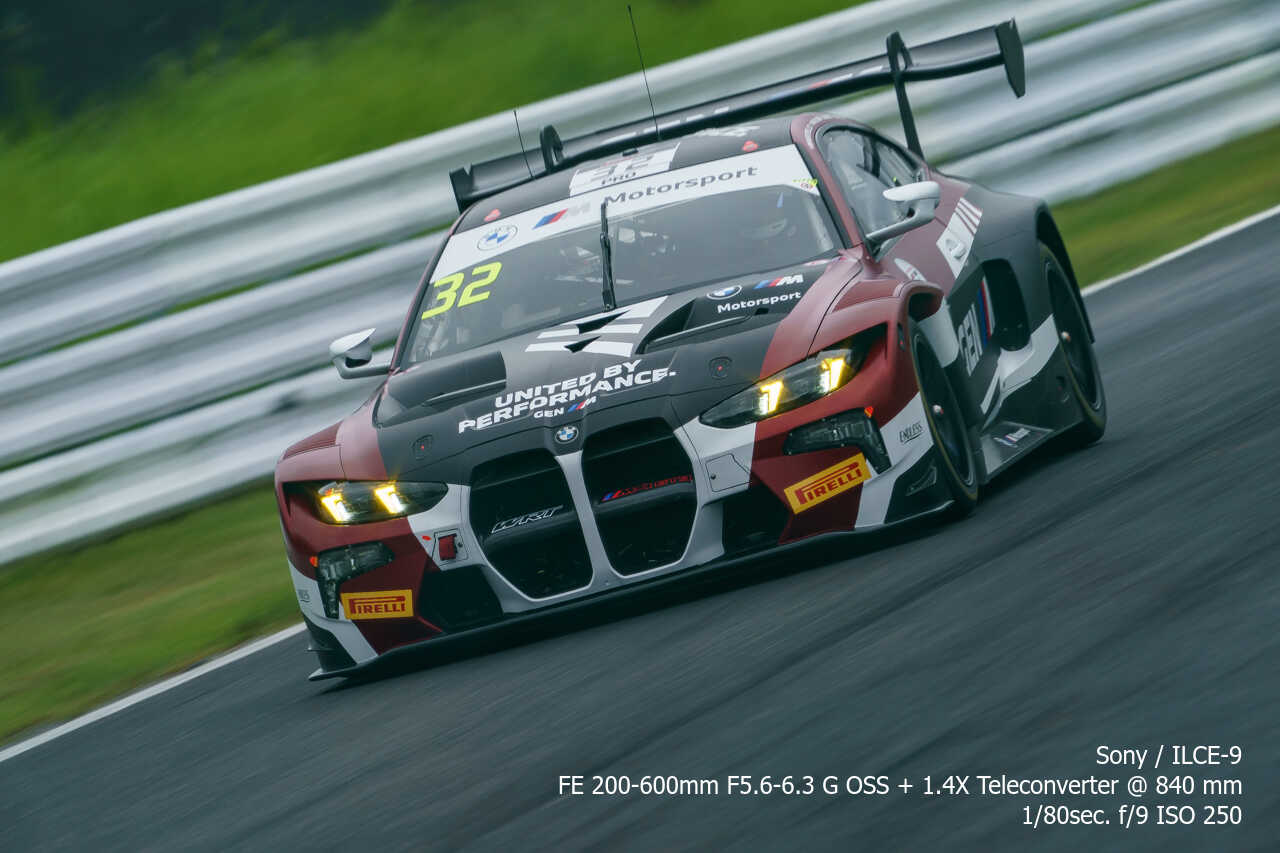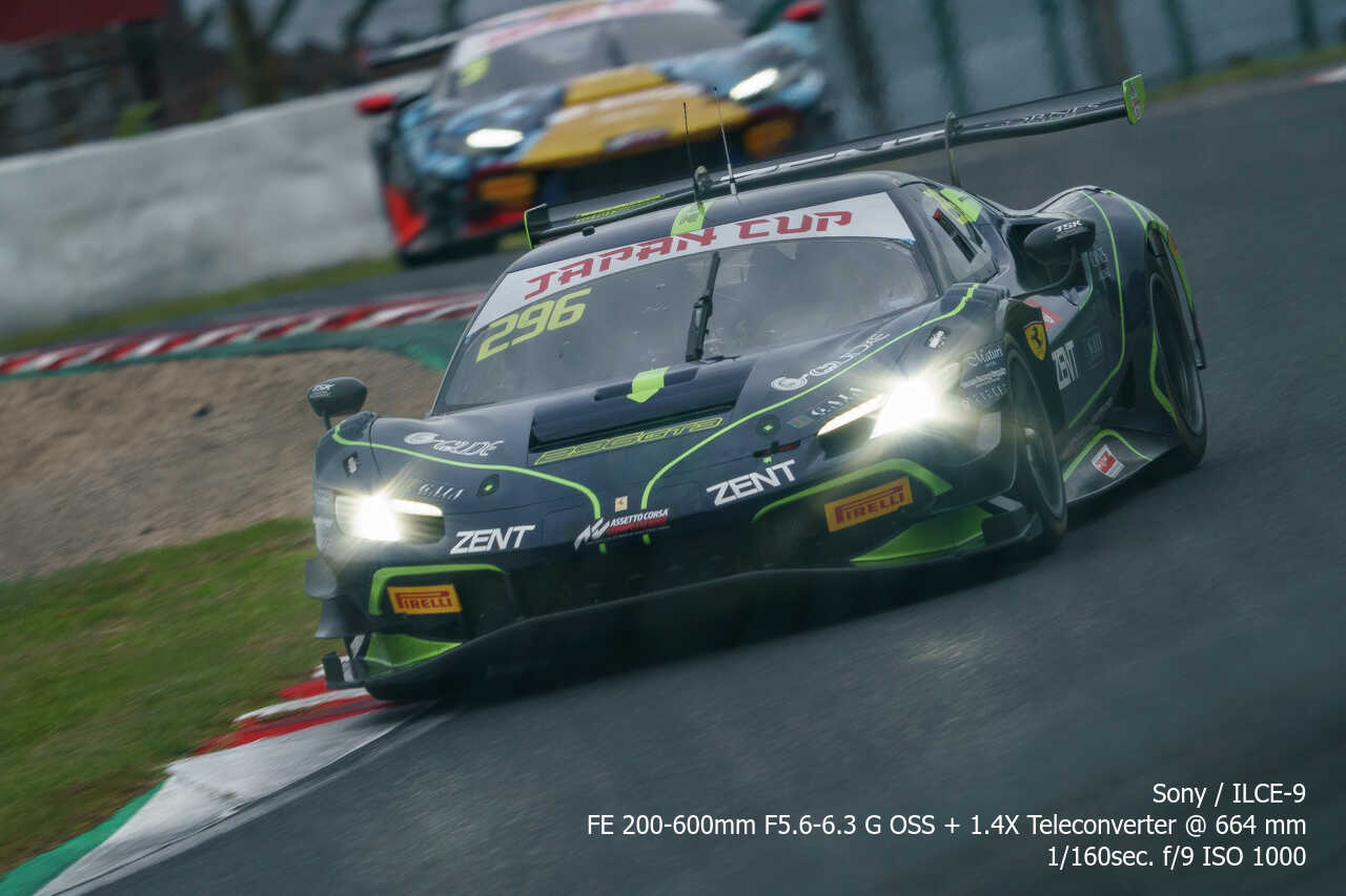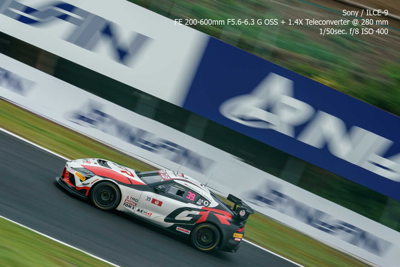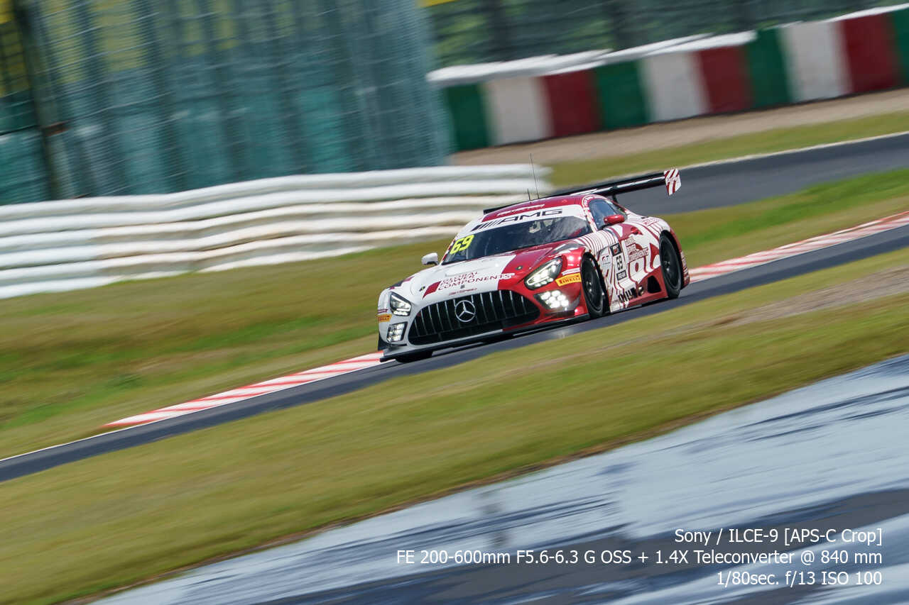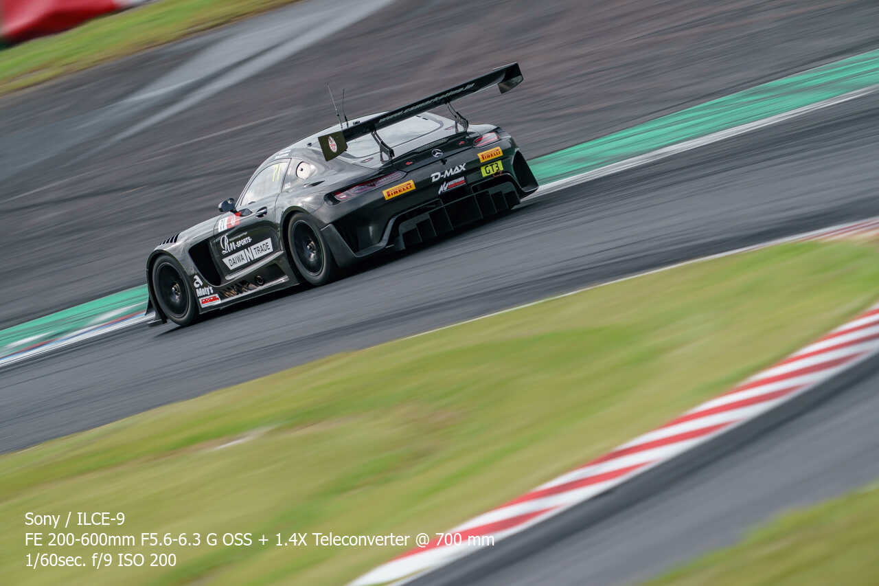 まあ、この辺りは定番のショットなので、ウェットコンディションでそこまで車速早くないし、慣れている構図なので、はじめからクロップ使ってガッツリ寄りつつ、シャッター速度も1/60sまで攻めました。それでも、GT3車両はこれぐらいで狙えるんだよな…。GT500とかになると、そもそも追いかけるのも大変になるけど。