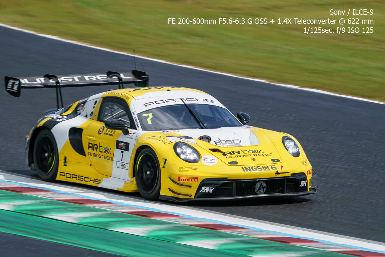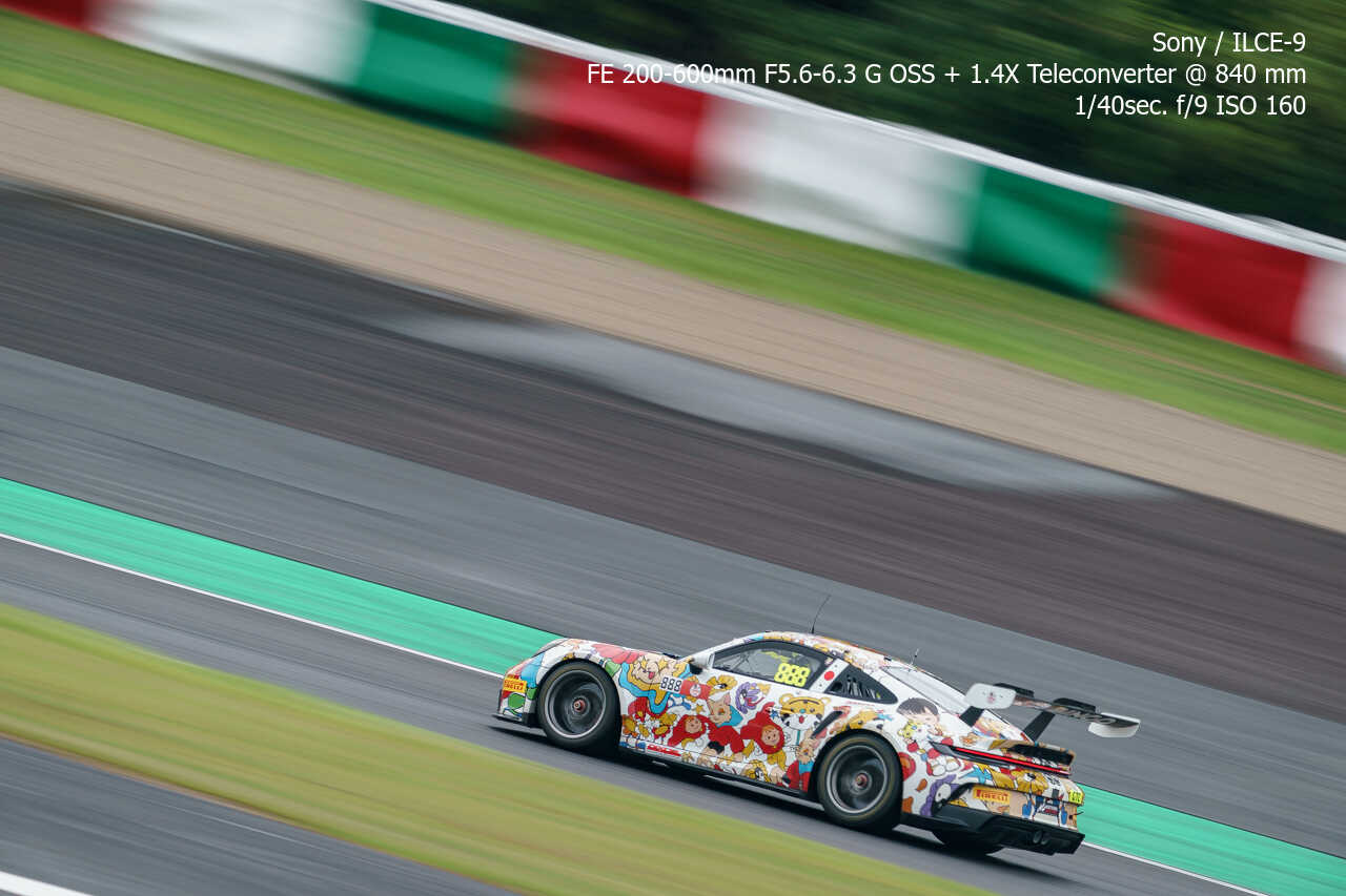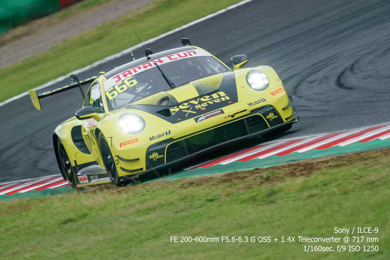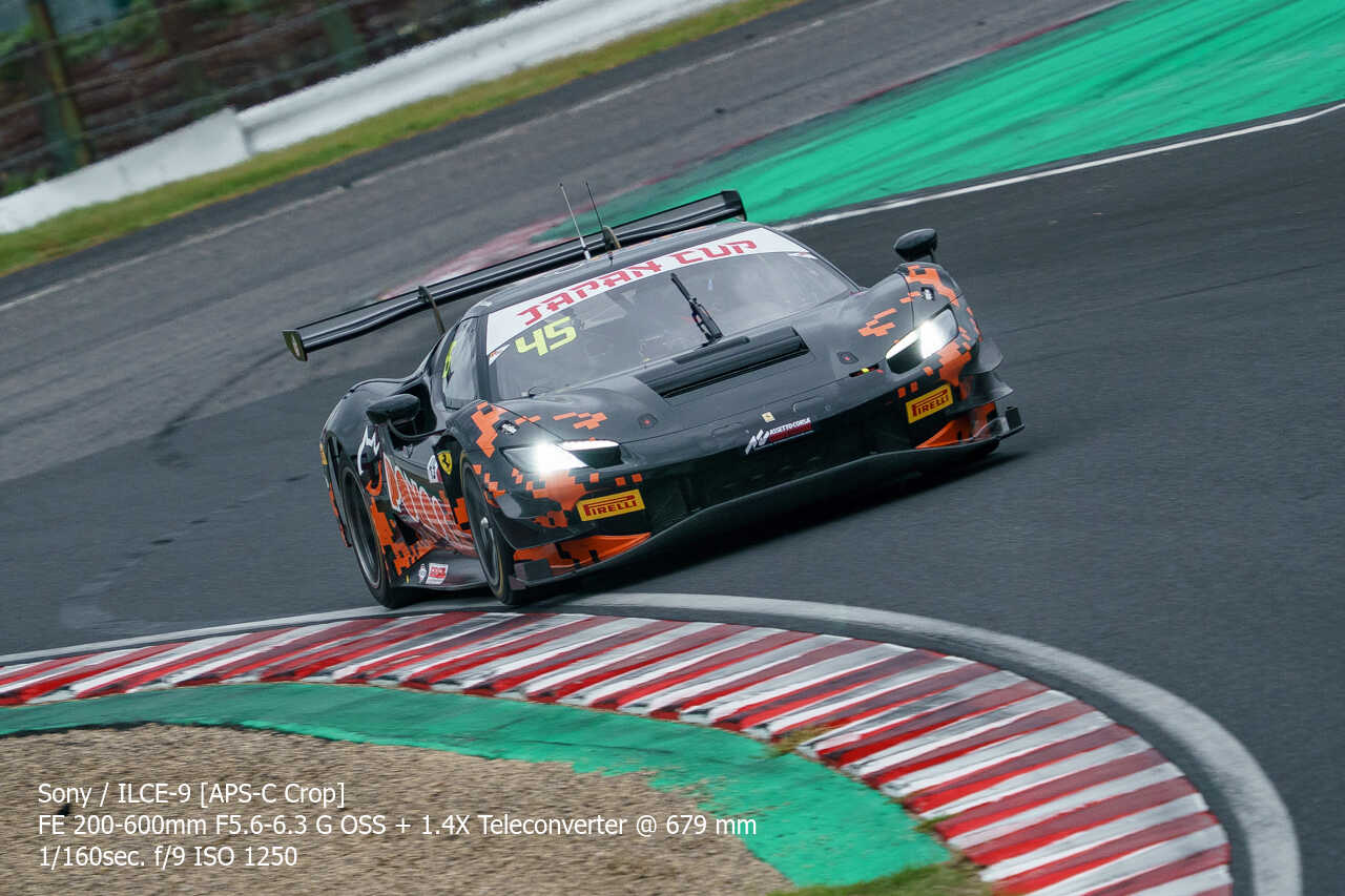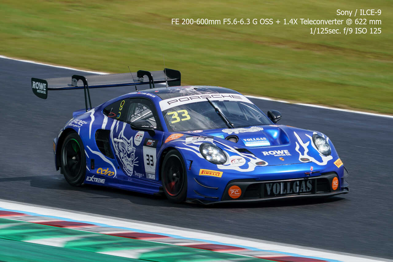 まあ、この辺りは定番のショットなので、ウェットコンディションでそこまで車速早くないし、慣れている構図なので、はじめからクロップ使ってガッツリ寄りつつ、シャッター速度も1/60sまで攻めました。それでも、GT3車両はこれぐらいで狙えるんだよな…。GT500とかになると、そもそも追いかけるのも大変になるけど。