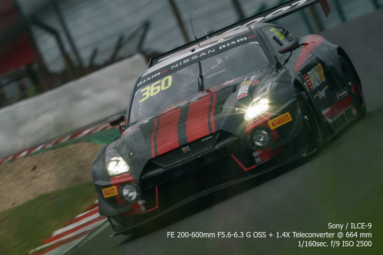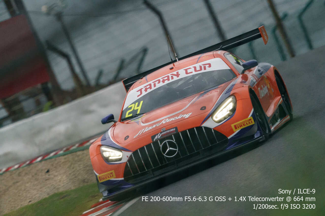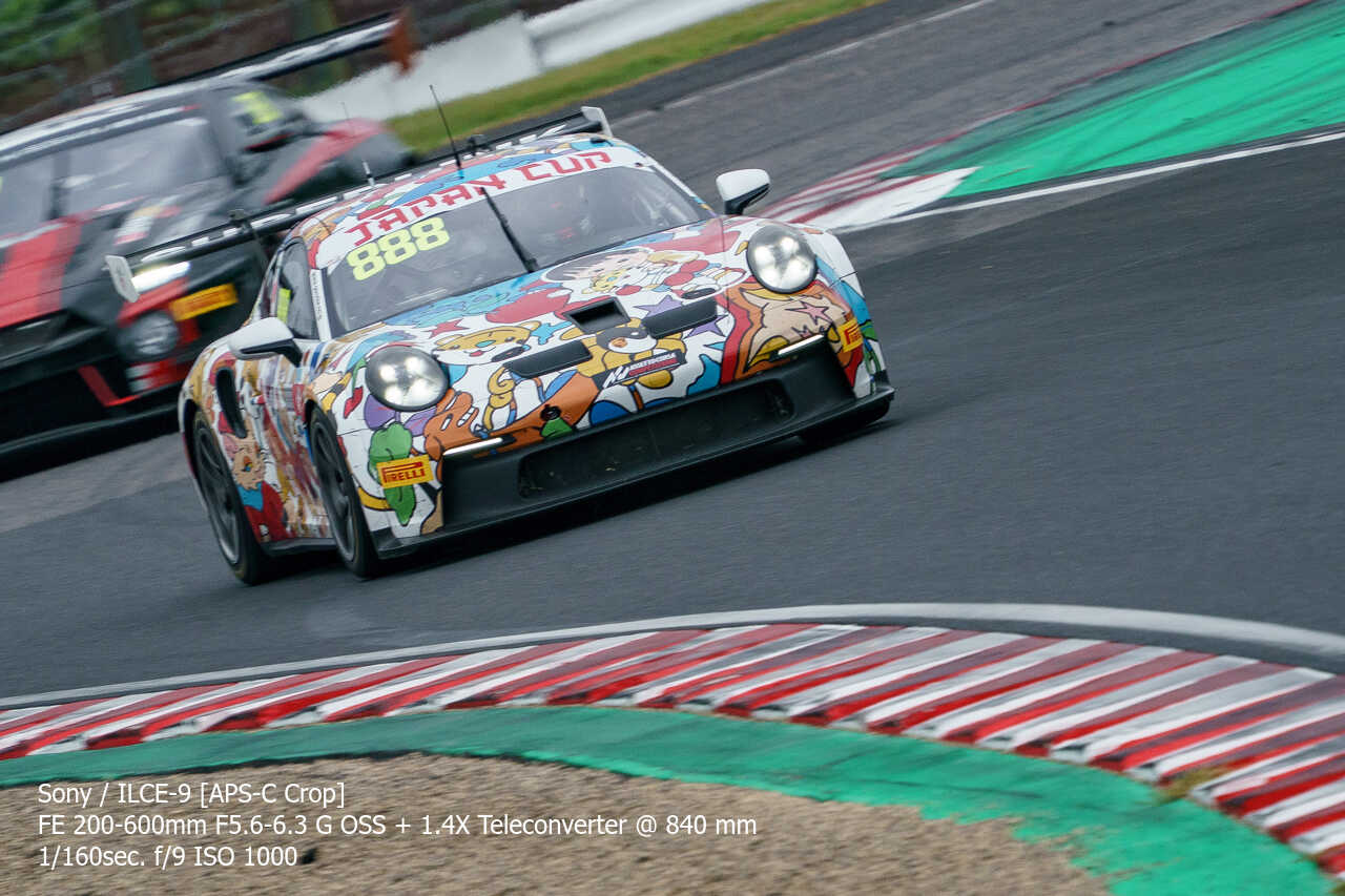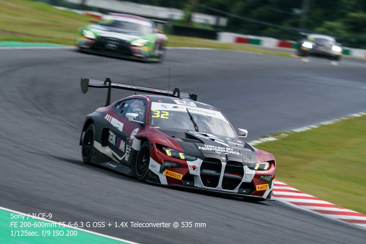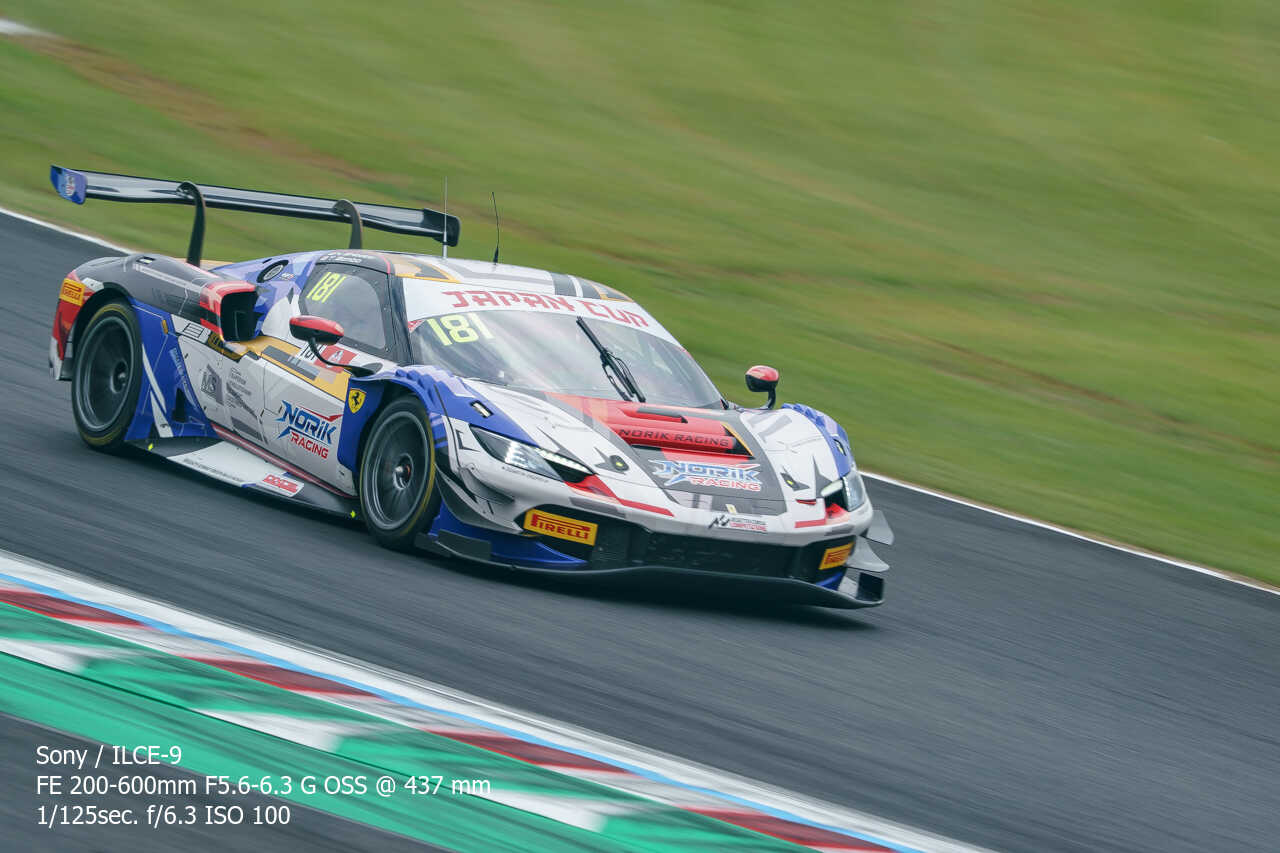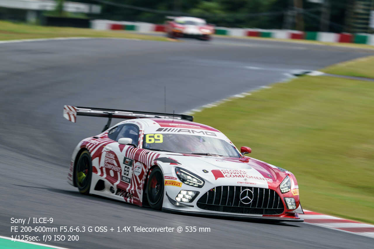 まあ、この辺りは定番のショットなので、ウェットコンディションでそこまで車速早くないし、慣れている構図なので、はじめからクロップ使ってガッツリ寄りつつ、シャッター速度も1/60sまで攻めました。それでも、GT3車両はこれぐらいで狙えるんだよな…。GT500とかになると、そもそも追いかけるのも大変になるけど。