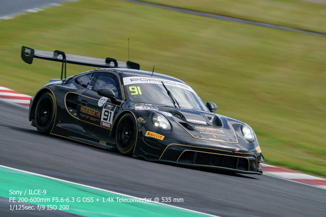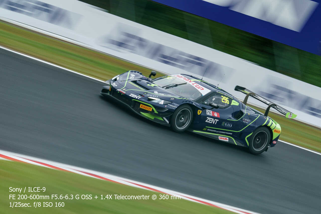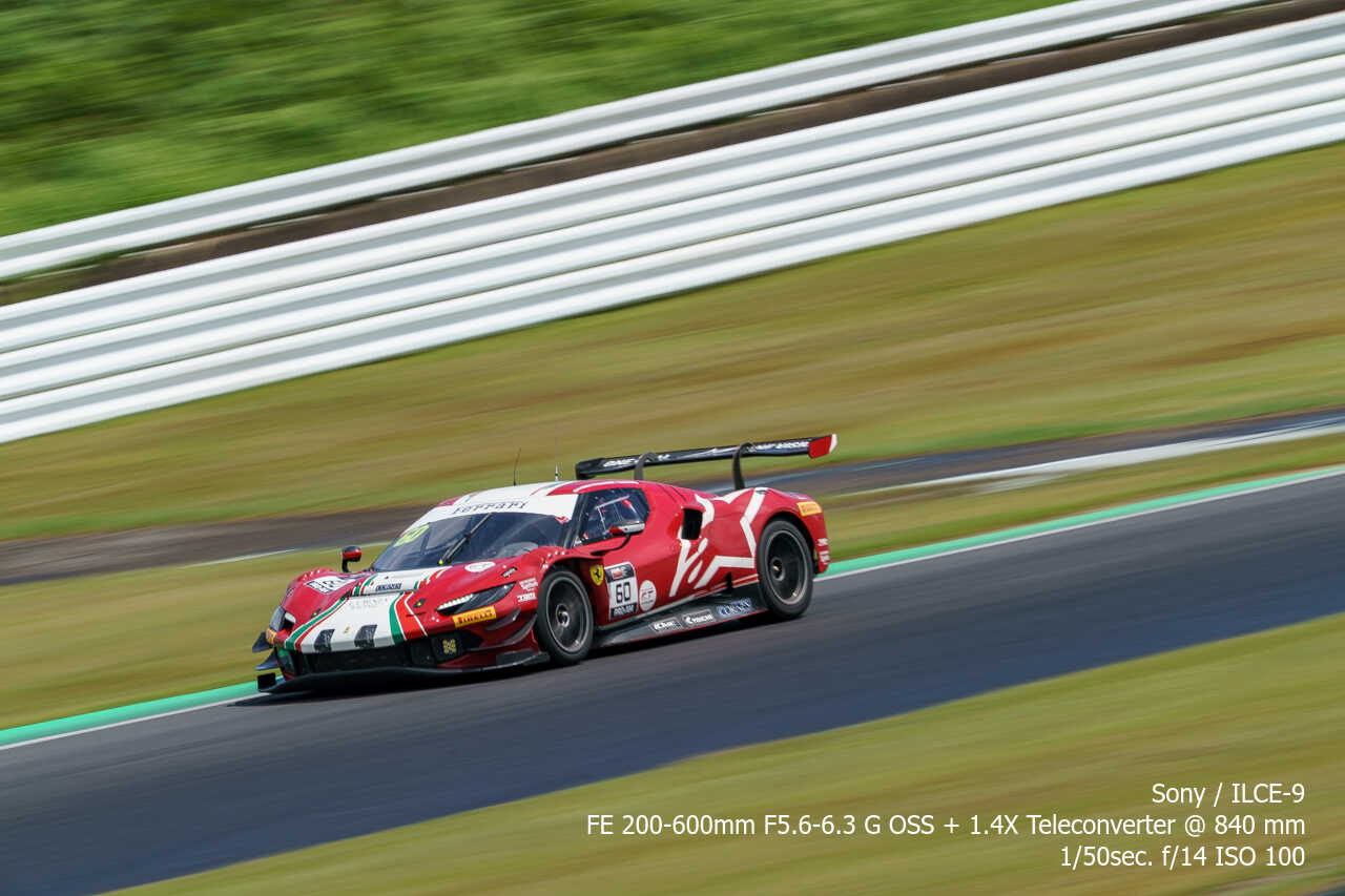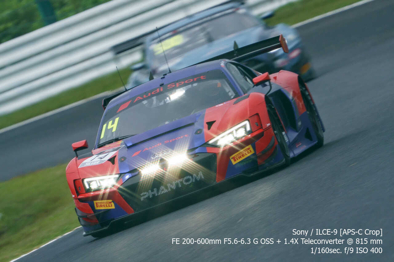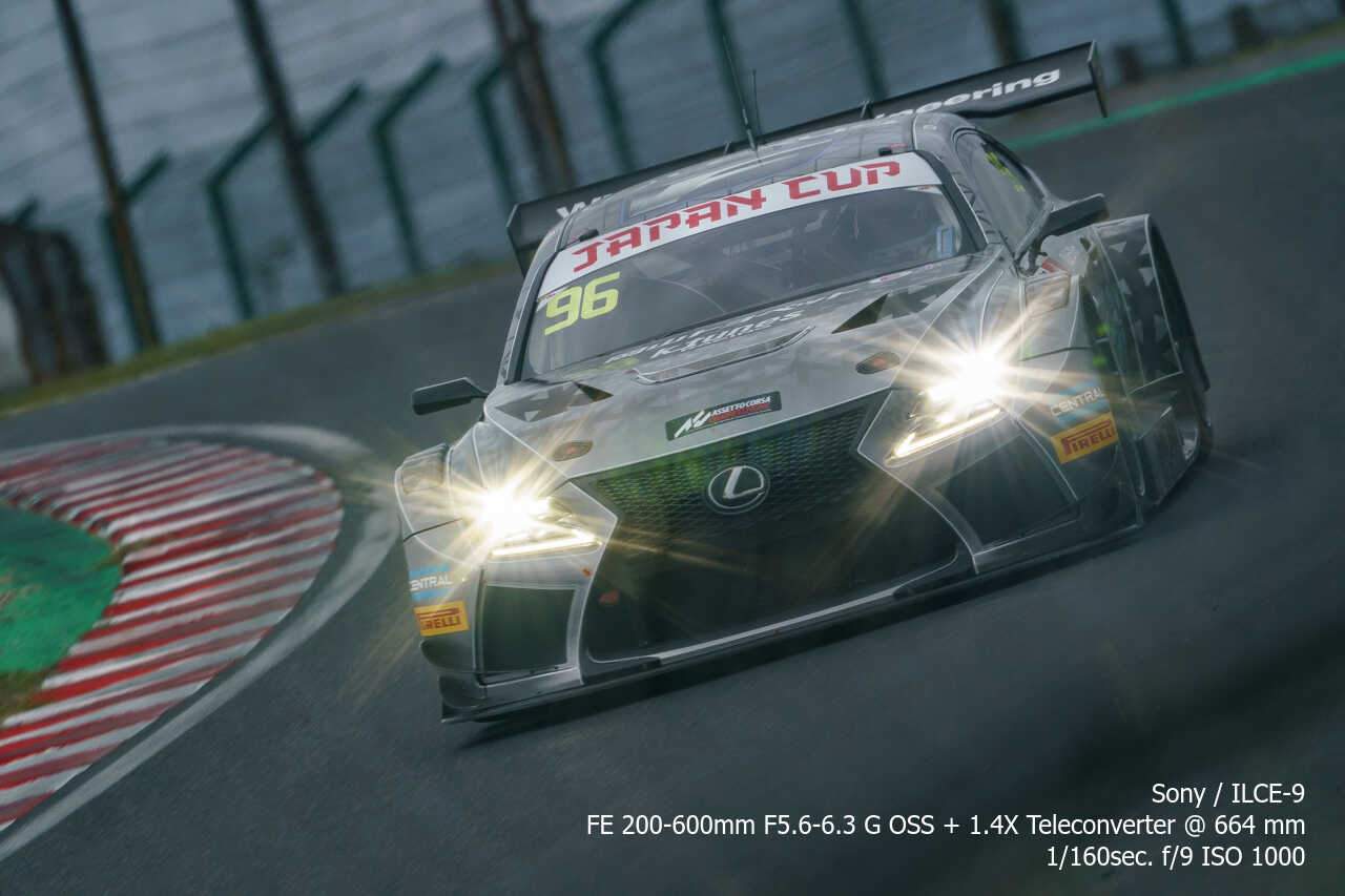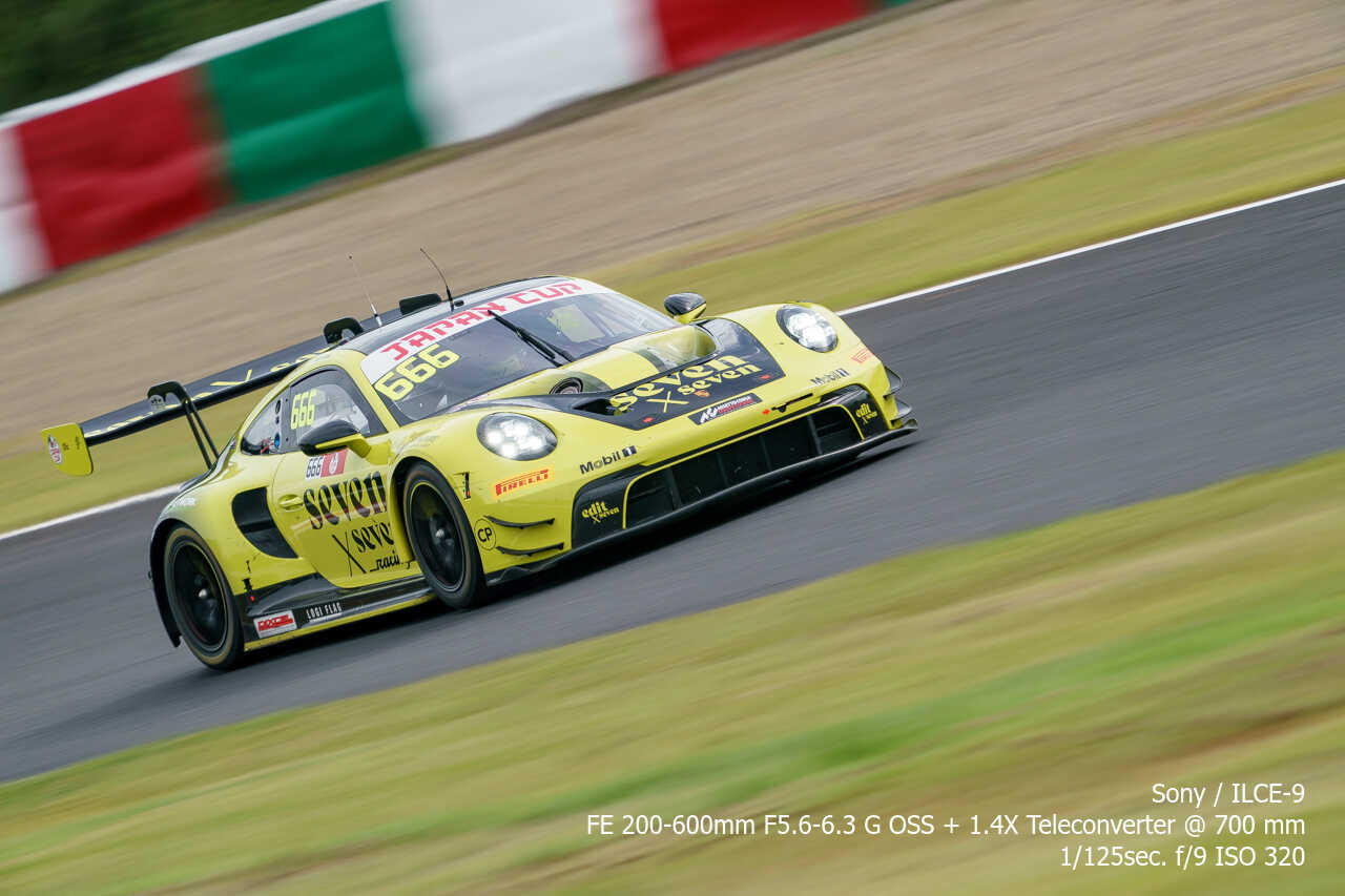 まあ、この辺りは定番のショットなので、ウェットコンディションでそこまで車速早くないし、慣れている構図なので、はじめからクロップ使ってガッツリ寄りつつ、シャッター速度も1/60sまで攻めました。それでも、GT3車両はこれぐらいで狙えるんだよな…。GT500とかになると、そもそも追いかけるのも大変になるけど。