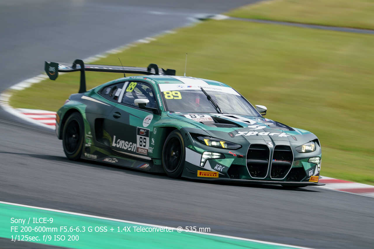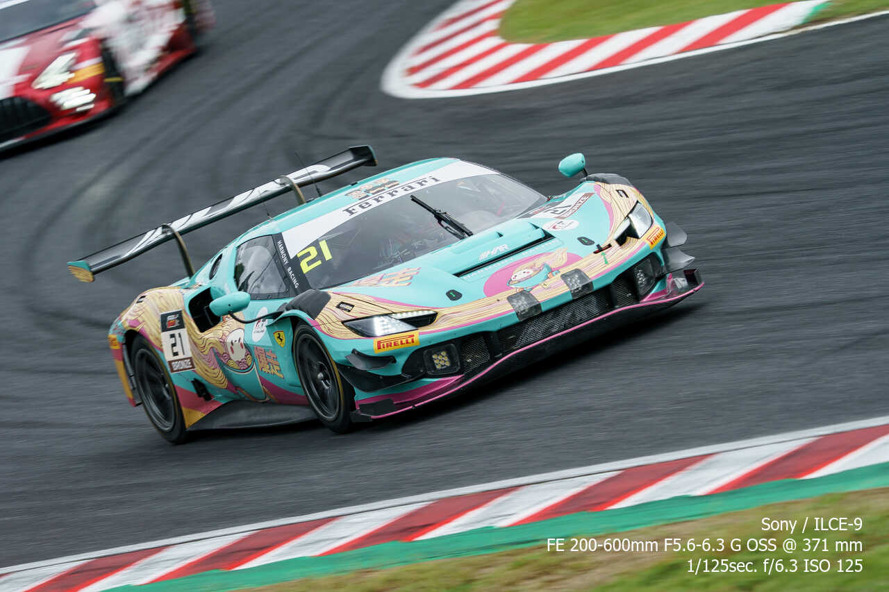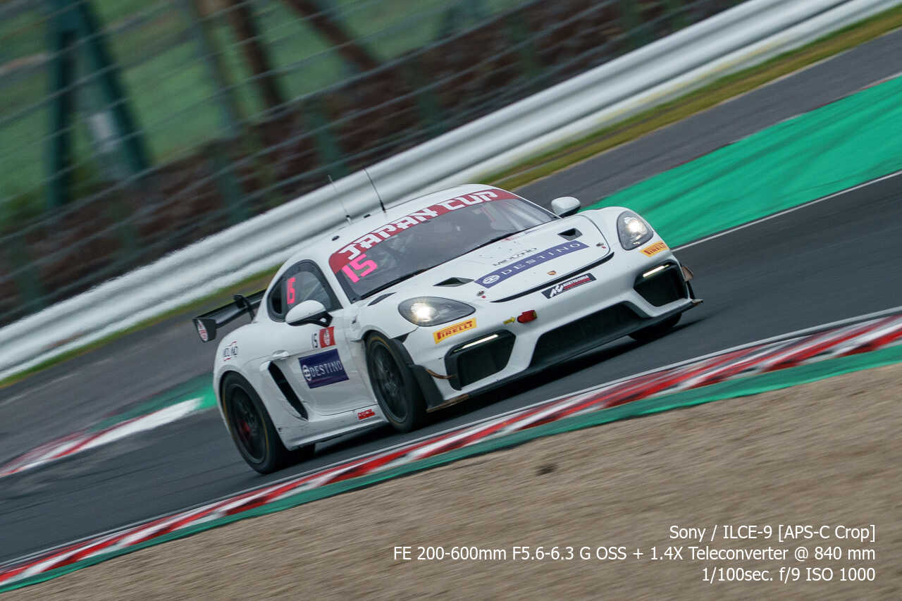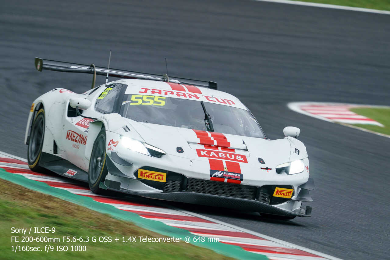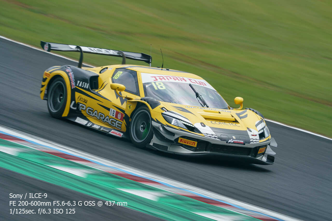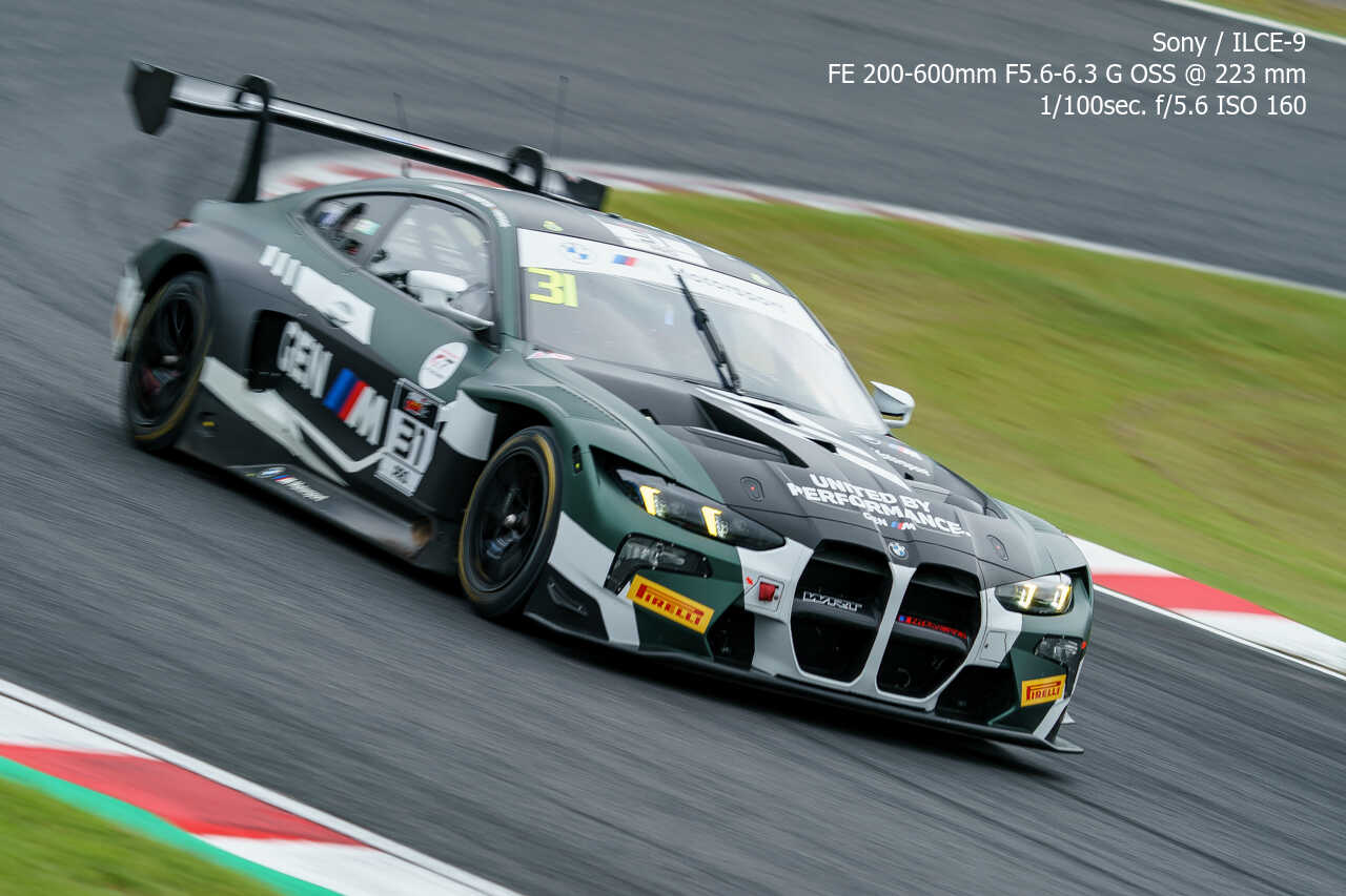まあ、この辺りは定番のショットなので、ウェットコンディションでそこまで車速早くないし、慣れている構図なので、はじめからクロップ使ってガッツリ寄りつつ、シャッター速度も1/60sまで攻めました。それでも、GT3車両はこれぐらいで狙えるんだよな…。GT500とかになると、そもそも追いかけるのも大変になるけど。