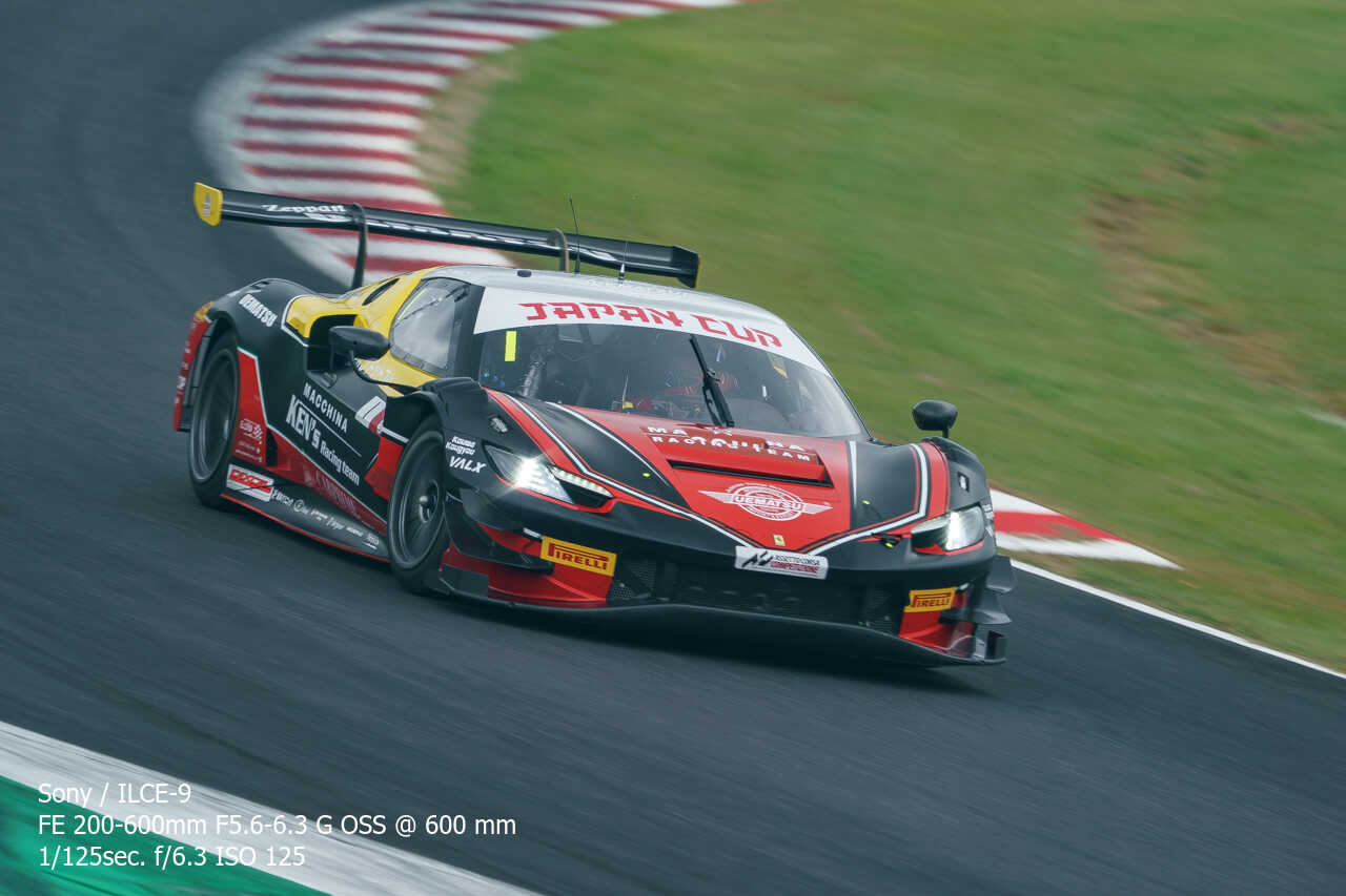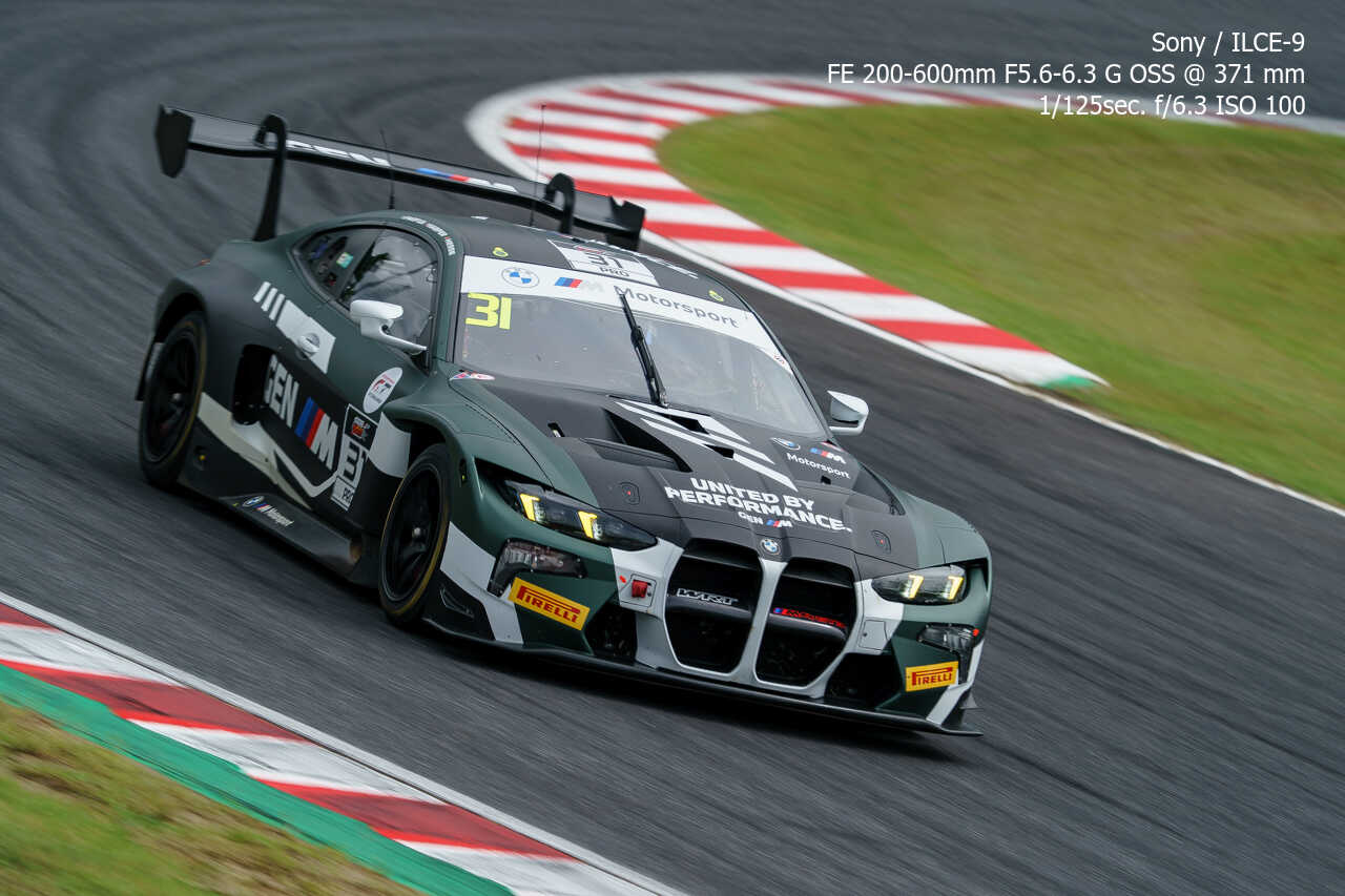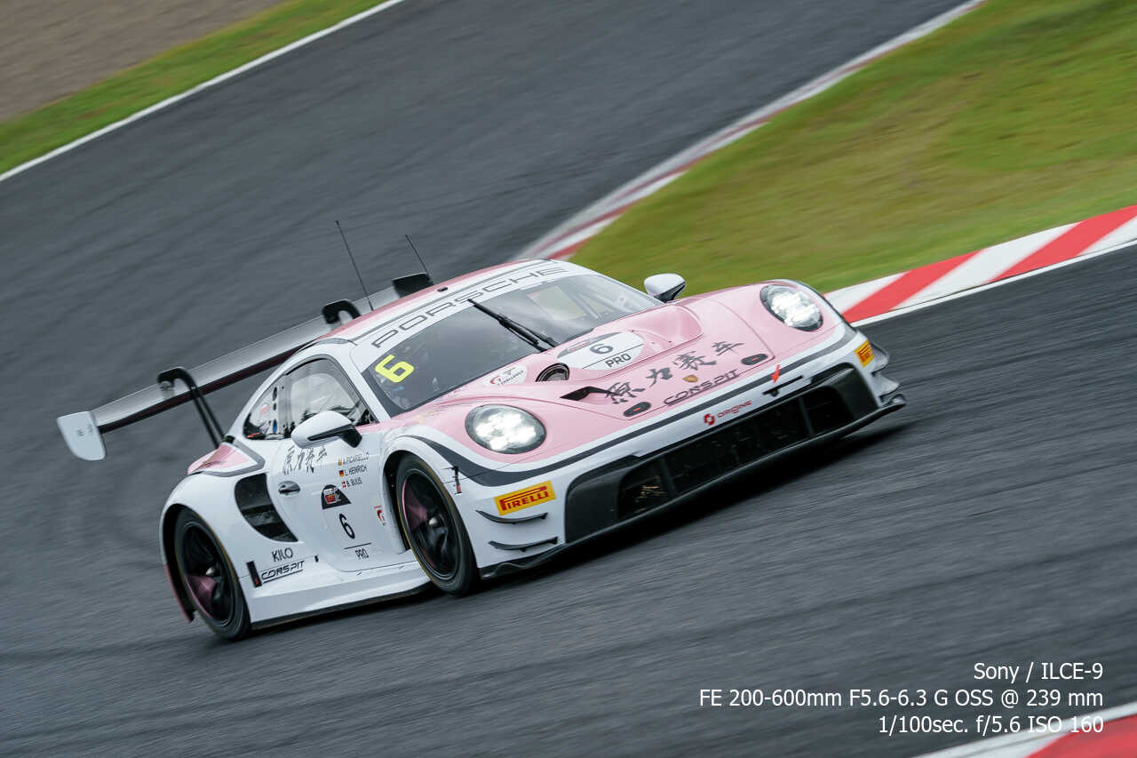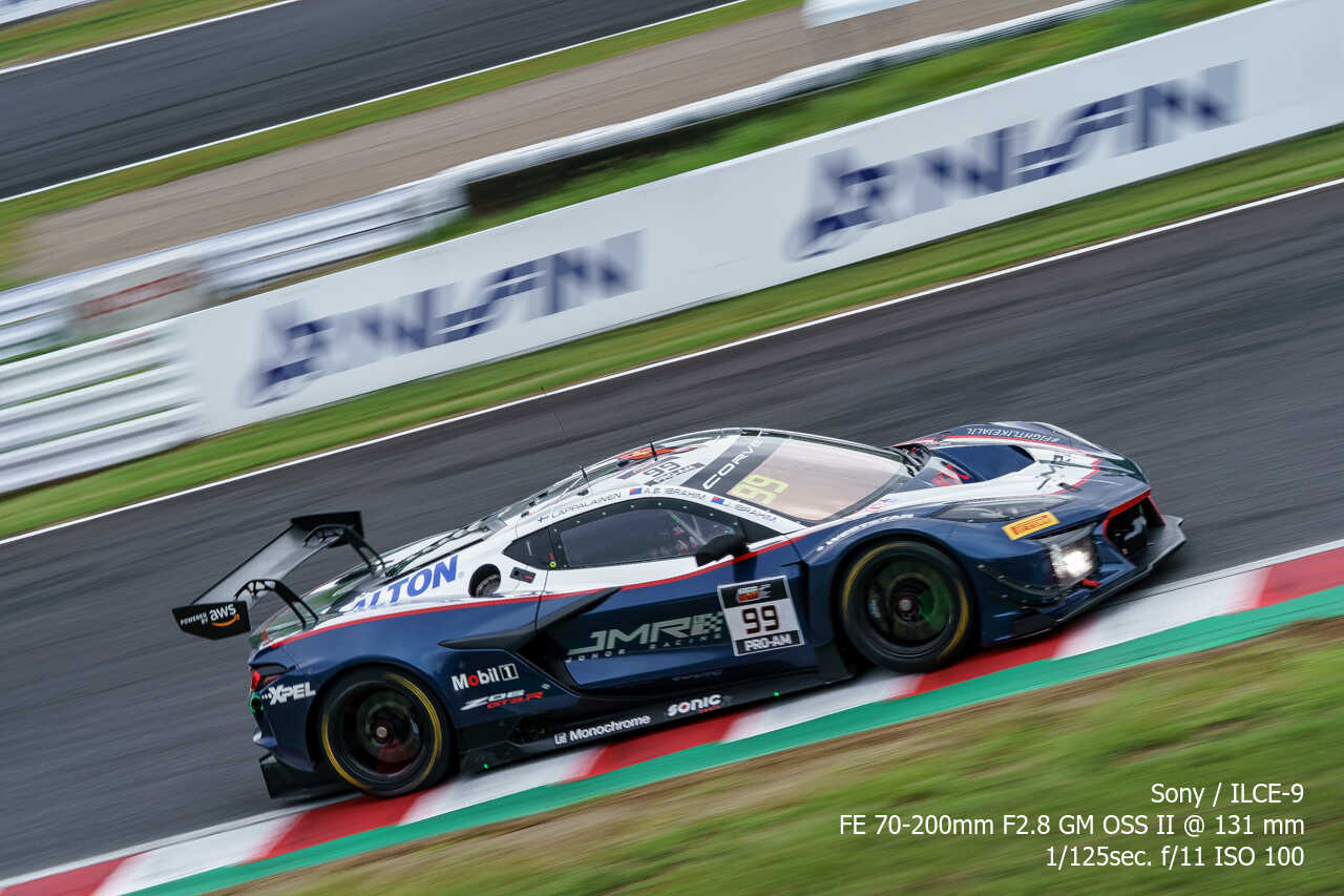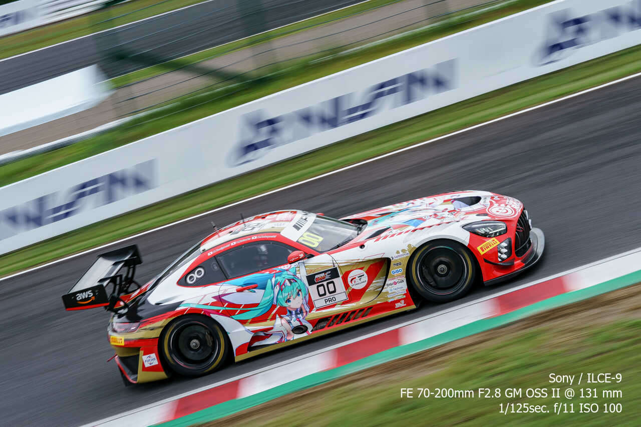 まあ、この辺りは定番のショットなので、ウェットコンディションでそこまで車速早くないし、慣れている構図なので、はじめからクロップ使ってガッツリ寄りつつ、シャッター速度も1/60sまで攻めました。それでも、GT3車両はこれぐらいで狙えるんだよな…。GT500とかになると、そもそも追いかけるのも大変になるけど。
