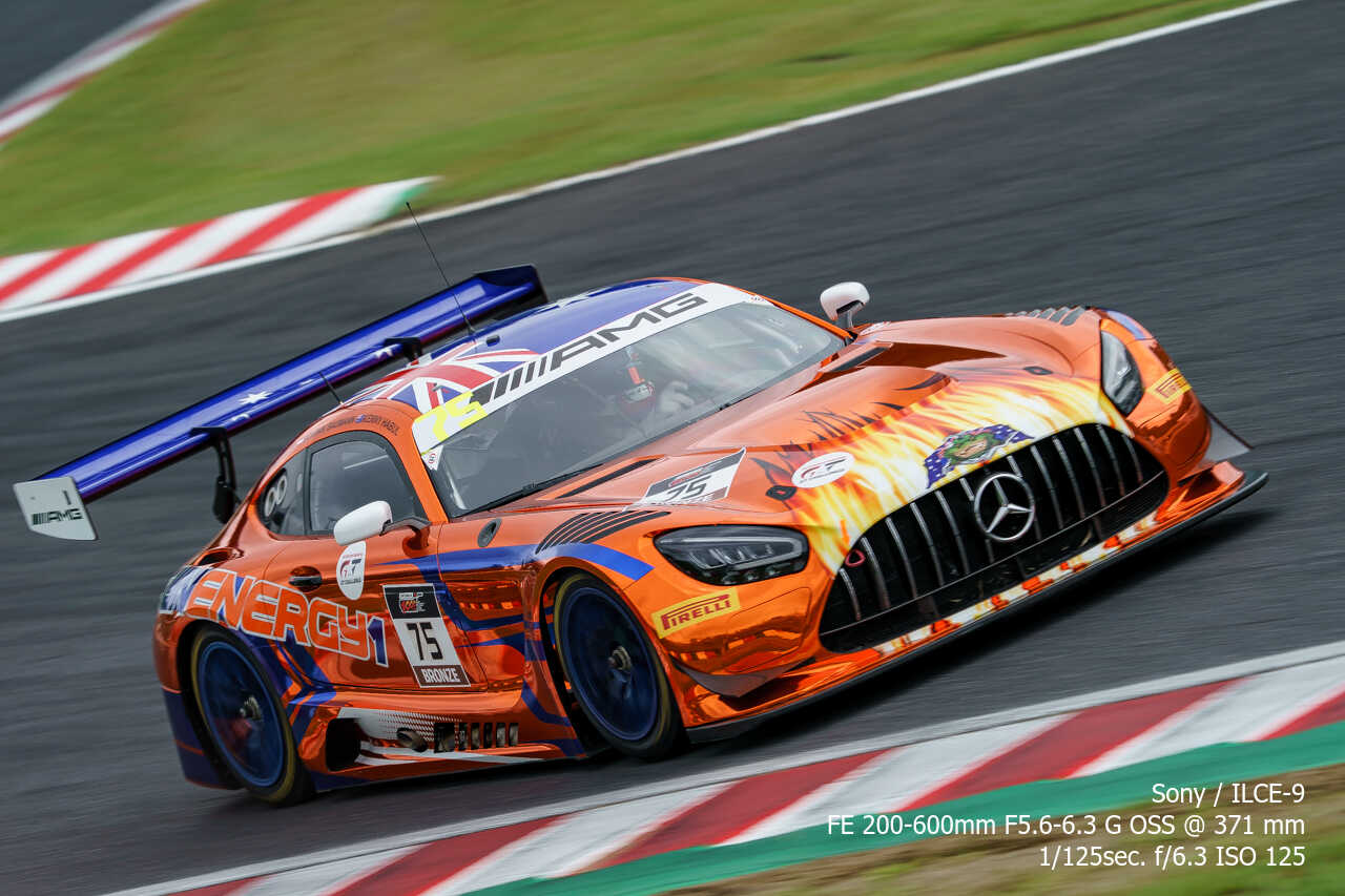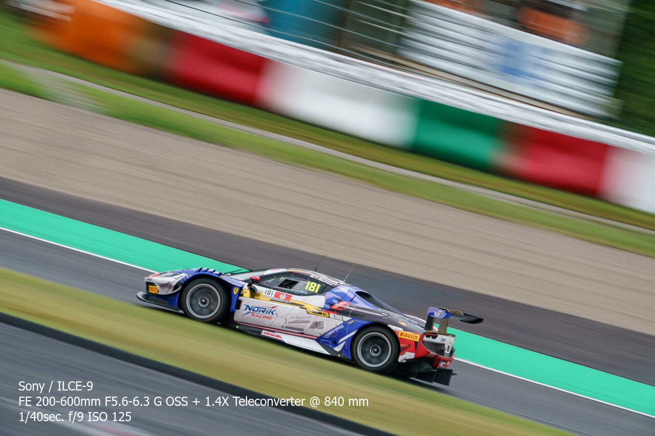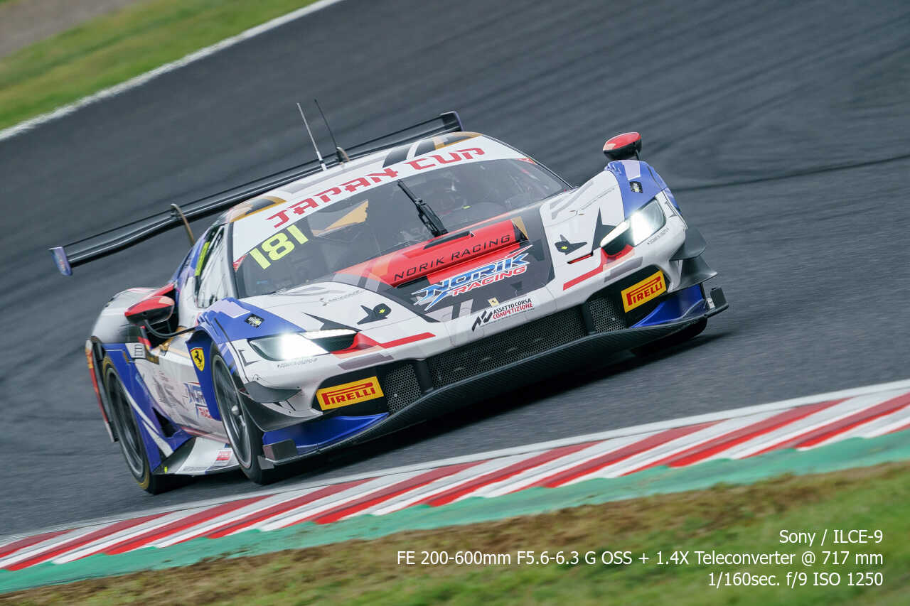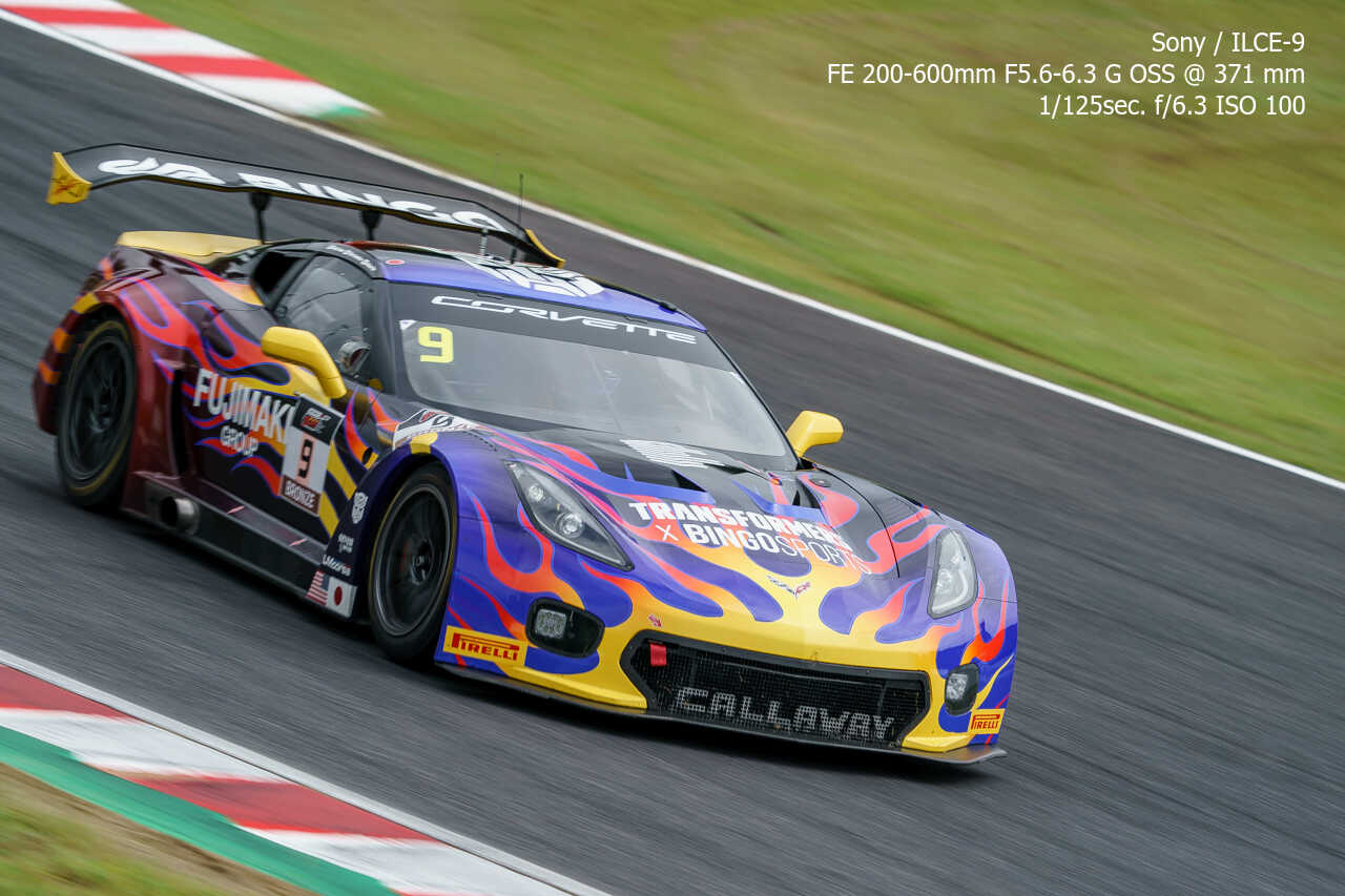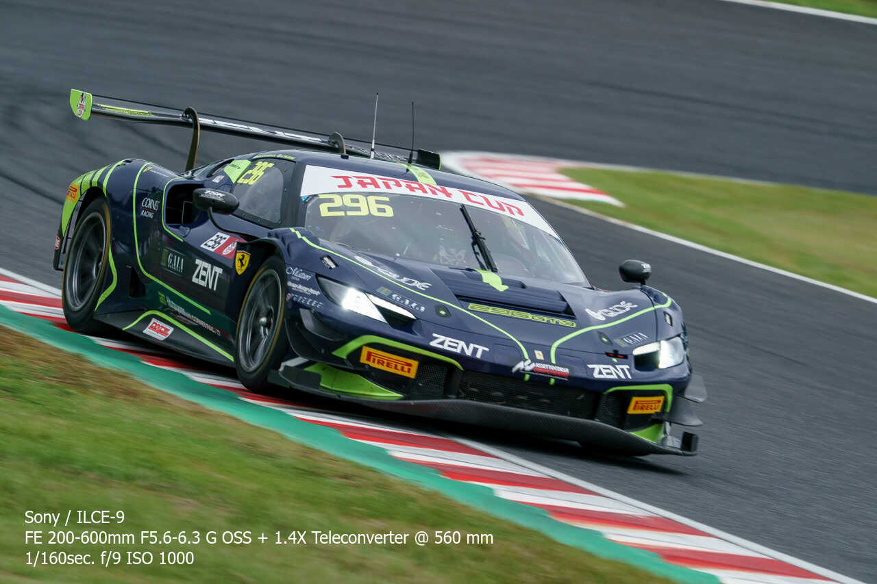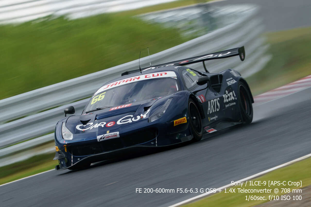 まあ、この辺りは定番のショットなので、ウェットコンディションでそこまで車速早くないし、慣れている構図なので、はじめからクロップ使ってガッツリ寄りつつ、シャッター速度も1/60sまで攻めました。それでも、GT3車両はこれぐらいで狙えるんだよな…。GT500とかになると、そもそも追いかけるのも大変になるけど。