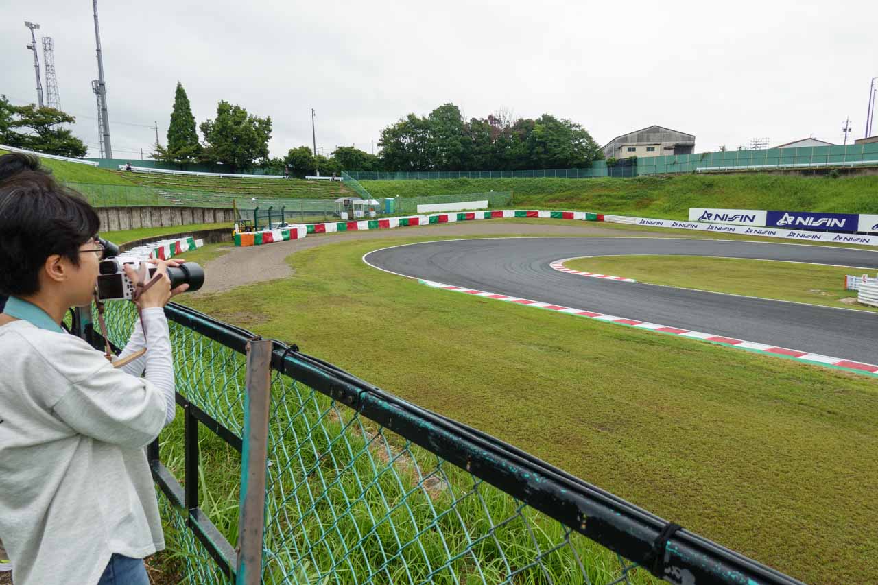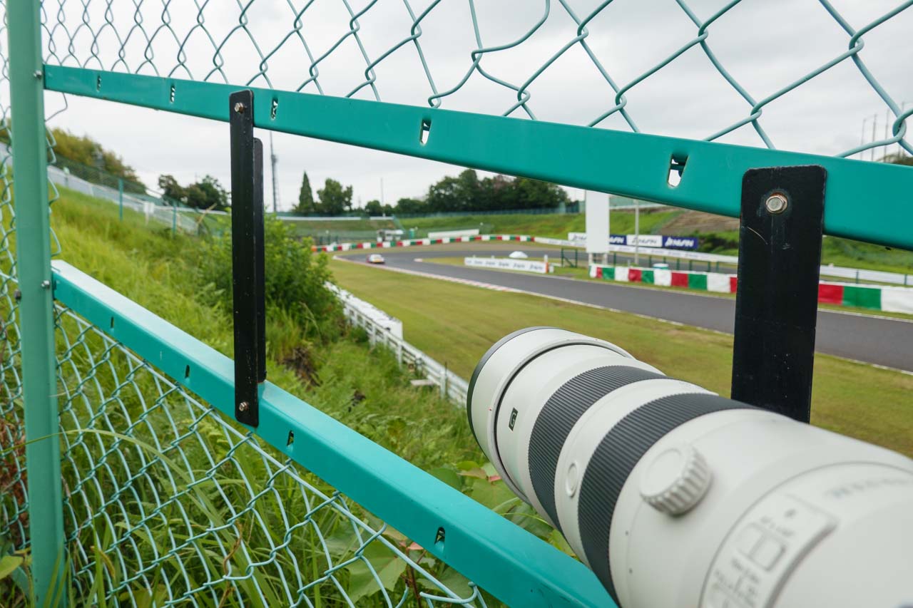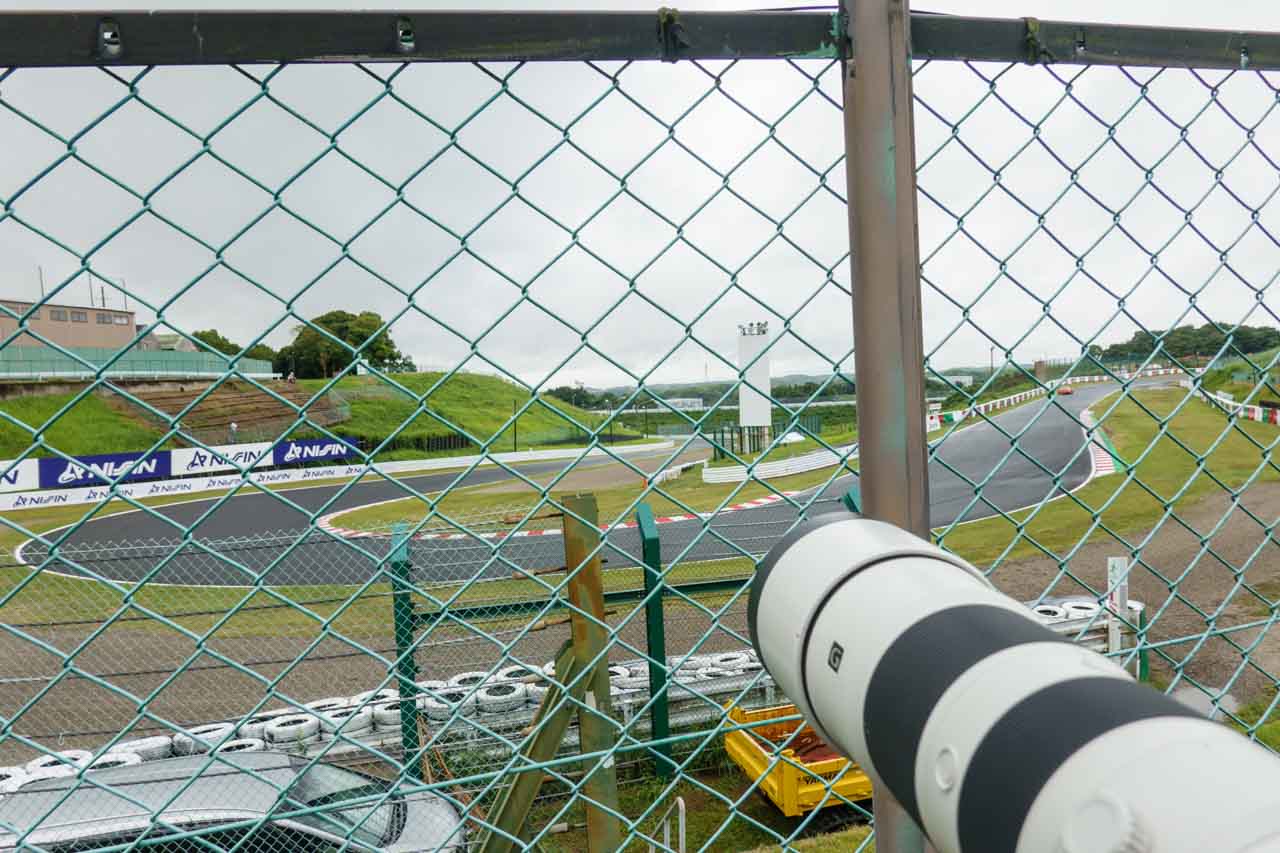 スプーンの1つ目と2つ目の間にある、いわゆる「Mエリア」の中央付近。ここだとフェンス越しにはなるけど、ちょうどコース側のフェンスの切れ間から狙えます。どうしても高い位置からになる分、本当は椅子に座って狙ったりすべきところだったのでしょうが、ここはひとまず立ちで狙うことに。