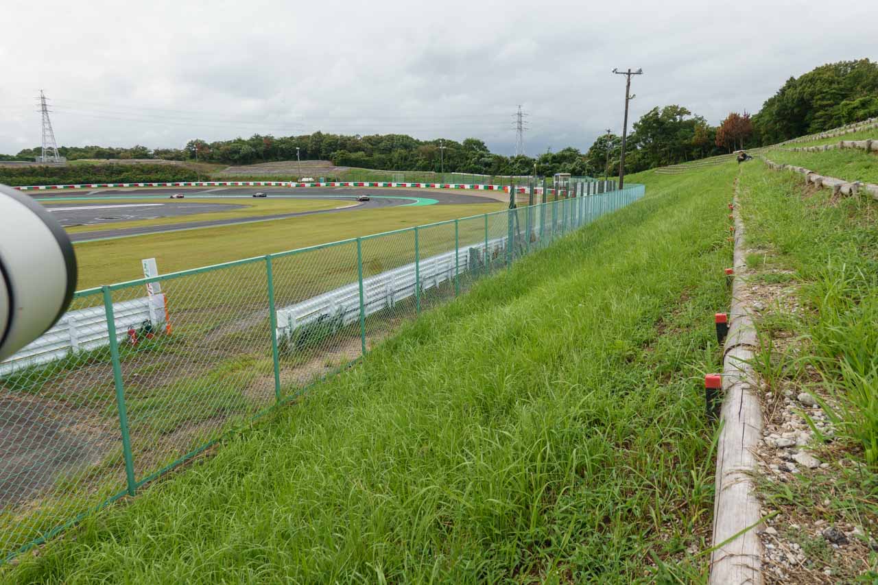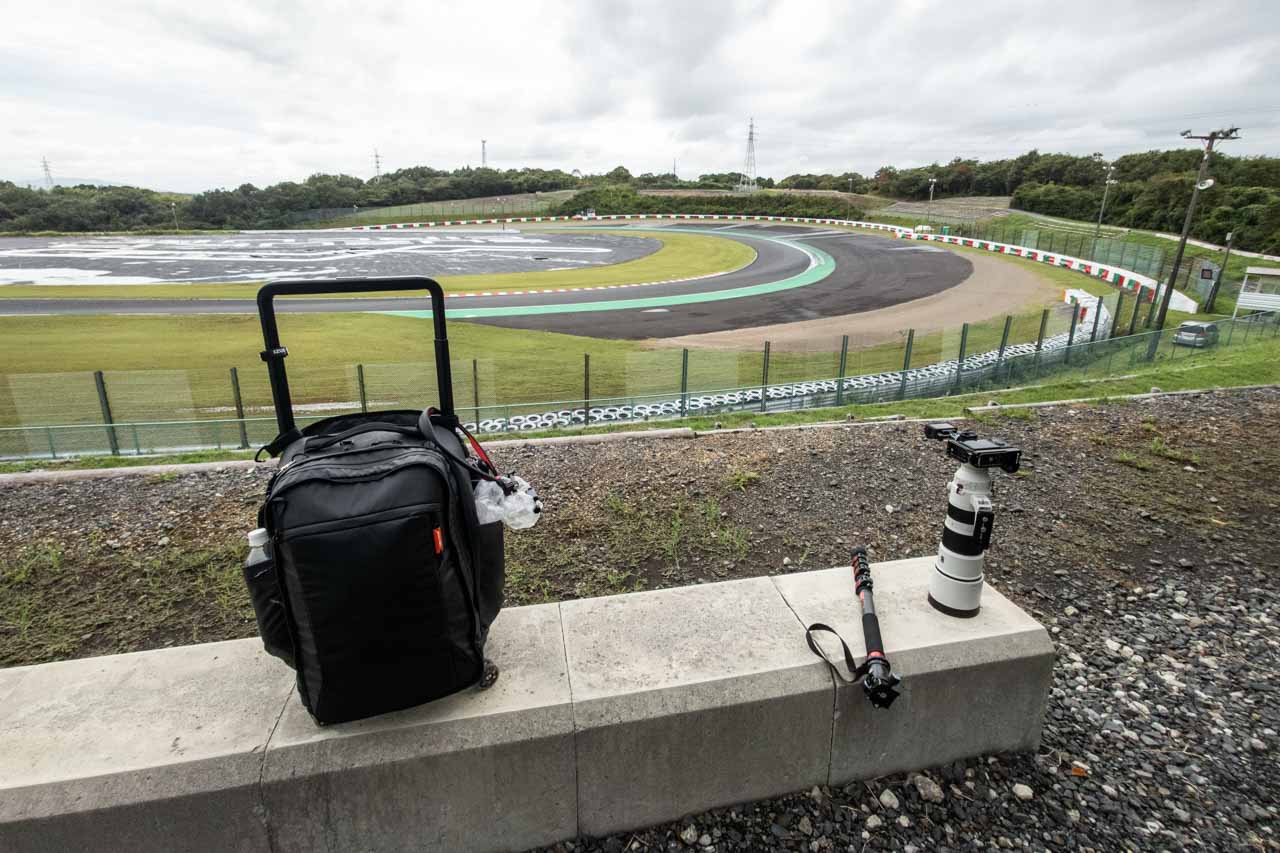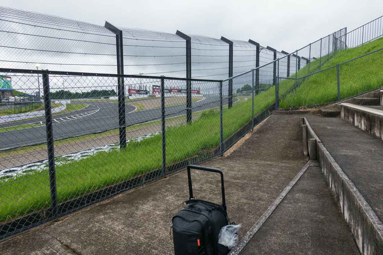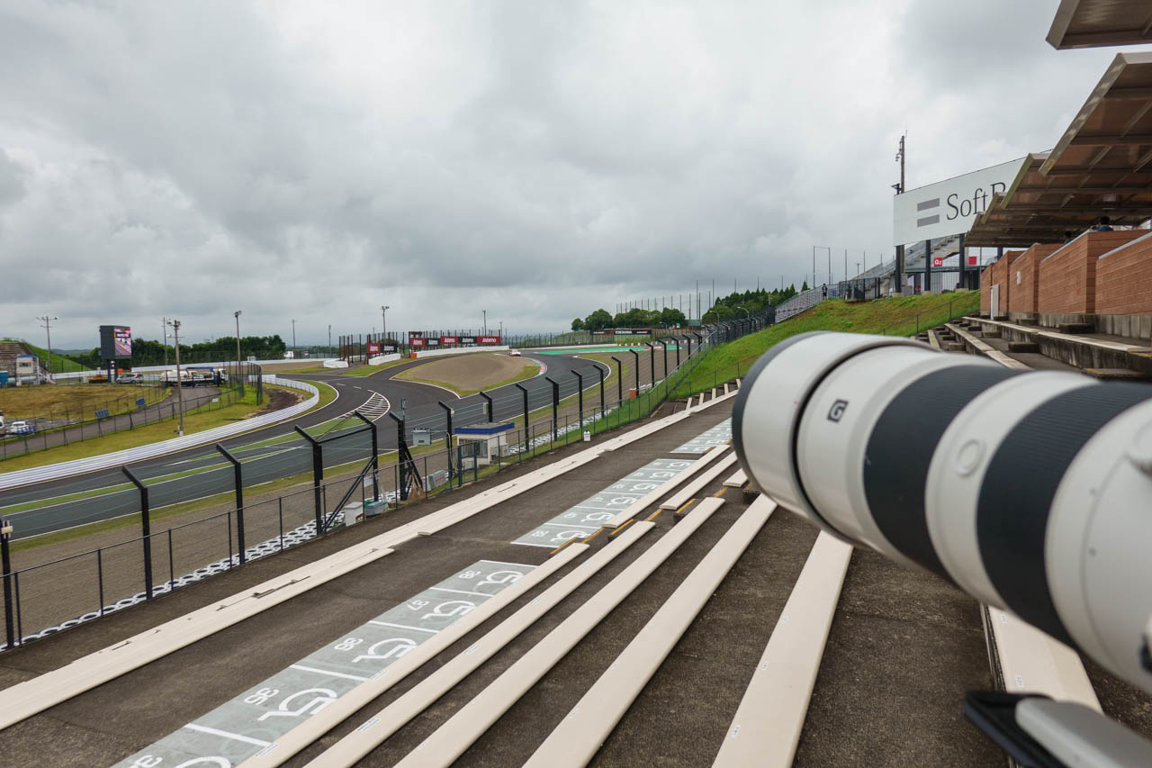 スプーンの1つ目と2つ目の間にある、いわゆる「Mエリア」の中央付近。ここだとフェンス越しにはなるけど、ちょうどコース側のフェンスの切れ間から狙えます。どうしても高い位置からになる分、本当は椅子に座って狙ったりすべきところだったのでしょうが、ここはひとまず立ちで狙うことに。
