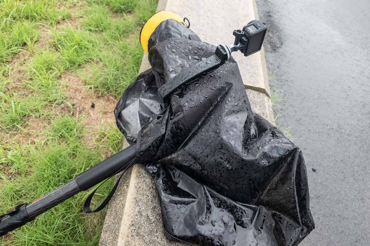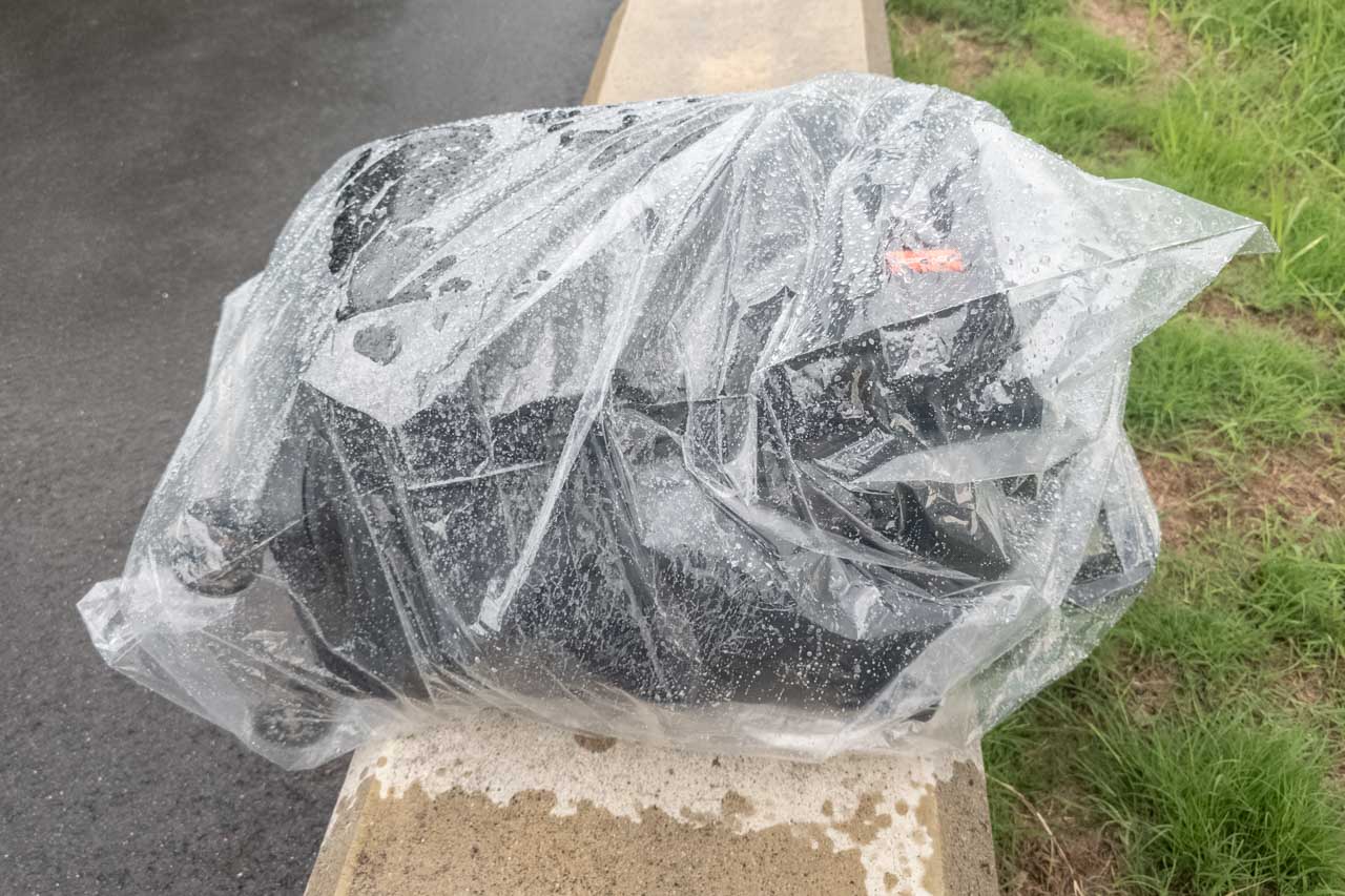 で、ここで6分程撮影したところで雨が本格的に降り始め、レーダーを見てもこの後さらに雨脚が強まりそうだった為、一旦上のU字溝のところに移動をして雨対策。カメラバッグには一様レインカバーはありますが、アレコレ面倒くさいので透明のゴミ袋を被せてしまうのが、最近の私のパターン。