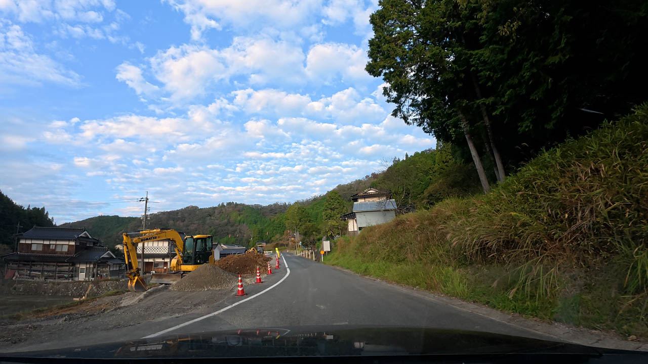 先日の全日本ロードの時に拡幅工事中だった県道46号線・和気笹目作東線の田渕地区は、さすがにまだ。まあ、こちらは道路工事規制情報によると来年の1/12までだからそんなもんだろうとは思っていましたが…