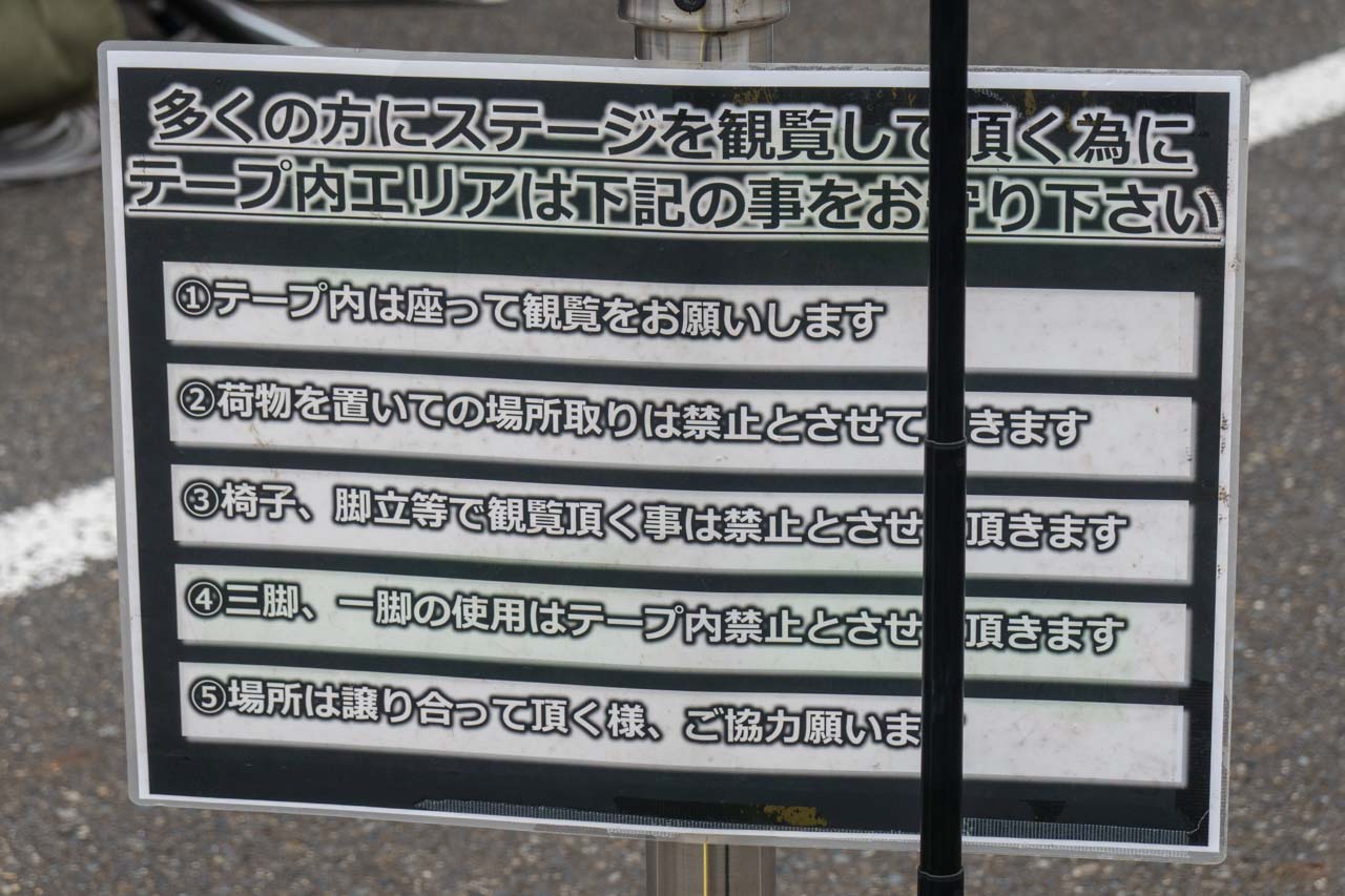 そういえばそうだったよな…というのが、③の椅子禁止と④の三脚・一脚の使用禁止。椅子禁止はまあ仕方がないんですが、S耐だとテープエリア外の一列目の人が立って撮影しちゃうんだよな…。こうなるとマジ辛い。正直、SGTのように1~2mでいいから椅子OKエリアを作って欲しい。そうしたらもっと撮影しやすい人が増えるんだよな…。