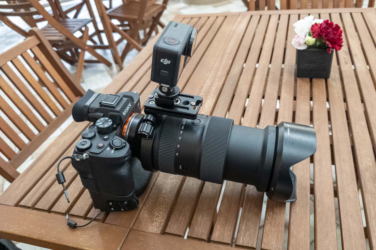 このHPとは関係がないのですが、今回、YouTube動画用にカメラアレンジをしたのがこちら。35-150mmにサードパーティー製の三脚座を付けて、その三脚座にアクションカメラを装着して、撮影の様子を狙おうというもの。