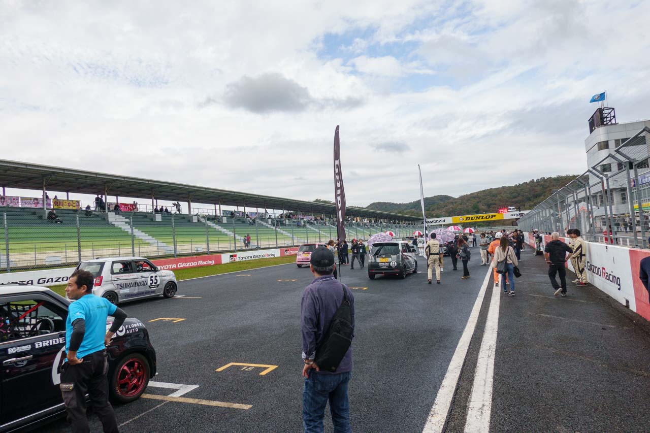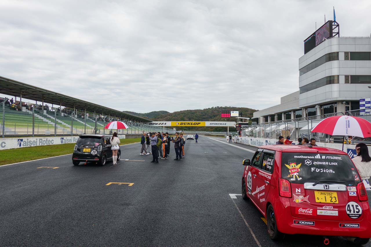 ちなみに、N-ONEって去年もそうでしたが、Cパドックからヘアピンのところからコースインしてくるので、ピットレーンを使わずにグリッドにやってくる。なので、スタート進行が結構早く始まるんだよな(フラグ)。