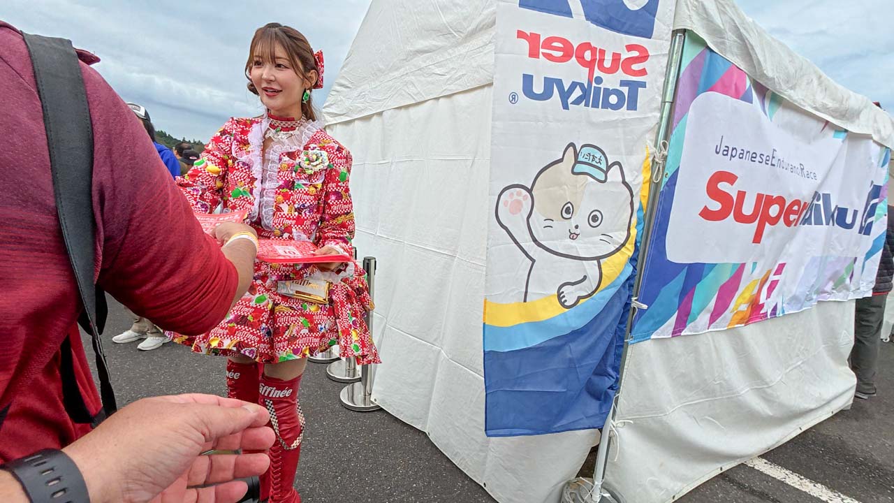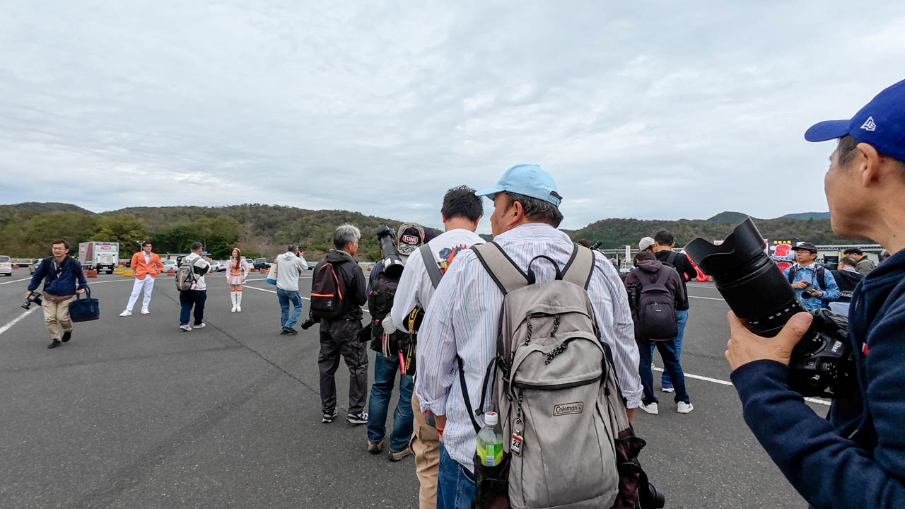 村上モータースがそれぞれ対応している中で、伊達さんの所だけ異様に待機列が長く伸びる状況。近づいてくるカメラマンも「これ、伊達ちゃんの列?」と明らかに彼女狙い。いやいや、冷静に考えてもまだSUPER GTのアンバサダー務めてないんだから、これでSGTとかにステップアップしたら一気にトップアンバサダーになりそうな予感。いや、ホントにお人形さんみたいな可愛さだもんな…。