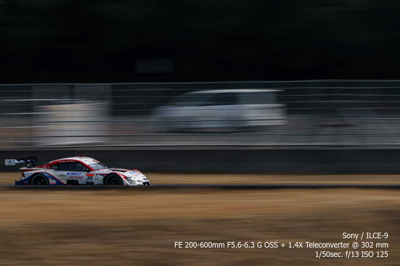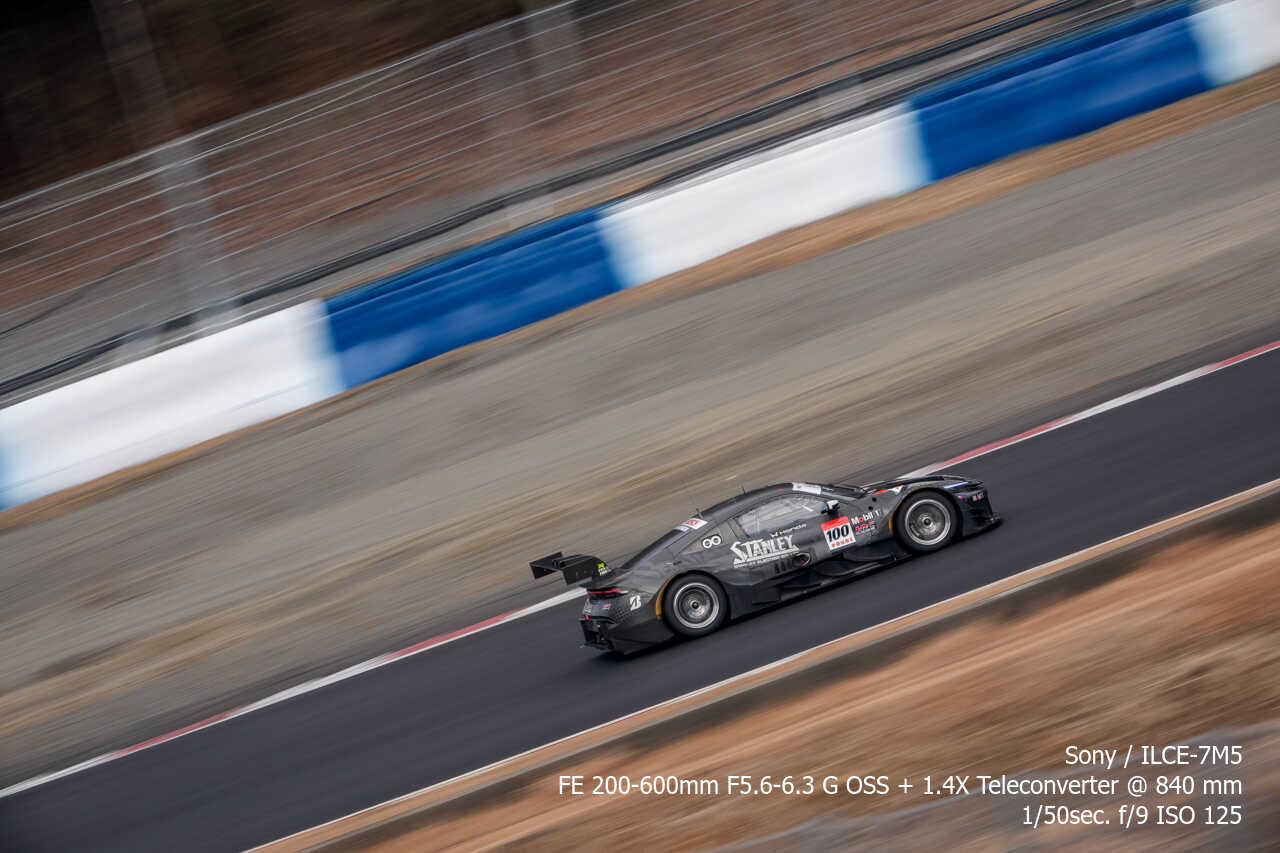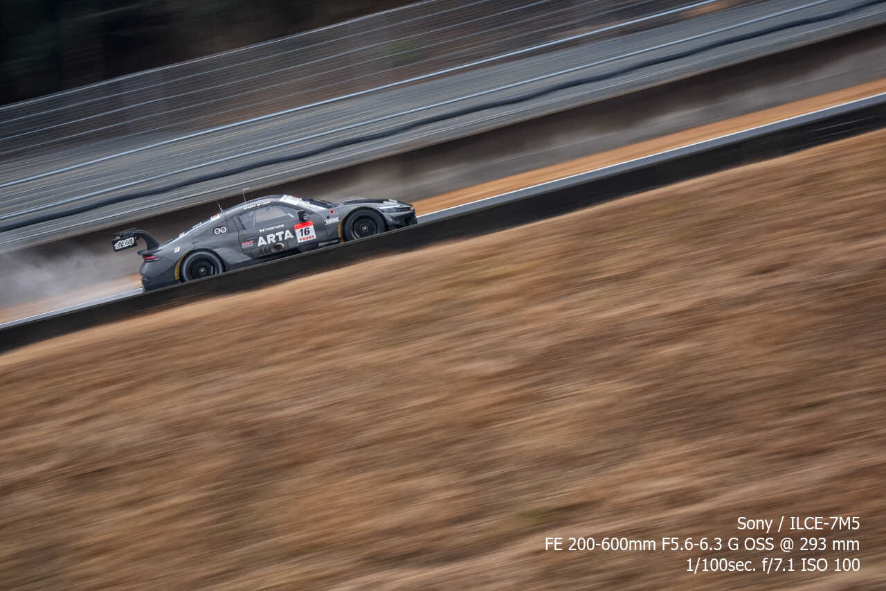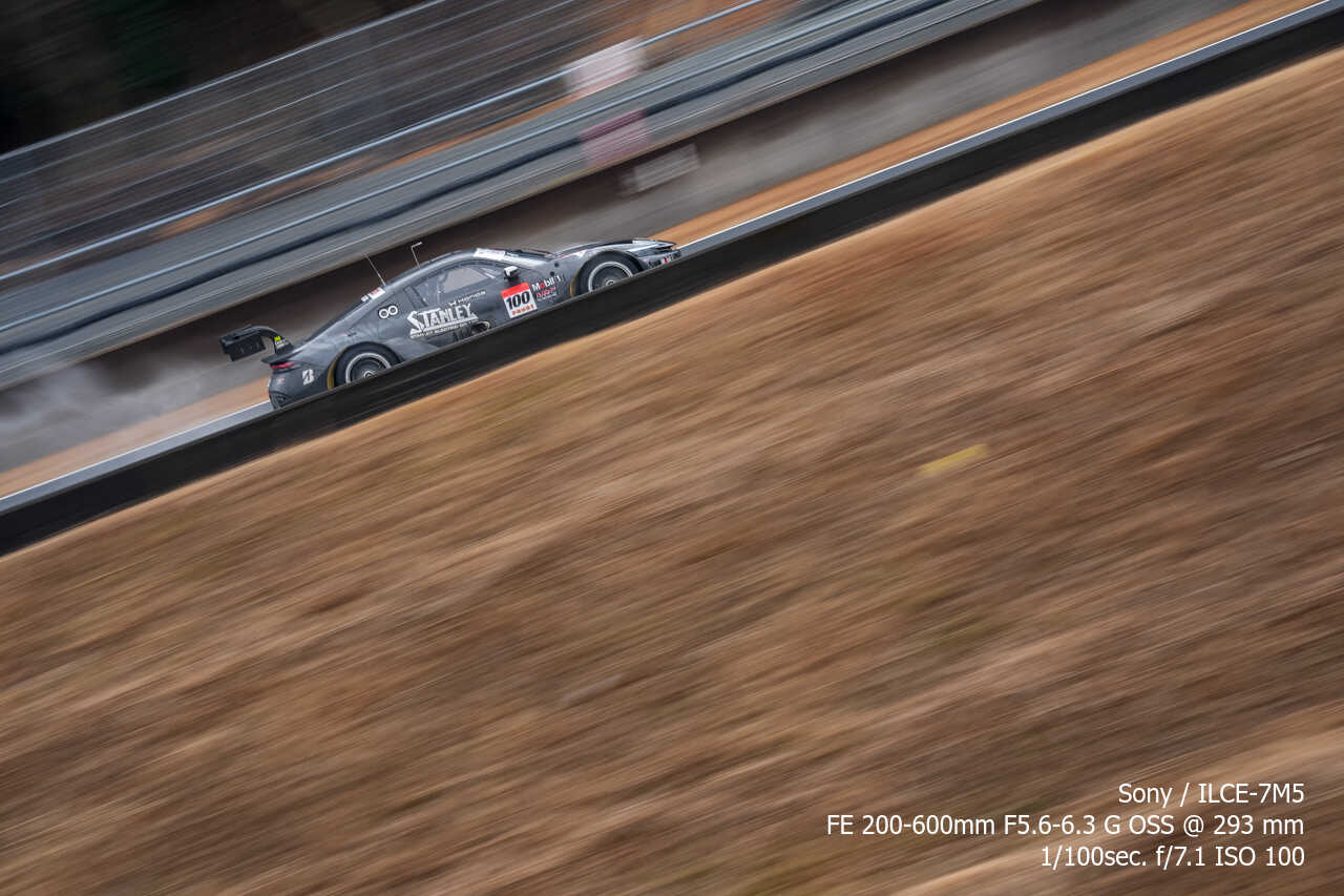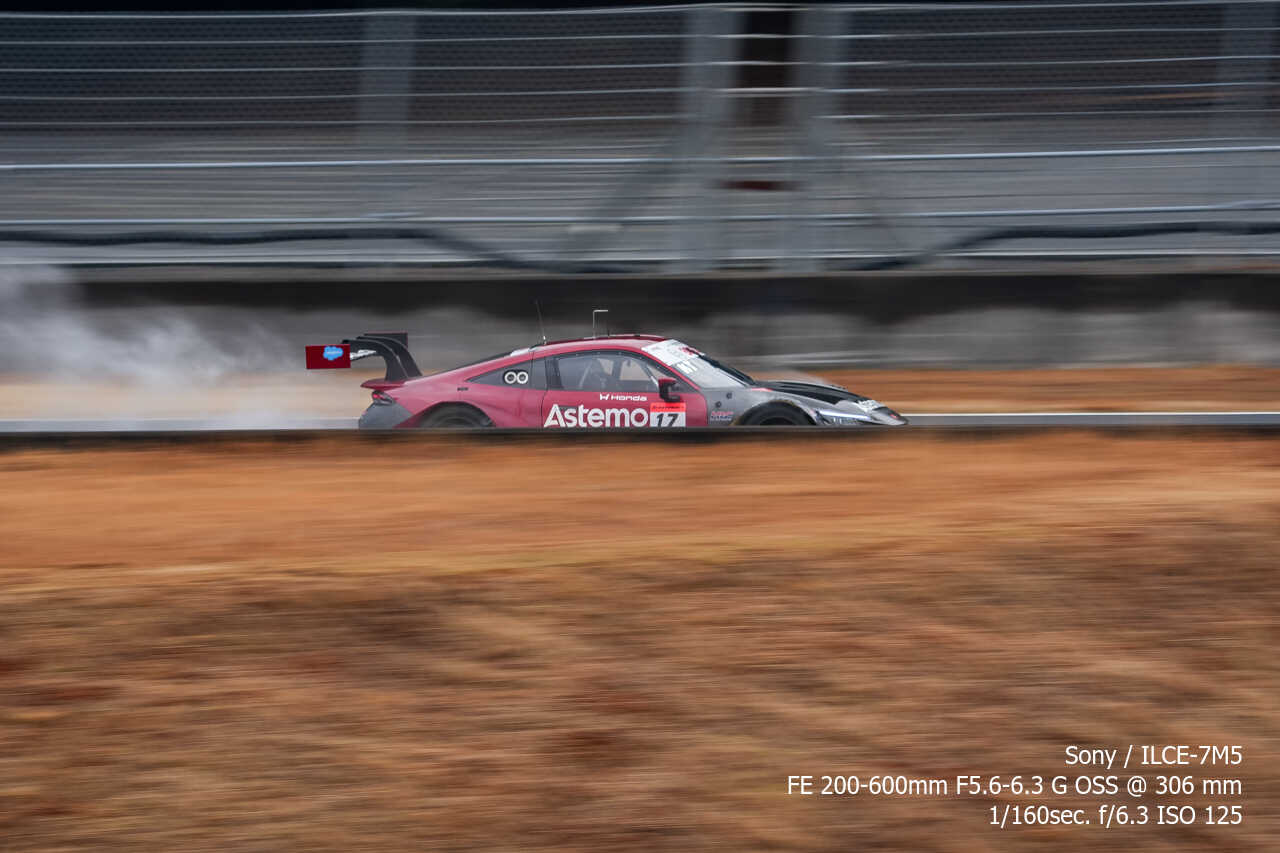 ただ、歪みの件は置いておいても、不思議なのは昼イチのアトウッド流しやCパドックからの1コーナー流しとかでもそうなんだけど、こういう望遠系の流し撮りが格段に狙いやすくなった印象があるんだよな。手ぶれ補正はオフのままだから協調手ブレ補正の恩恵とかではないはずなんだけど…。