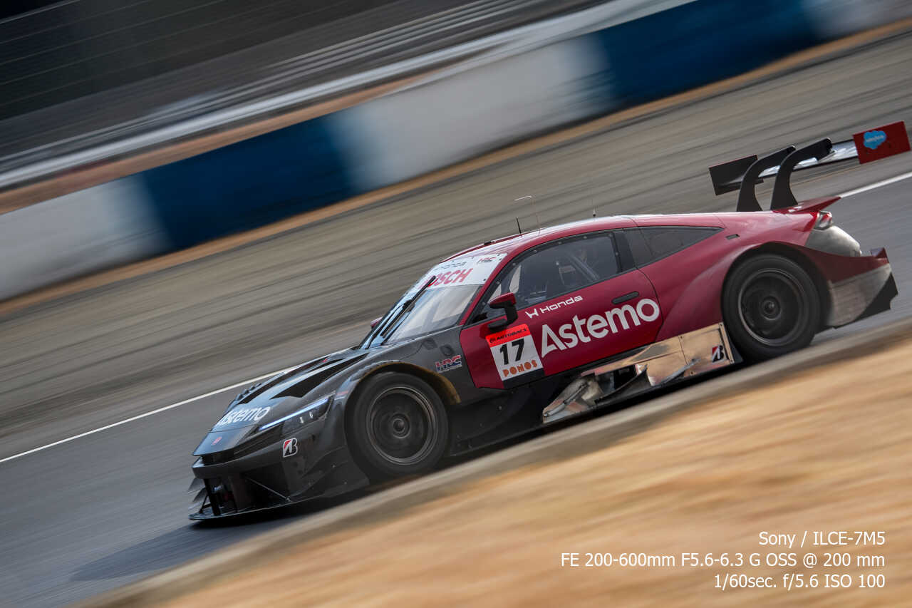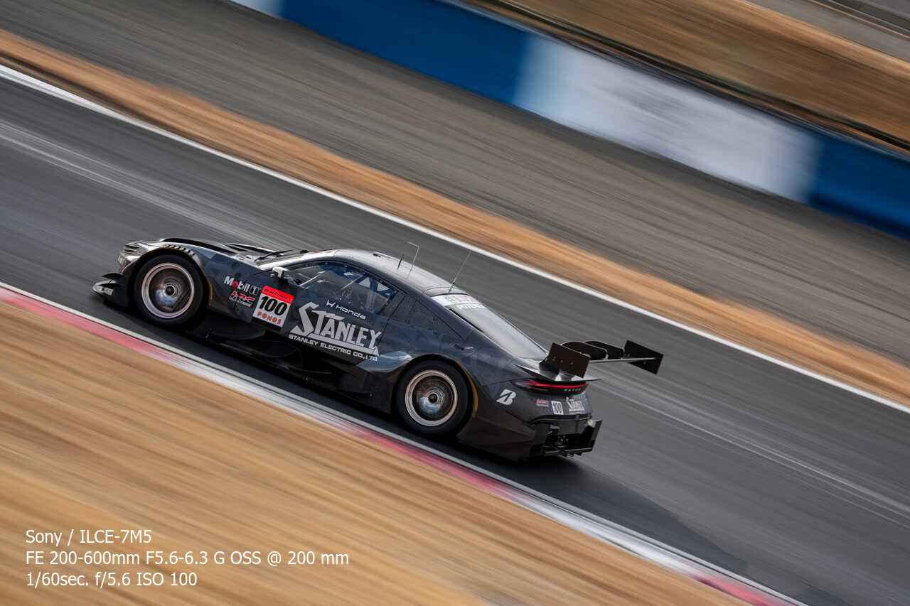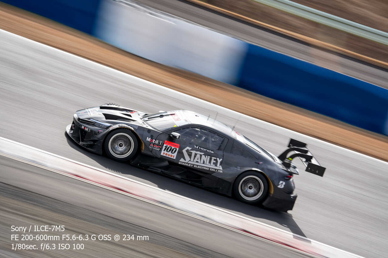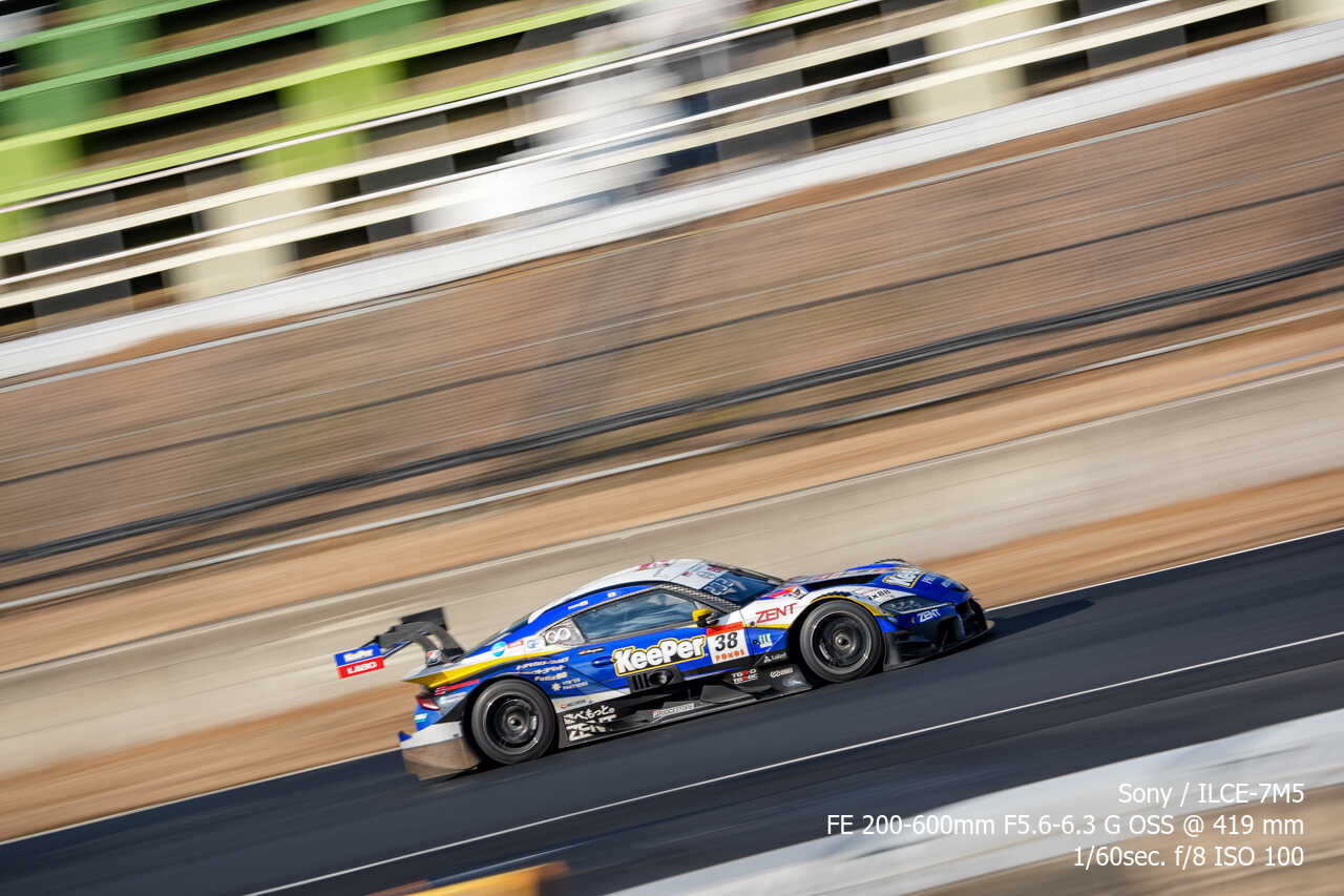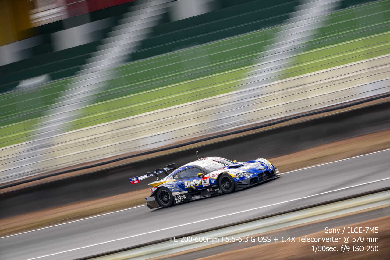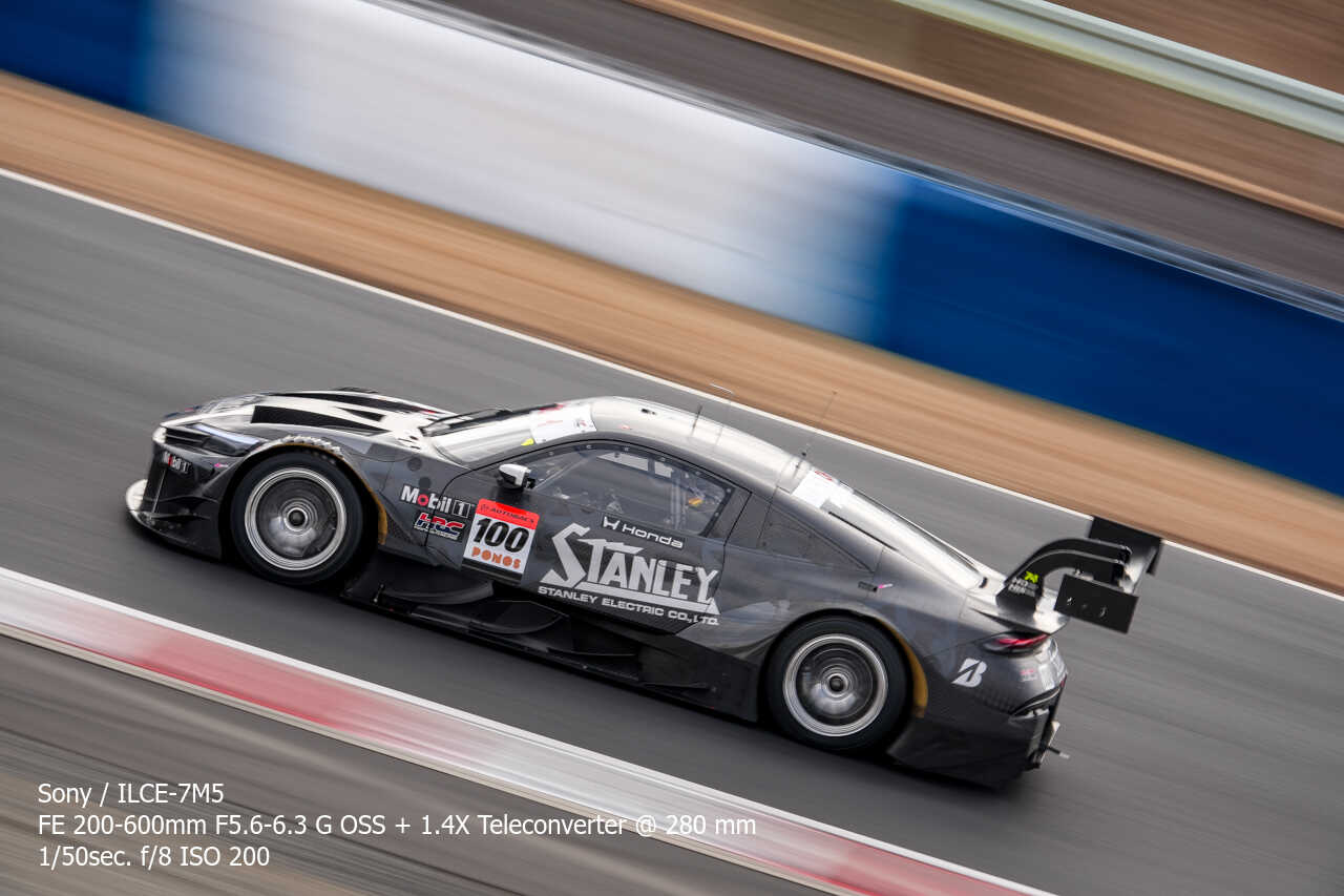 ただ、歪みの件は置いておいても、不思議なのは昼イチのアトウッド流しやCパドックからの1コーナー流しとかでもそうなんだけど、こういう望遠系の流し撮りが格段に狙いやすくなった印象があるんだよな。手ぶれ補正はオフのままだから協調手ブレ補正の恩恵とかではないはずなんだけど…。