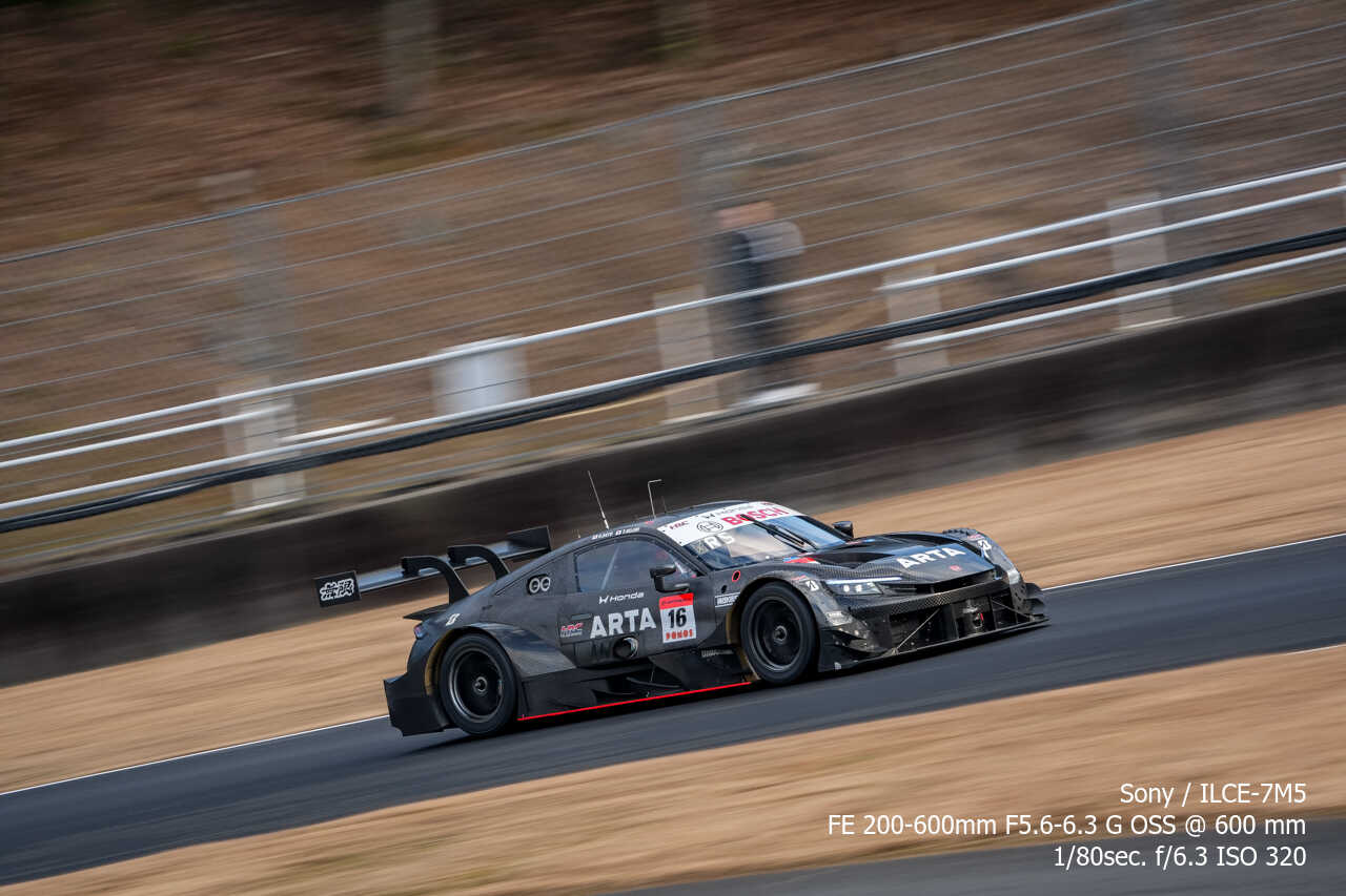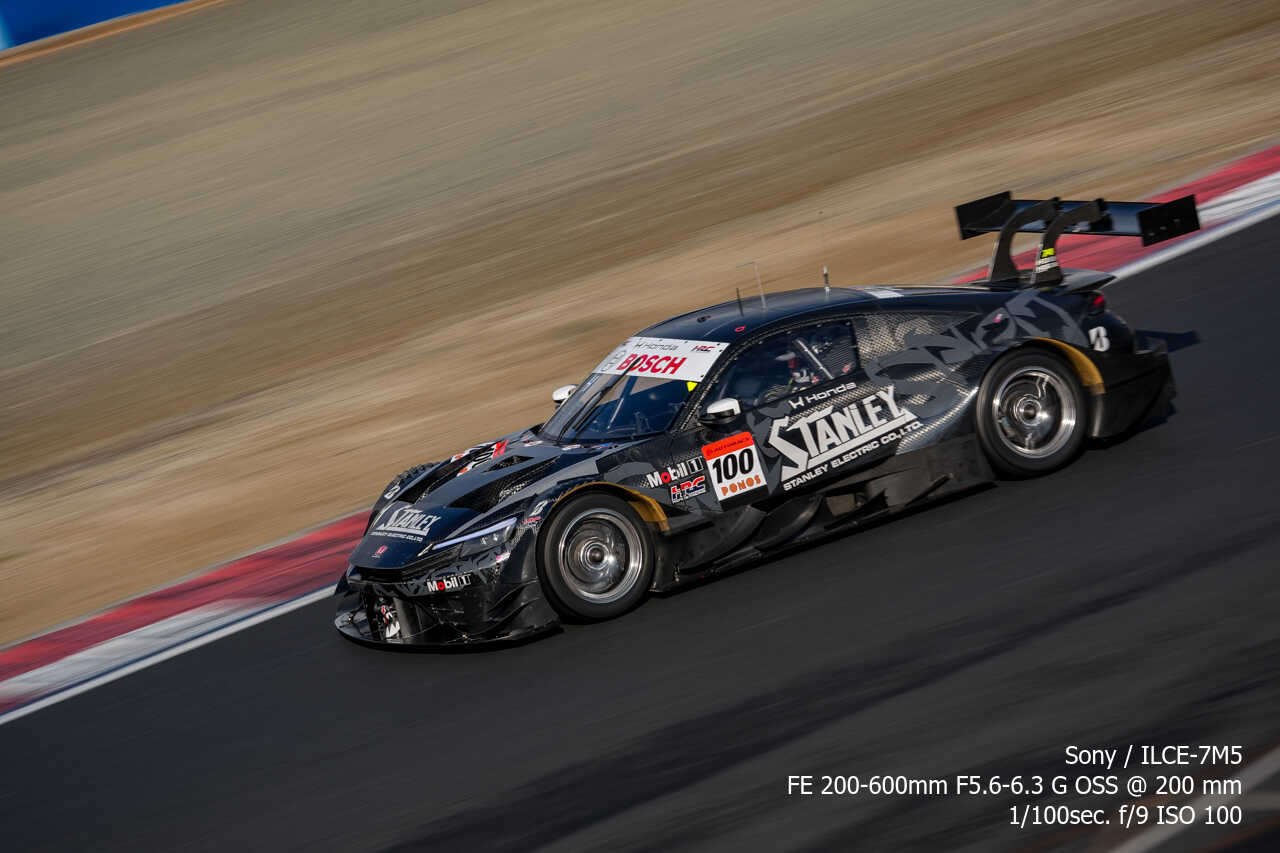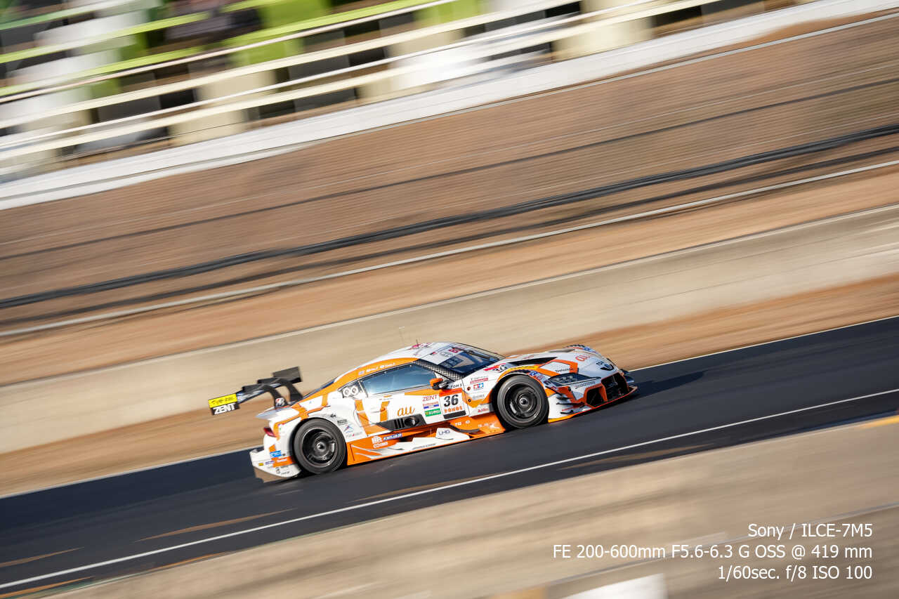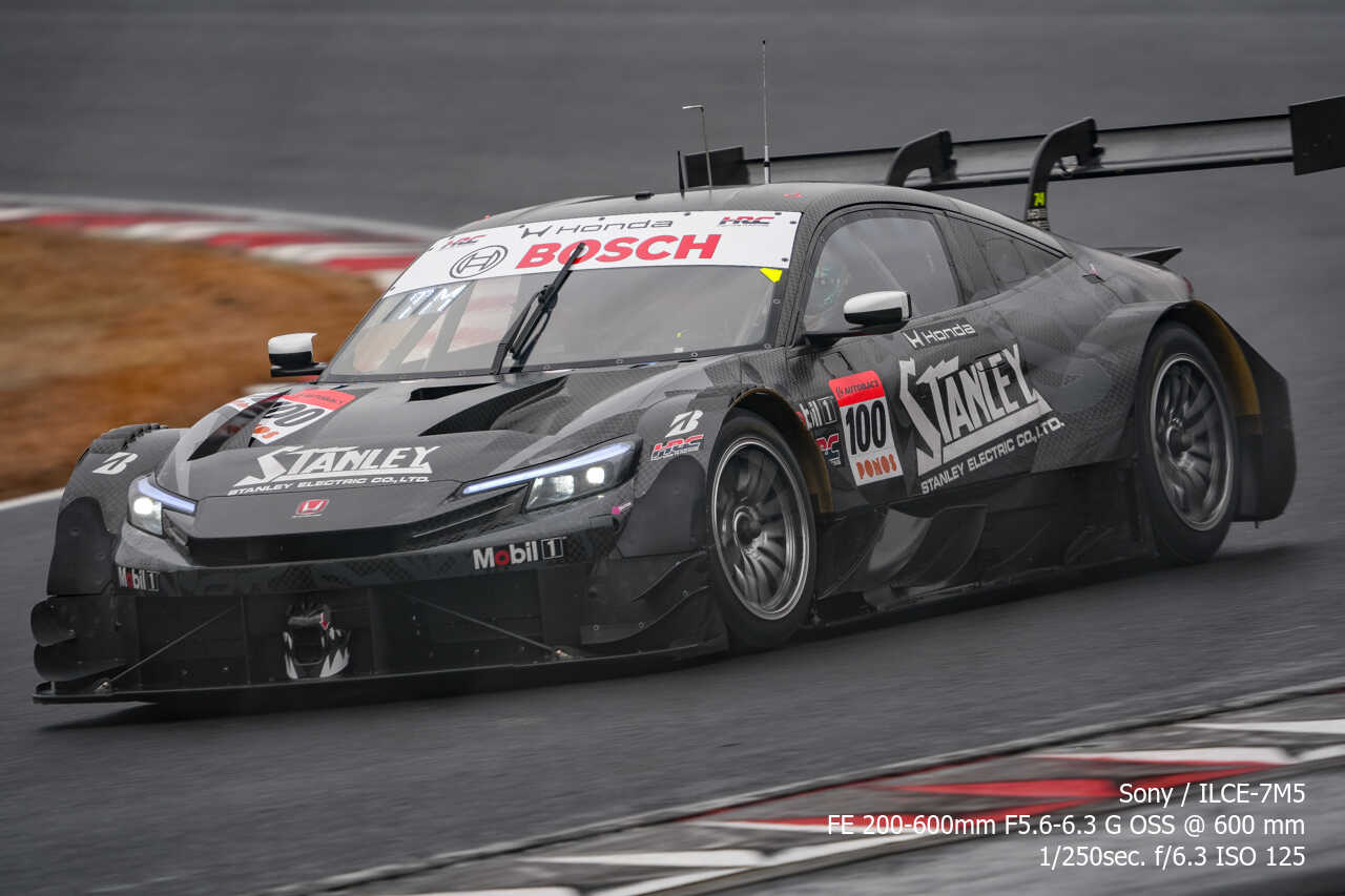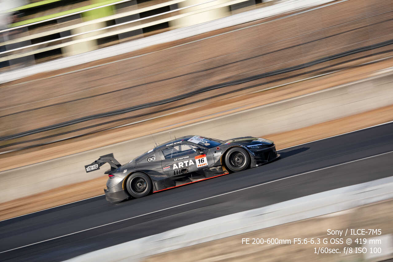 ただ、歪みの件は置いておいても、不思議なのは昼イチのアトウッド流しやCパドックからの1コーナー流しとかでもそうなんだけど、こういう望遠系の流し撮りが格段に狙いやすくなった印象があるんだよな。手ぶれ補正はオフのままだから協調手ブレ補正の恩恵とかではないはずなんだけど…。