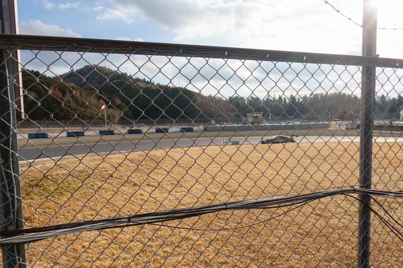 出来ればもう少し背景にコーナーの縁石を入れたいなと思って、もう1つ左側のフェンスへ(撮影窓Eのすぐ右隣のフェンス)。