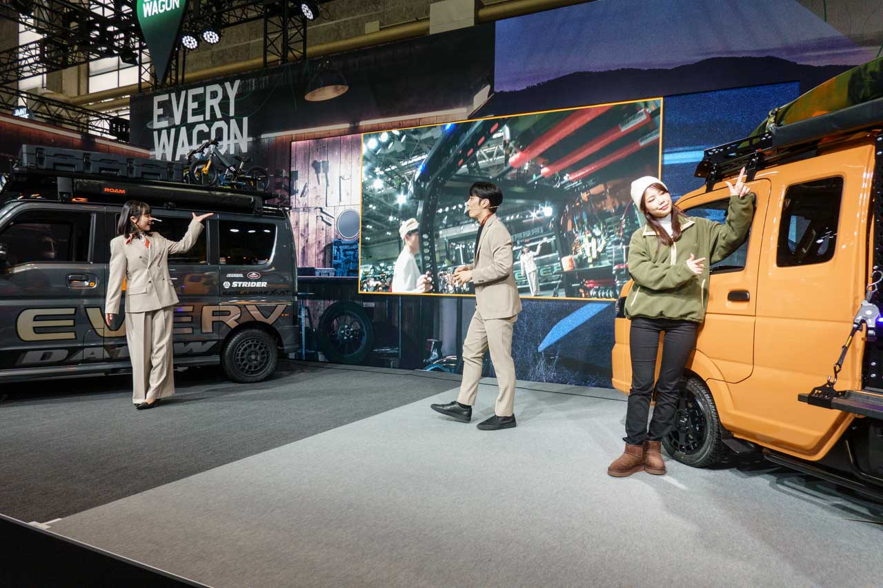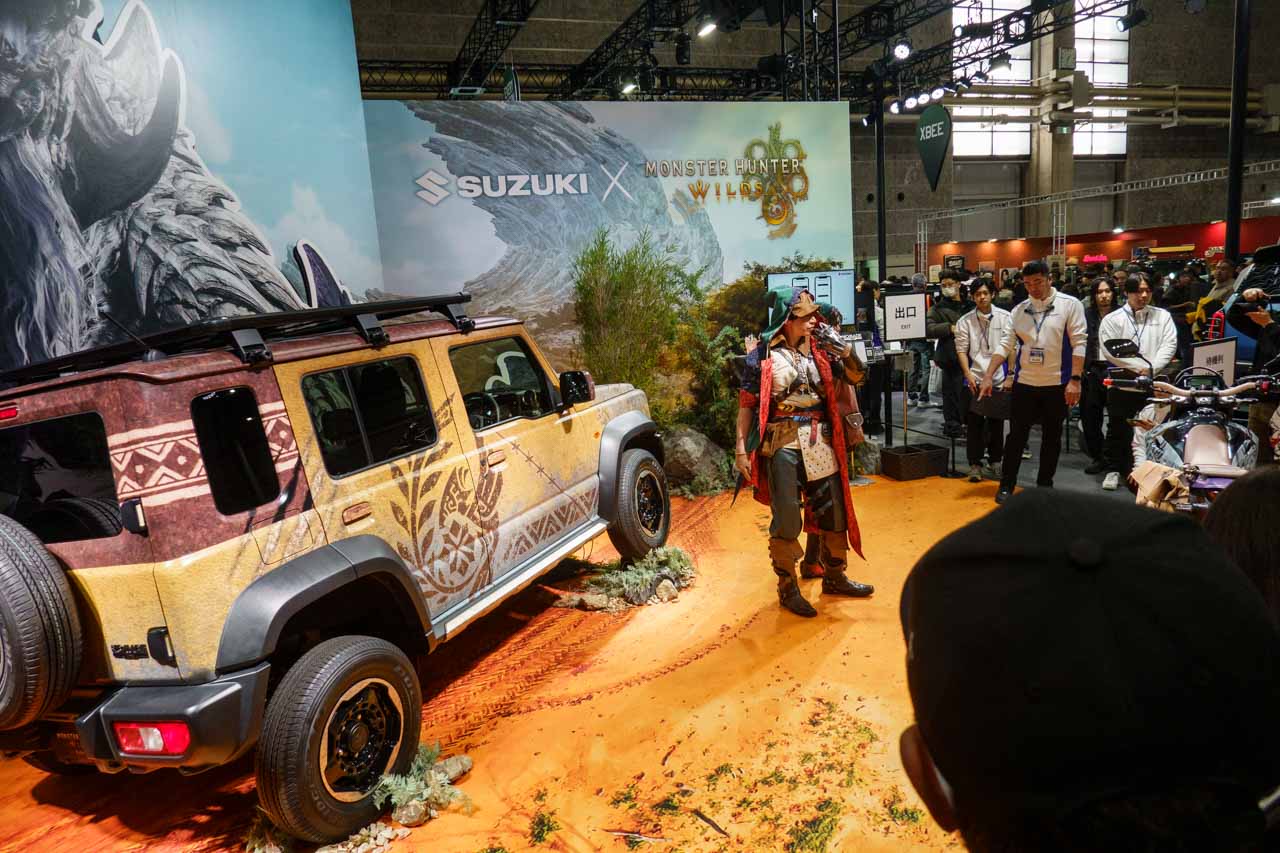で、スズキブースといえば、ステージタイムテーブルが公開されてそれを元に計画を立てる…というのが定番だったのですが、今年はタイムテーブルが掲示されておらず、結局、コンパニオンさんが出すSNSの情報を頼りに来ることに。東京オートサロンでも話題になっていたモンハンの企画、私にとっては元ネタが分からないから何とも…