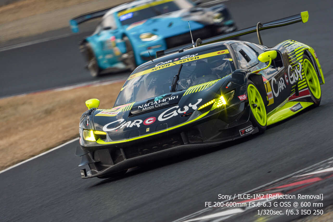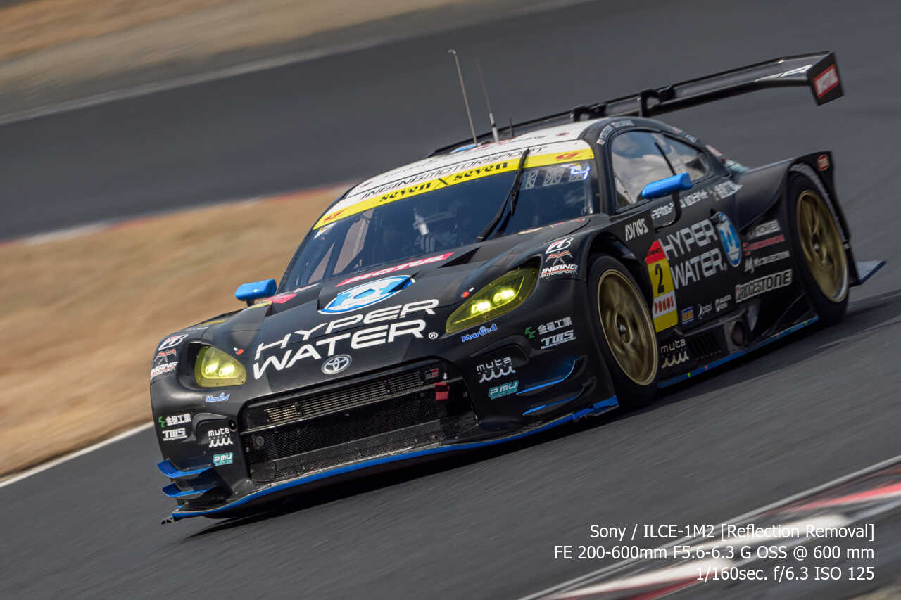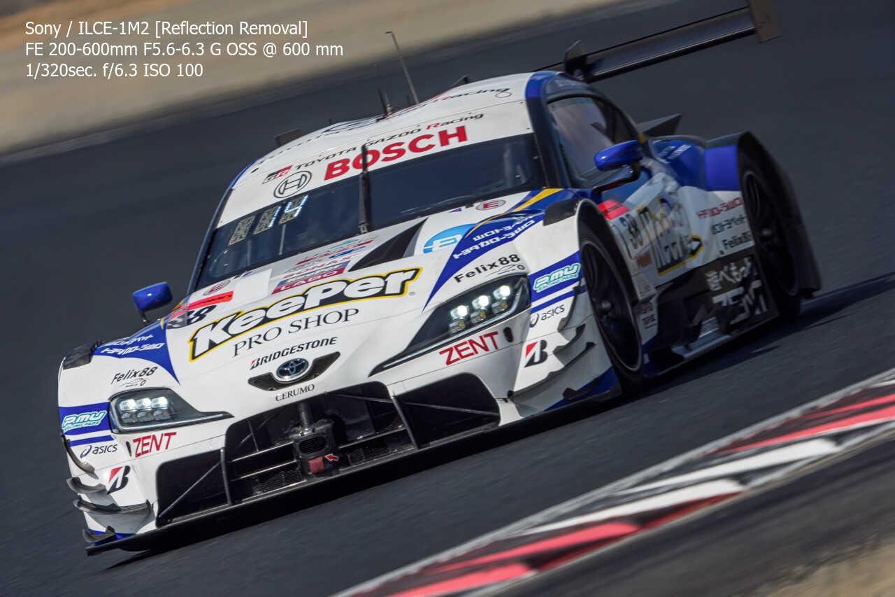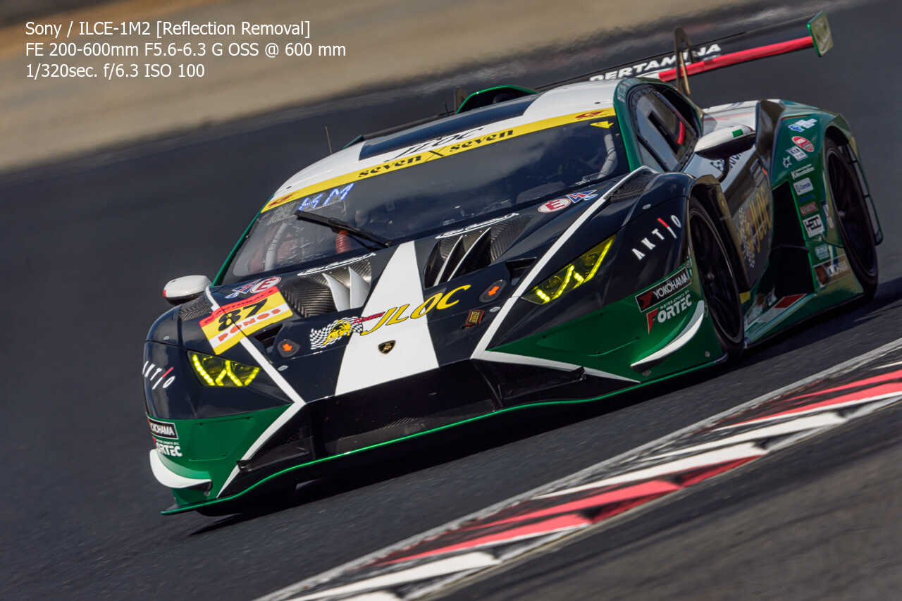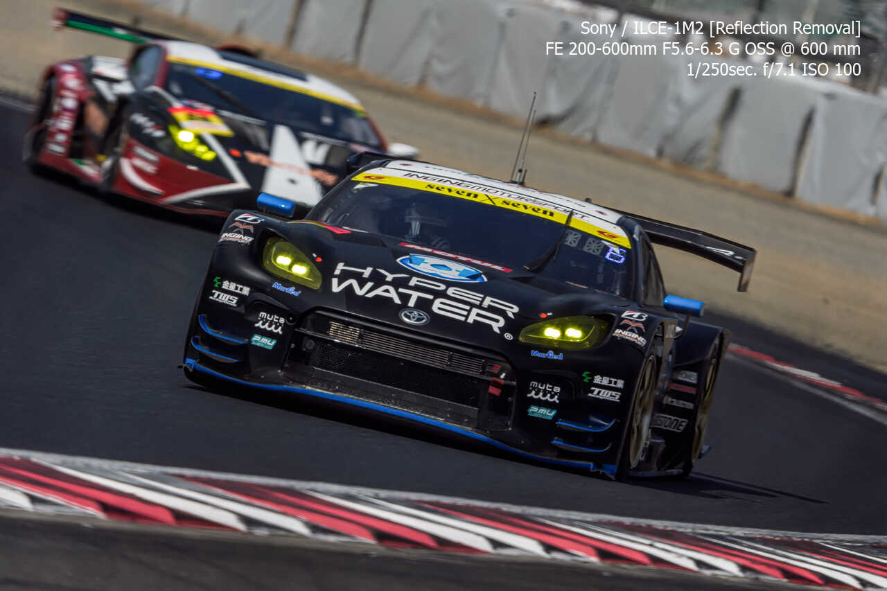 今度は、GT300のテスト2日目の総合順位トップ3をチョイス。左上げ構図だとどうしてもフェンス越し感が出て、やや不利なところもあるのですが、この3枚は反射の除去も使わずにこのクオリティ。むしろ、曇天なら曇天の方がここはフェンスはどうにかなるんだよな。