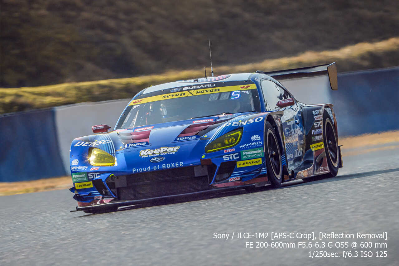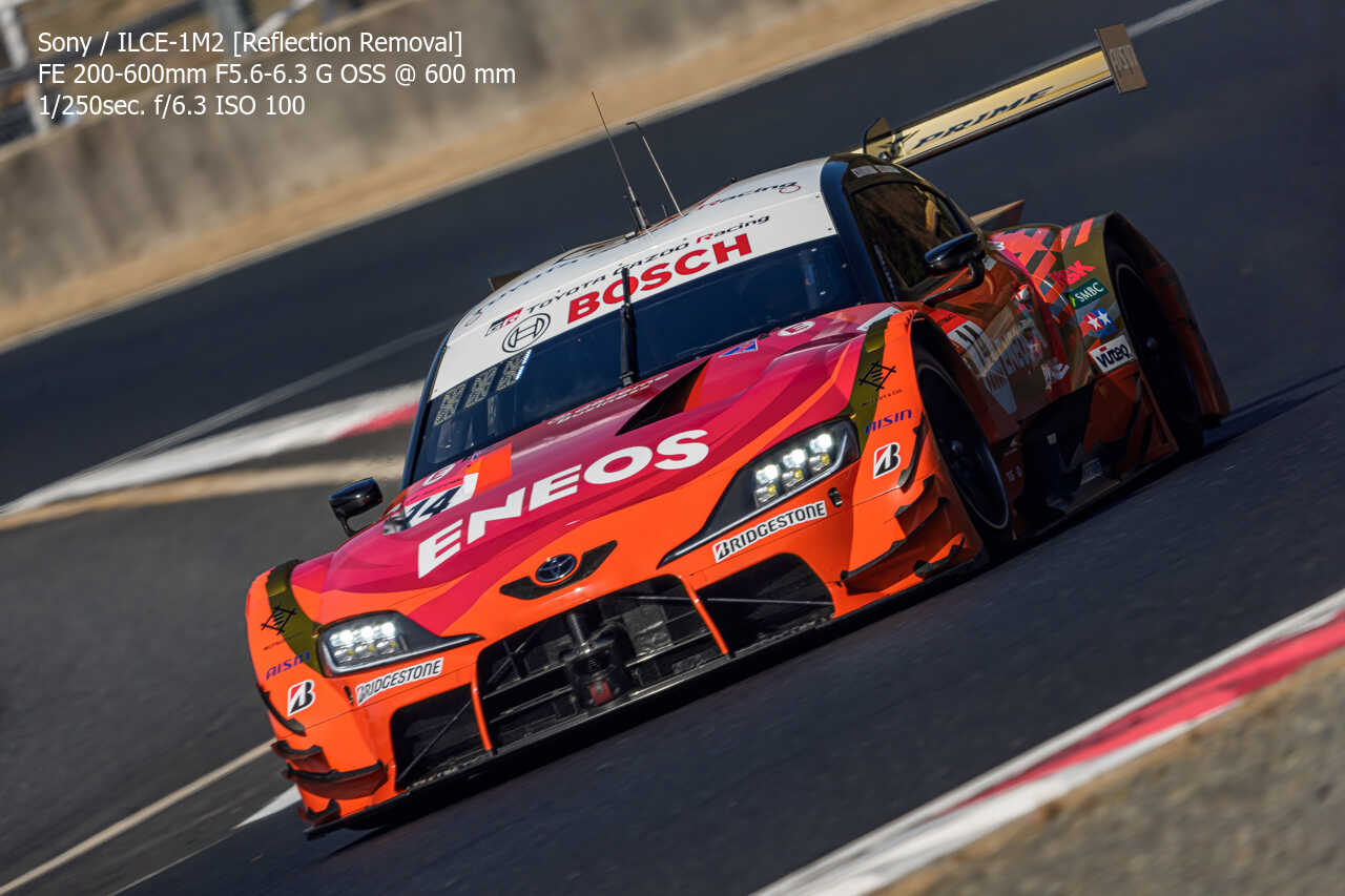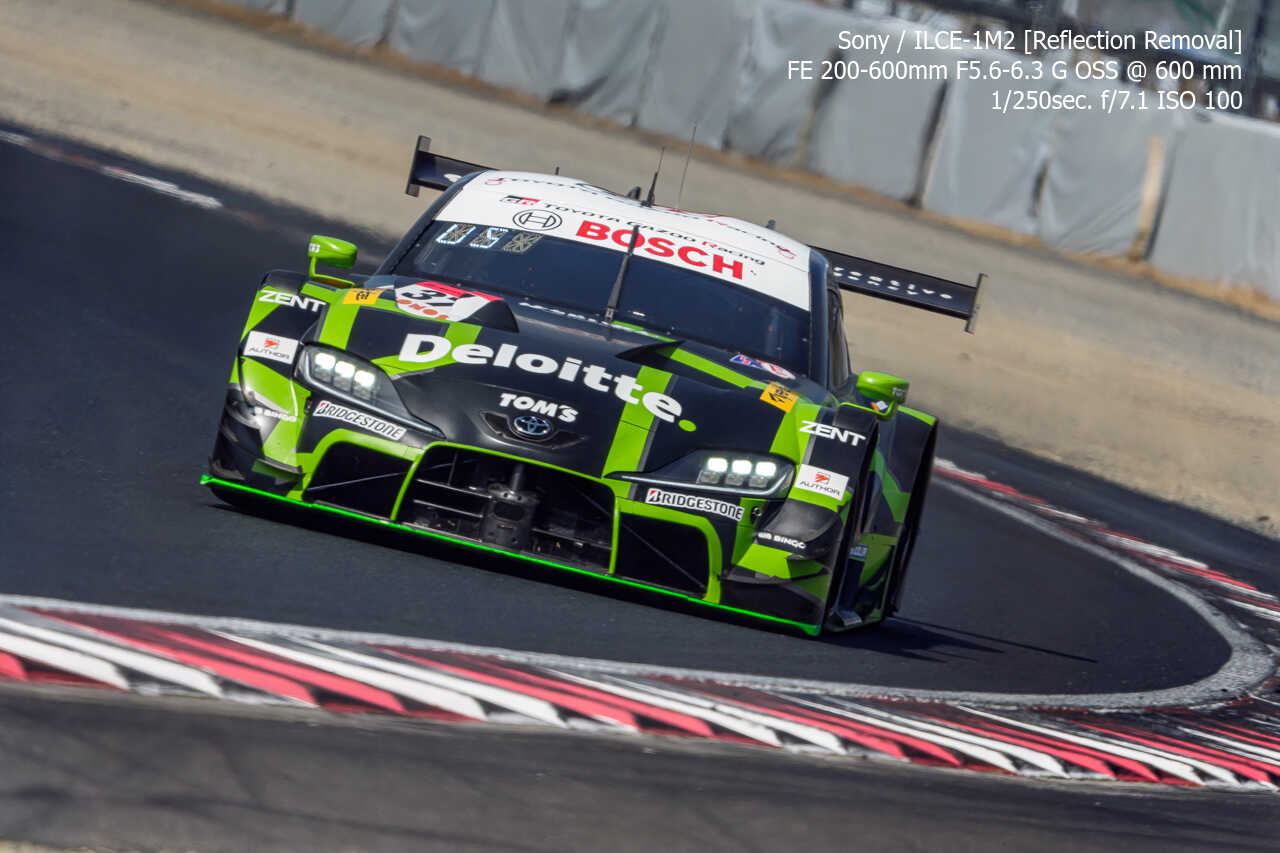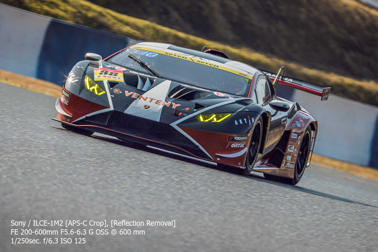 今度は、GT300のテスト2日目の総合順位トップ3をチョイス。左上げ構図だとどうしてもフェンス越し感が出て、やや不利なところもあるのですが、この3枚は反射の除去も使わずにこのクオリティ。むしろ、曇天なら曇天の方がここはフェンスはどうにかなるんだよな。