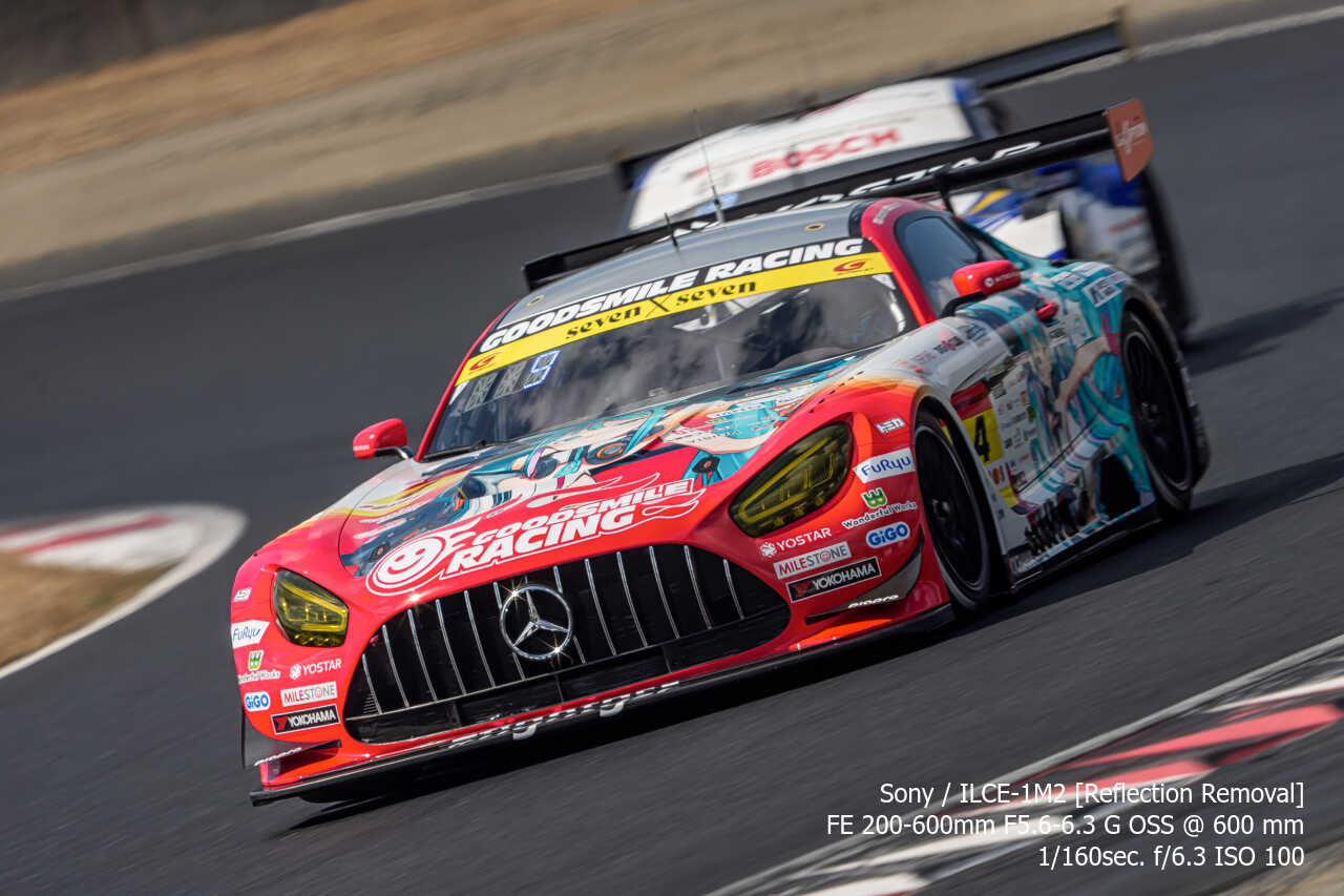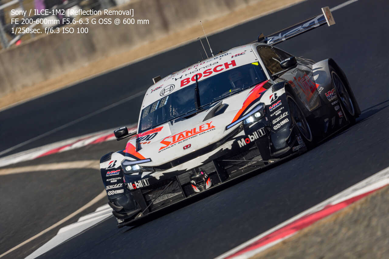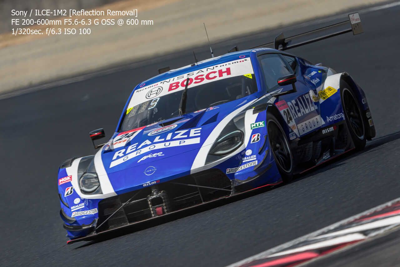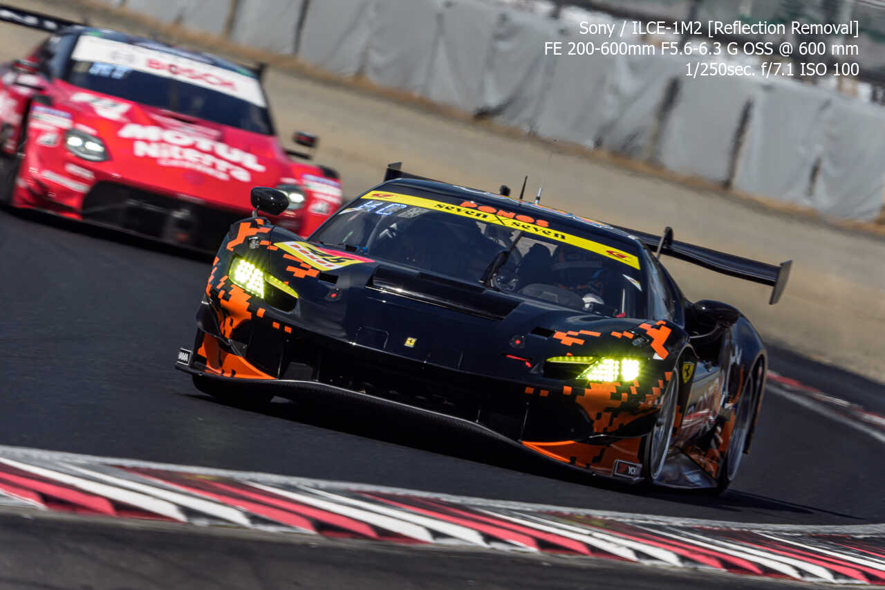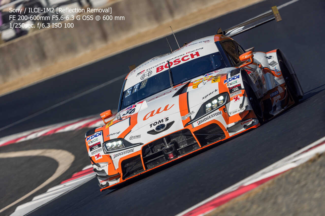 今度は、GT300のテスト2日目の総合順位トップ3をチョイス。左上げ構図だとどうしてもフェンス越し感が出て、やや不利なところもあるのですが、この3枚は反射の除去も使わずにこのクオリティ。むしろ、曇天なら曇天の方がここはフェンスはどうにかなるんだよな。