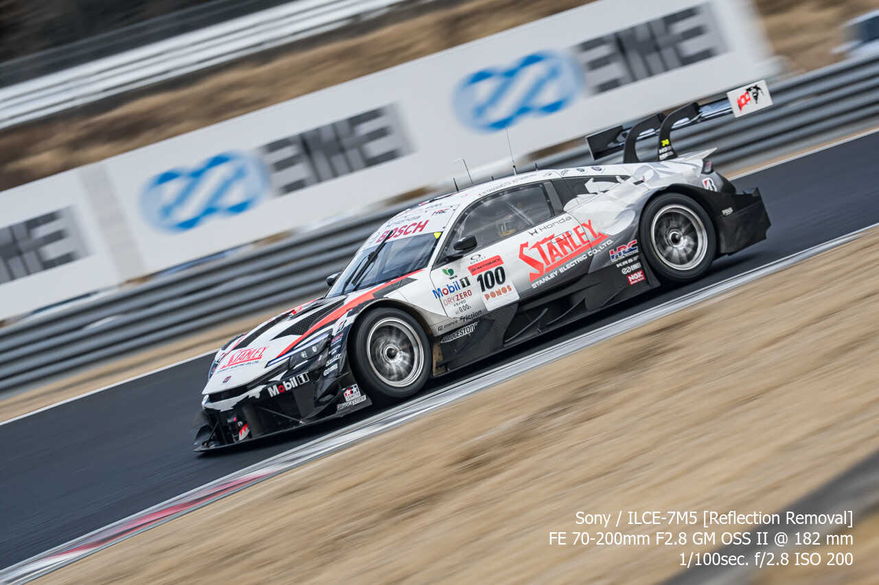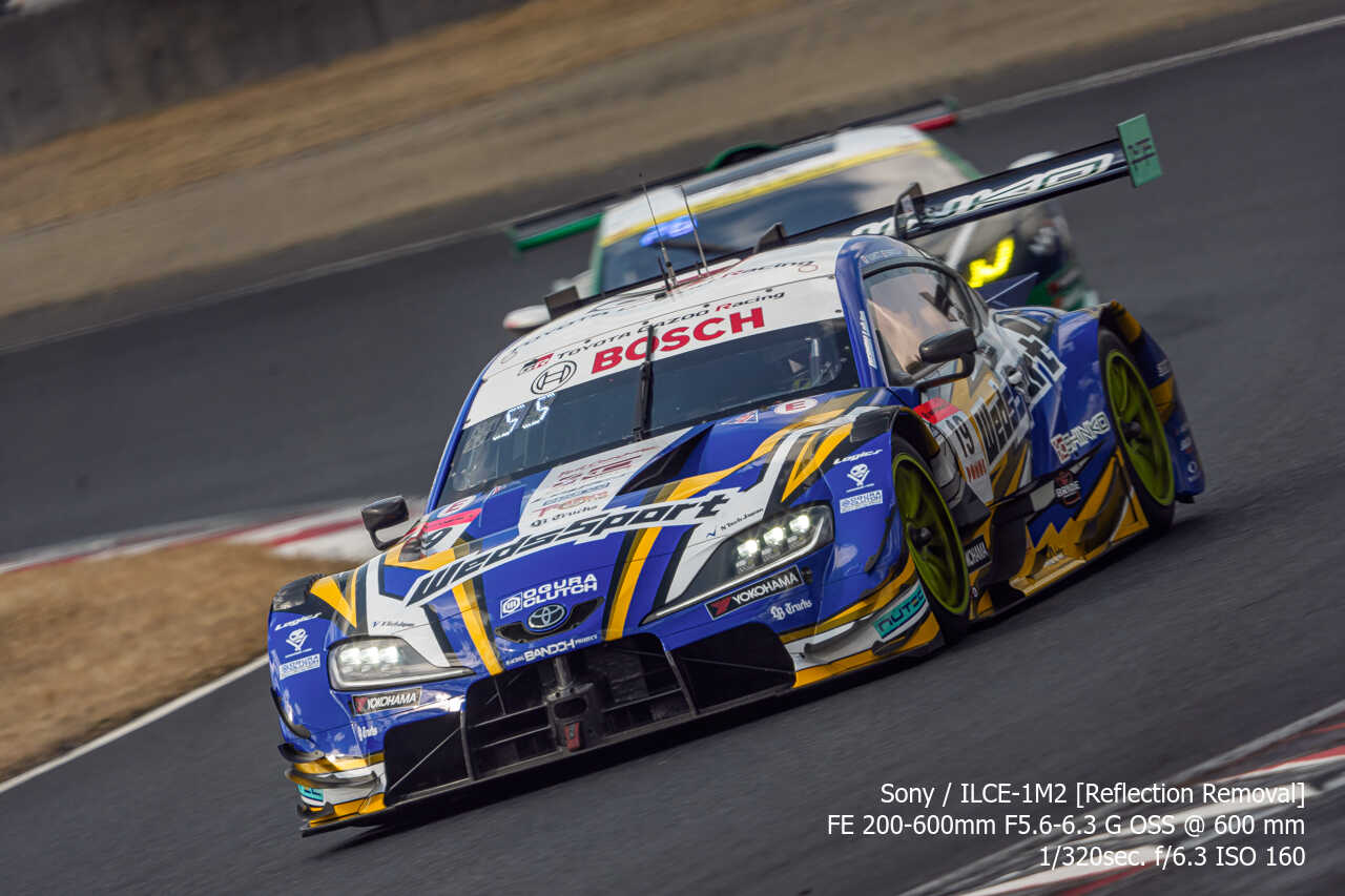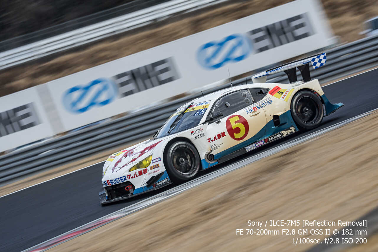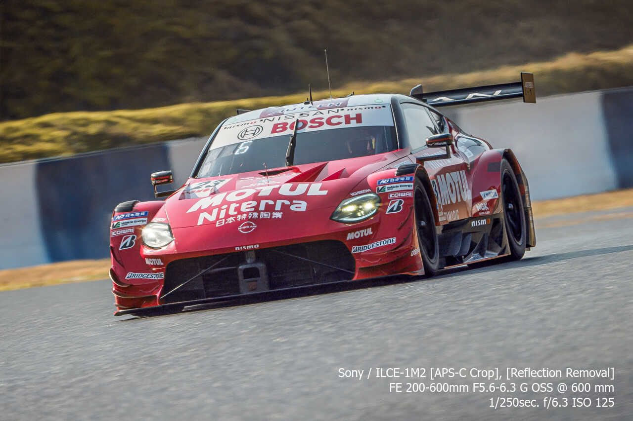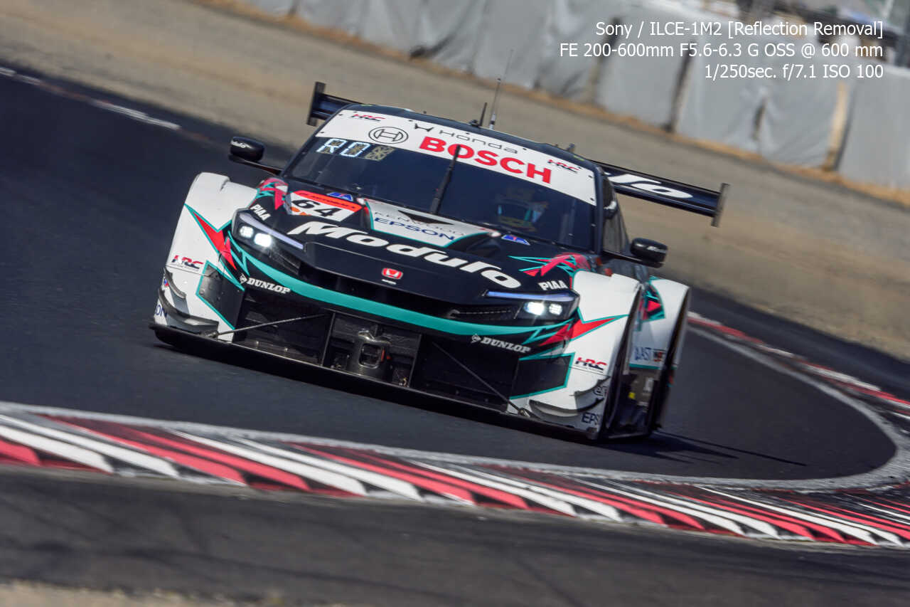 今度は、GT300のテスト2日目の総合順位トップ3をチョイス。左上げ構図だとどうしてもフェンス越し感が出て、やや不利なところもあるのですが、この3枚は反射の除去も使わずにこのクオリティ。むしろ、曇天なら曇天の方がここはフェンスはどうにかなるんだよな。
