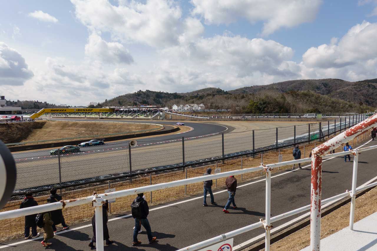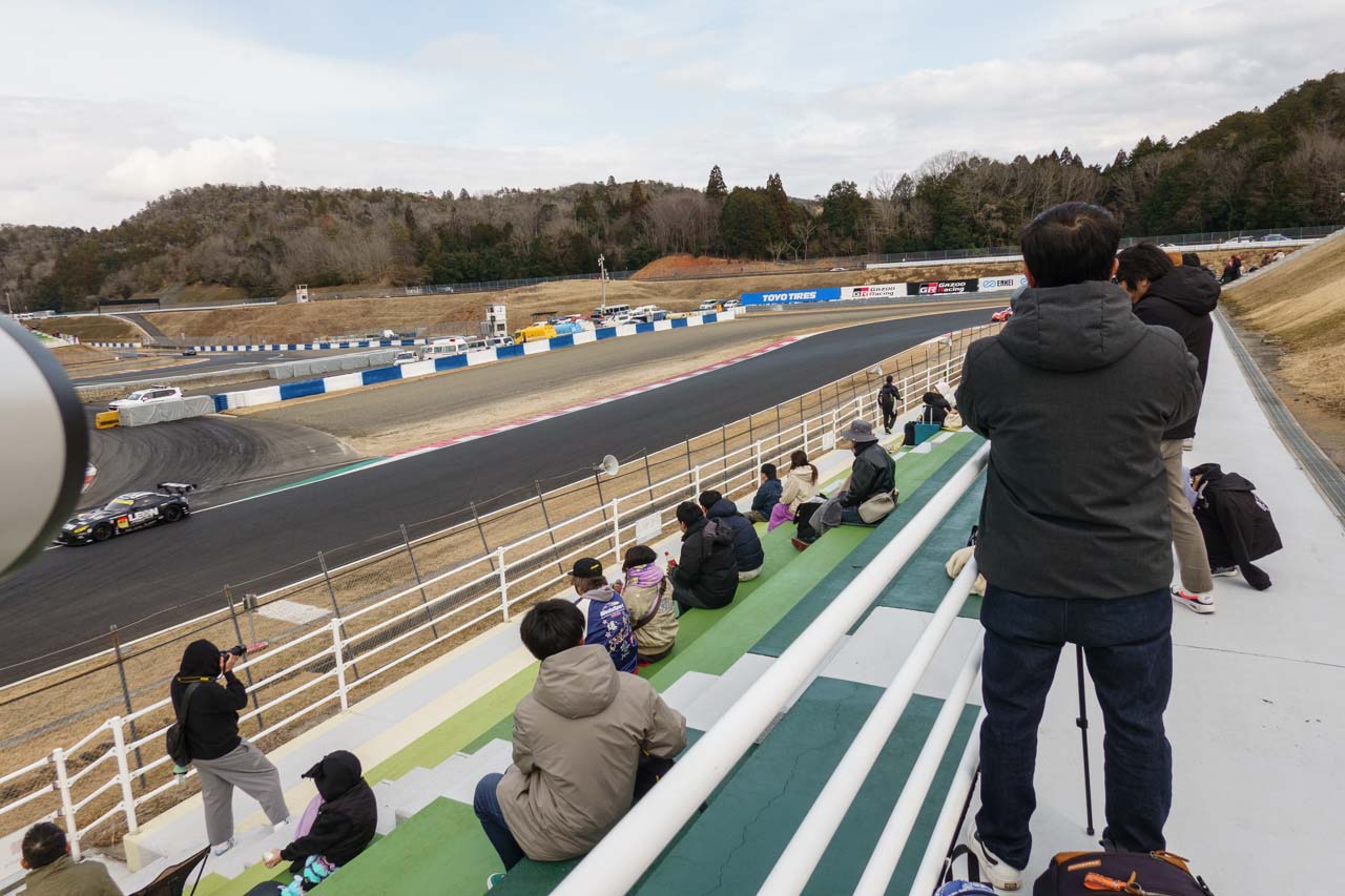 この辺りも先日のGT500メーカーテストのおさらいみたいな感じだったけど、特に今回はやけにこの辺りのカメラマンが多かて、撮影場所の確保に困るほどビッシリだった。ただ、そうはいってもくれぐれも座席の位置で立って撮影するのはやめましょうね。