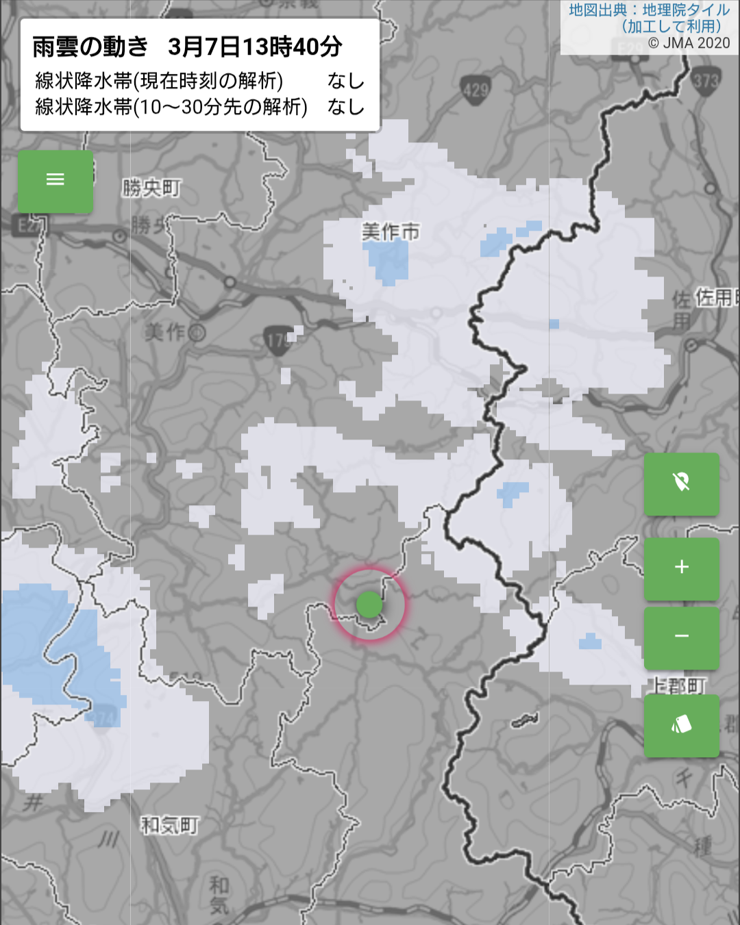 ようやく繋がってレーダーを見たら、案の定、雨雲が接近してきてる!。今回、一様、カメラのレインカバーはバッグ内に入れていたけど、ポンチョとかは車の中だからな…。